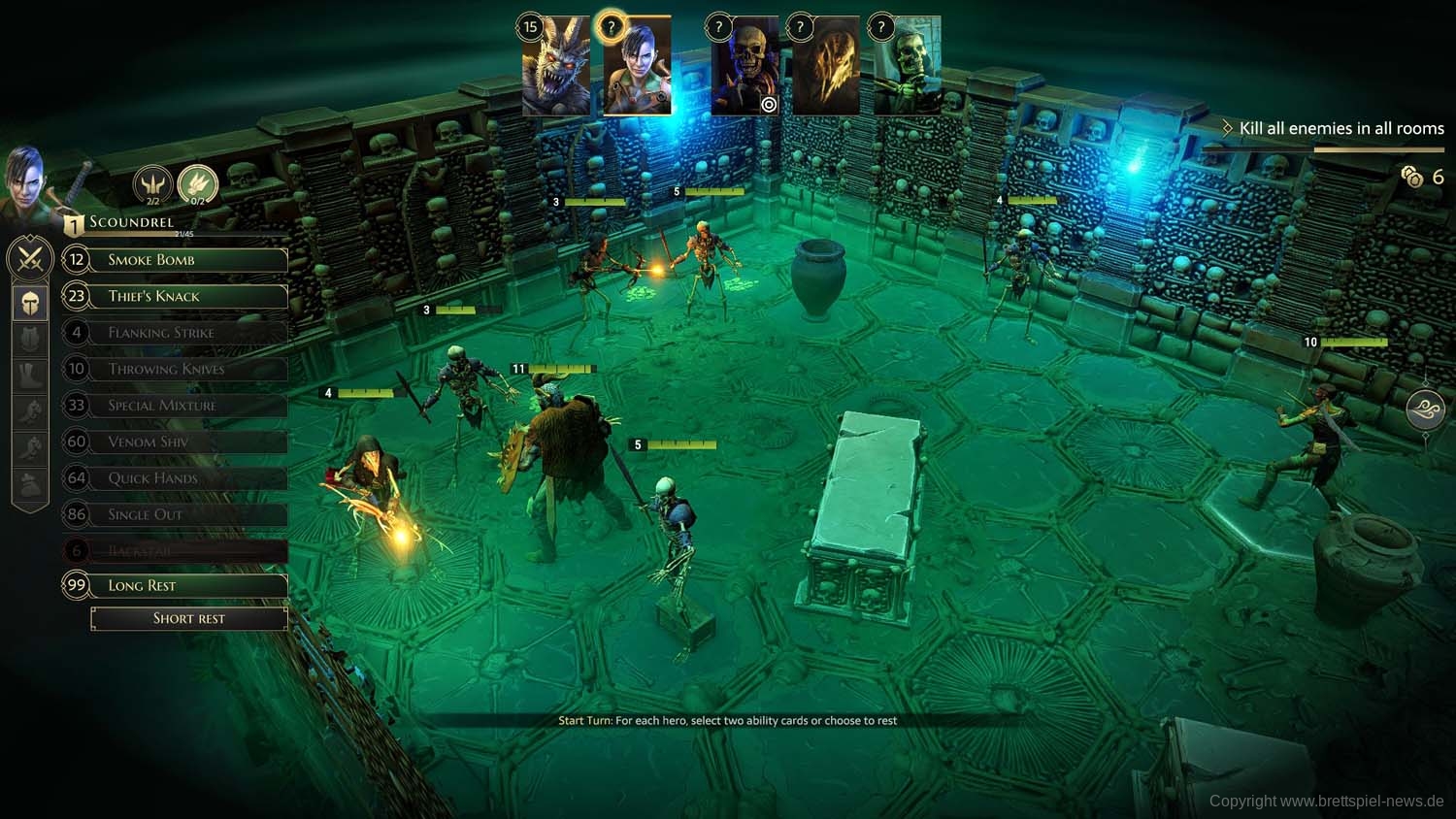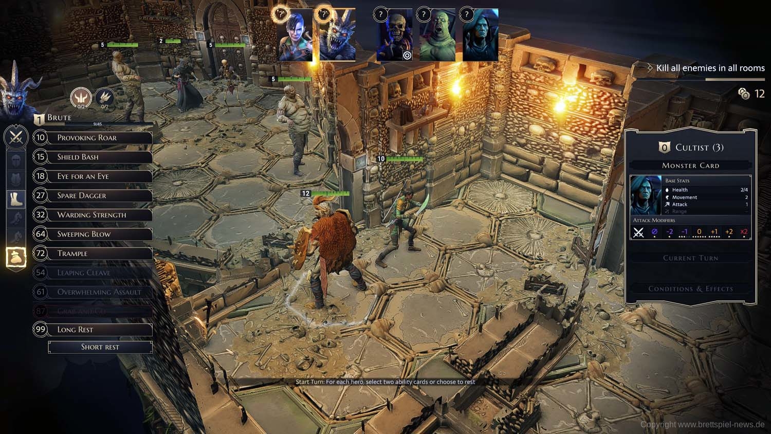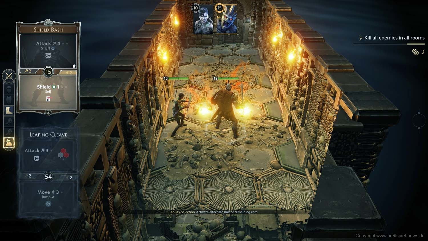 Angekommen im Dungeon können die Helden auf die möglichen Startfelder positioniert werden, während die Gegner bereits ungeduldig auf ihren Positionen mit den Waffen scharren. Anschließend geht es damit los, dass für beide Helden die Aktionskarten für die Runde ausgewählt werden. Dabei gilt es wie gewohnt, dass jeweils eine obere und eine untere Aktion der Karten für den Zug zur Verfügung stehen und dass die Initiativzahl in der Mitte die Zugreihenfolge festlegt.