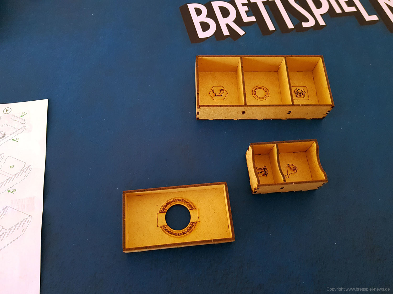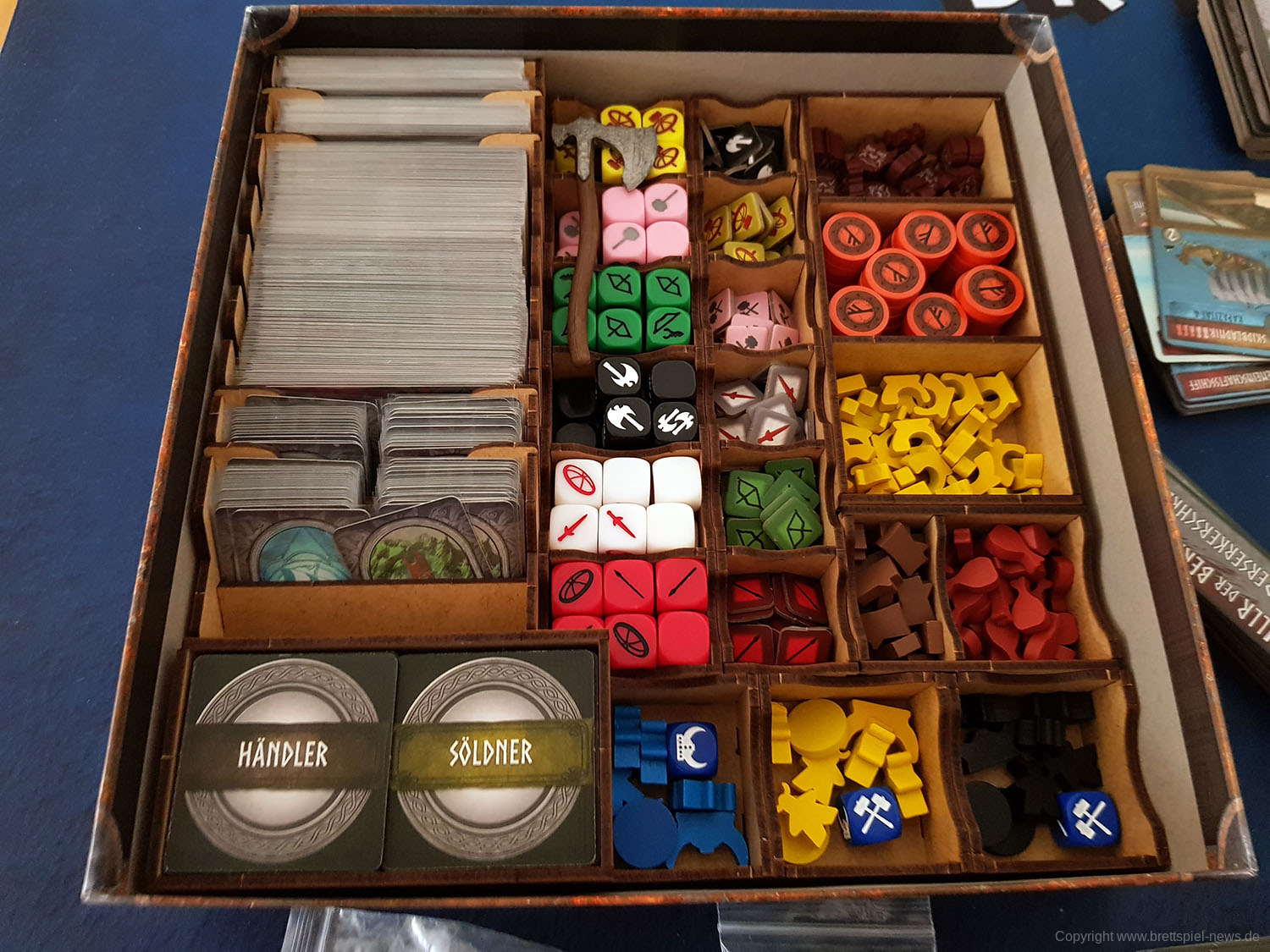 Insgesamt bin ich mit meinem Inlay ziemlich zufrieden. Der Auf- und Abbau sollten nun deutlich schneller vonstatten gehen, das komplette Spielmaterial (inklusive eines eigenen Startspielermarkers, einer Plastik-Axt) passt hervorragend. Inklusive beider Erweiterungen, mitsamt zusätzlicher Spielbretter und Anleitungen. Allerdings ohne Neoprenmatten, auf diesen Luxus habe ich dann doch verzichtet.