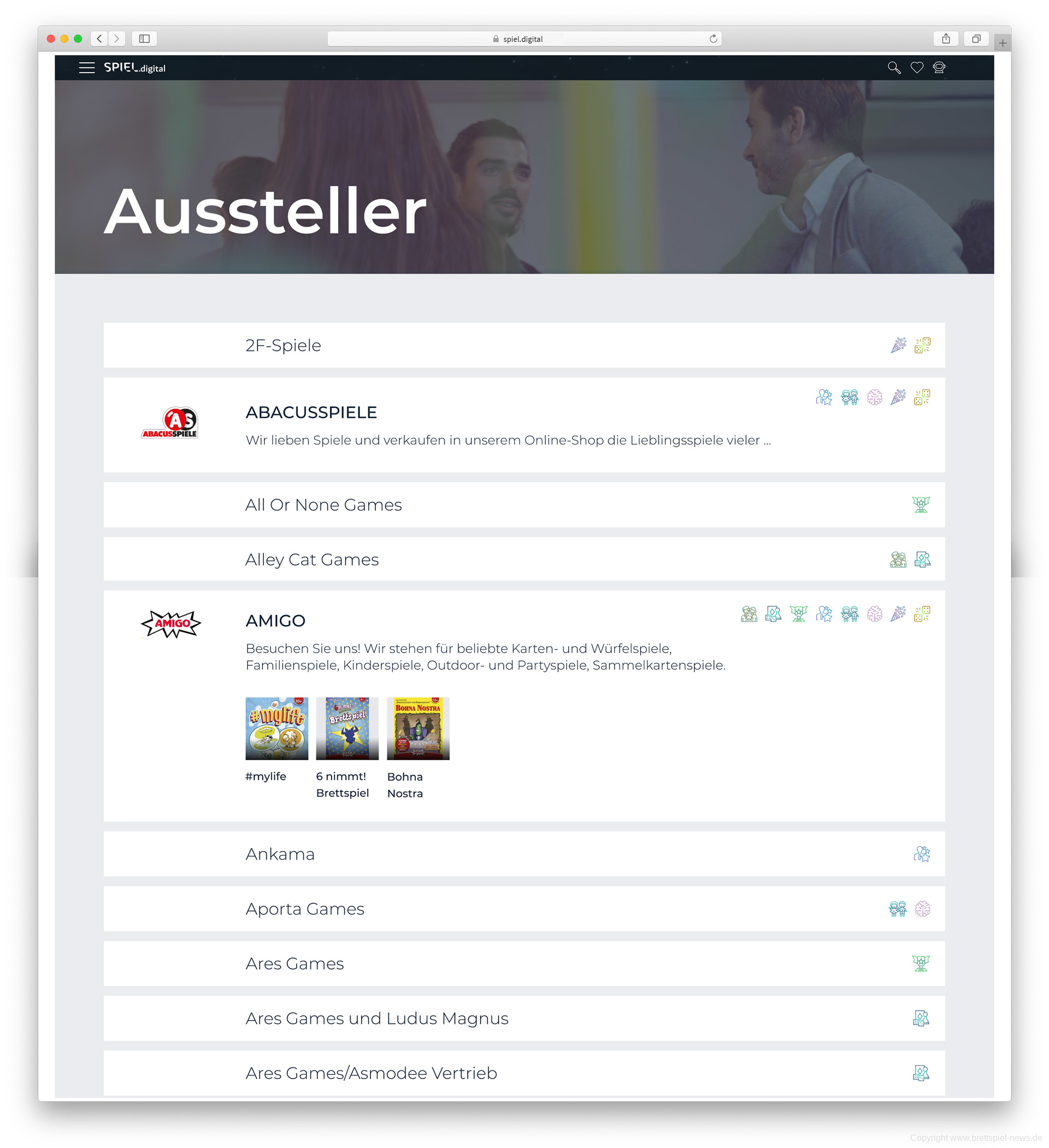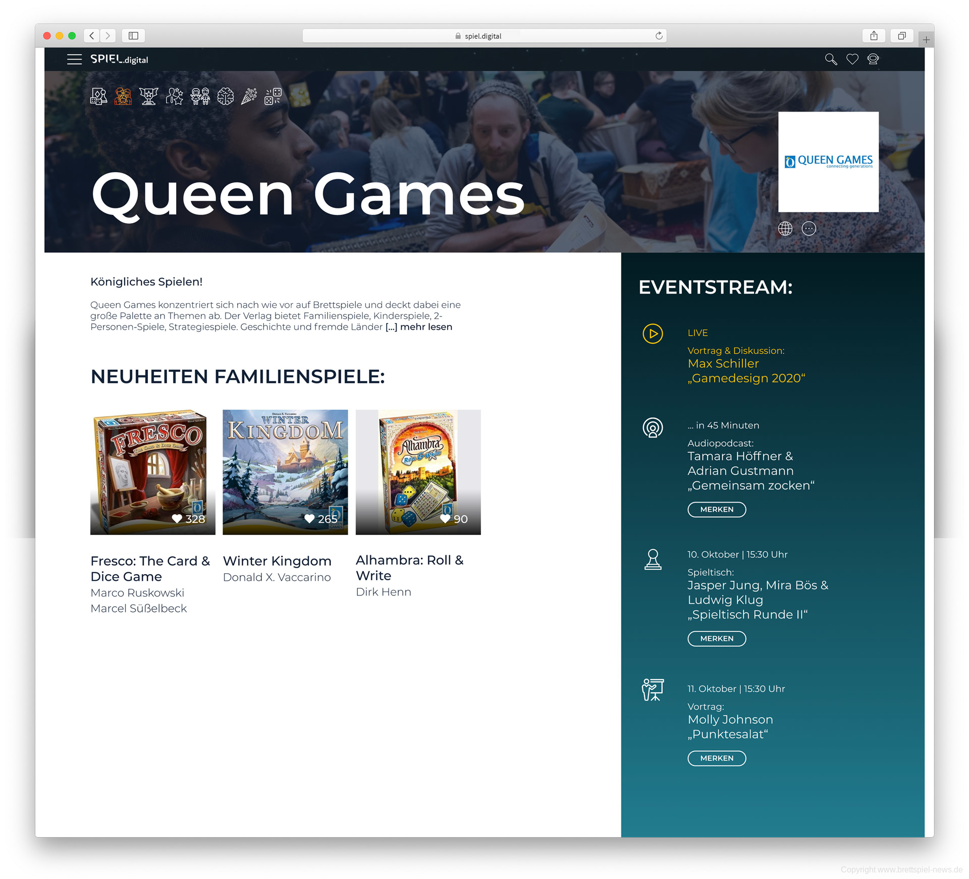 Jeder beteiligter Verlag erhält innerhalb der SPIEL.digital eine Übersicht, in der dann die Neuheiten gesammelt angezeigt werden. Darüber hinaus werden Live-Events angeteasert.