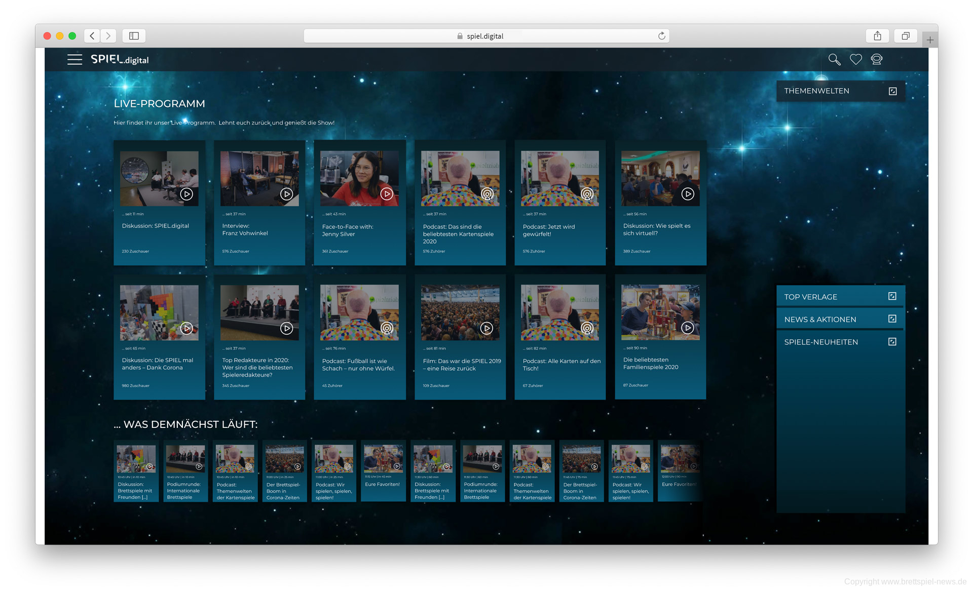 Unter https://www.spiel.digital werden alle Angebote der Veranstaltung zentral abrufbar sein. Dort werden die Inhalte nach Inhaltstyp geordnet angeboten. Alles hat eine Weltraumoptik und auf einer Übersicht sind dann verschiedene Themen-Welten zu sehen. Wird eine angeklickt ploppt eine seitlich rotierende Übersicht heraus.