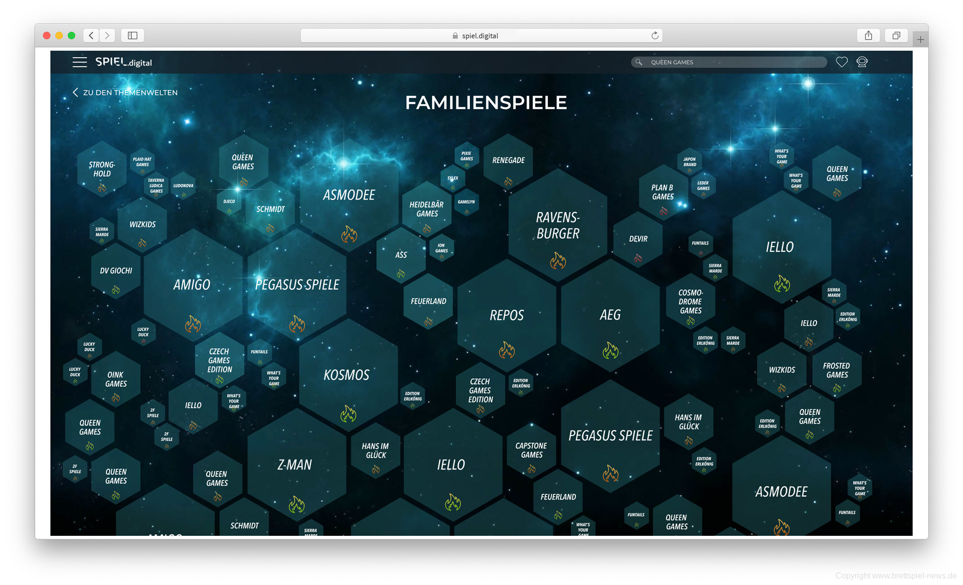 Es wird auch eine Such-Übersicht geben, die ein wenig an Messestände erinnert. Diese sind unterschiedlich groß und werden aus Sechsecken gebildet. Was die Größe der Sechsecke aussagt wissen wir noch nicht, eventuell zeigt es an, in welchem Bereich (im Bild zum Beispiel Familienspiele) welcher Verlag wie viele Neuheiten anbietet.
