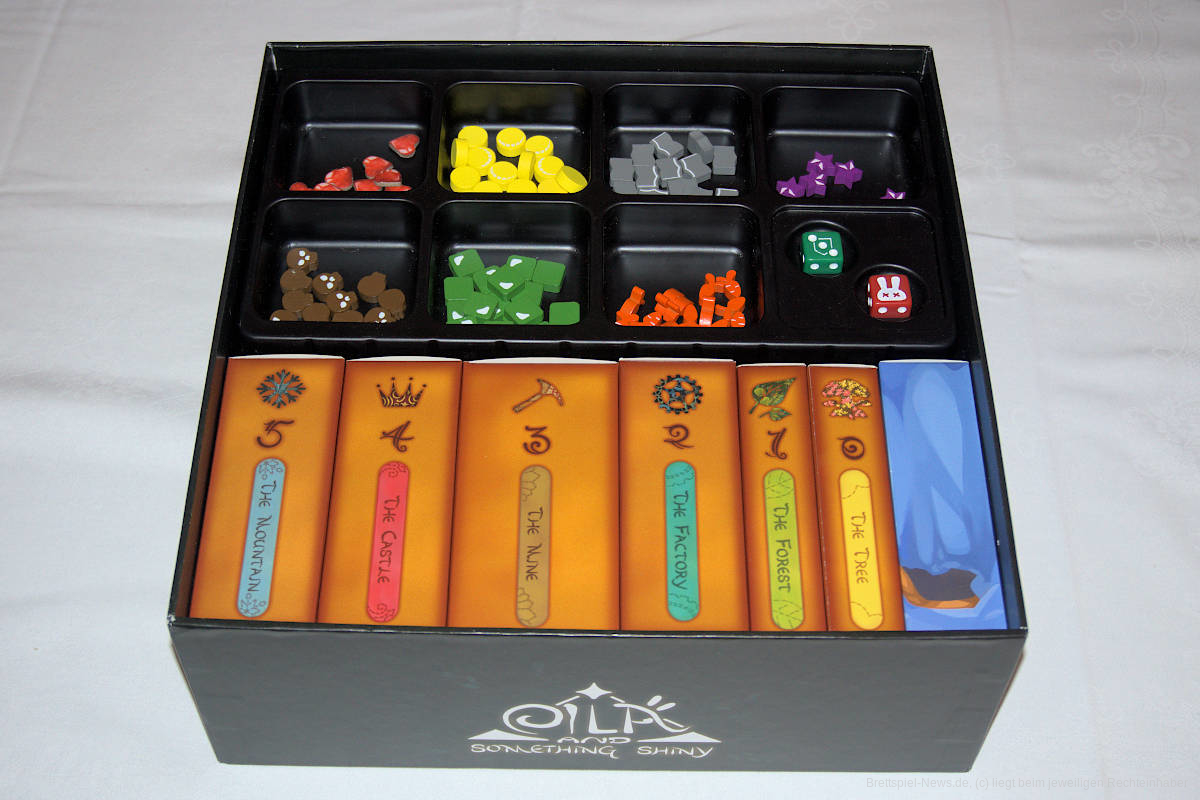Was zweifelsfrei schonmal feststeht ist, dass das Material von „Eila und das glitzernde Etwas“ sehr hochwertig aussieht. Die Ressourcen bestehen aus kleinen, detaillierten Holztoken, die Karten sind sehr schön illustriert und es gibt kleine Comics, die die Story umranden und fast schon zu süß sind!
