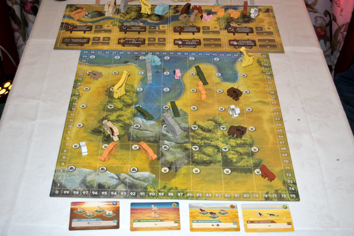 Optisch ist „Wilde Serengeti“ ein Augenschmaus. Was sich da im Laufe des Spiels auf dem Brett aufbaut, macht einiges her! Und das Thema ist ebenfalls sehr interessant. Allerdings dauert die einzelnen Runden recht lange und so zieht sich das Ganze etwas, während alle an ihren eigenen Szenen basteln. In der Koop- oder Solo-Variante könnte „Wilde Serengeti“ aber einiges gewinnen, was ich gerne probieren würde.