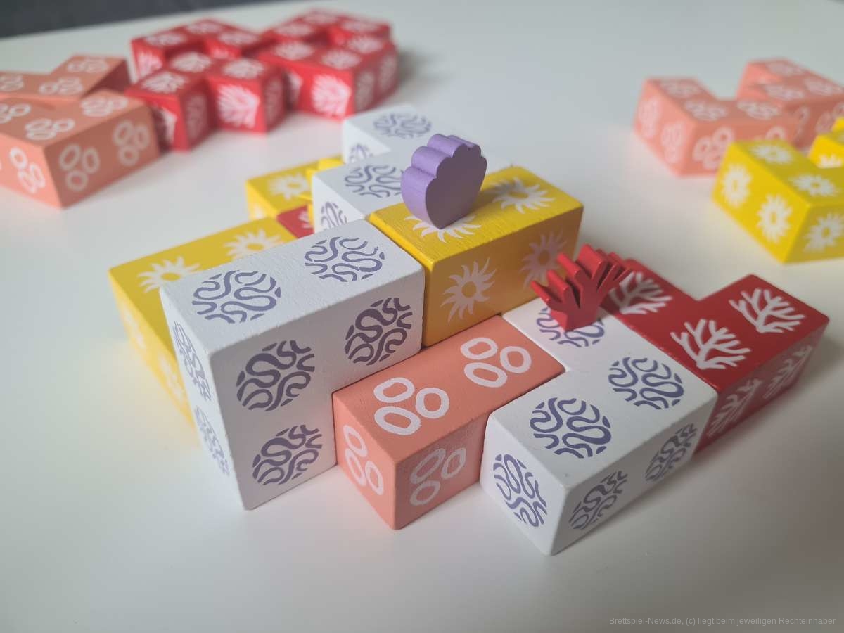 In „Coral“ bauen die spielenden Personen gemeinsam ein Korallenriff auf und wetteifern darum, ihre eigenen Arten möglichst weit oben zu platzieren, wo sie das lebensspendende Sonnenlicht aufsaugen können.