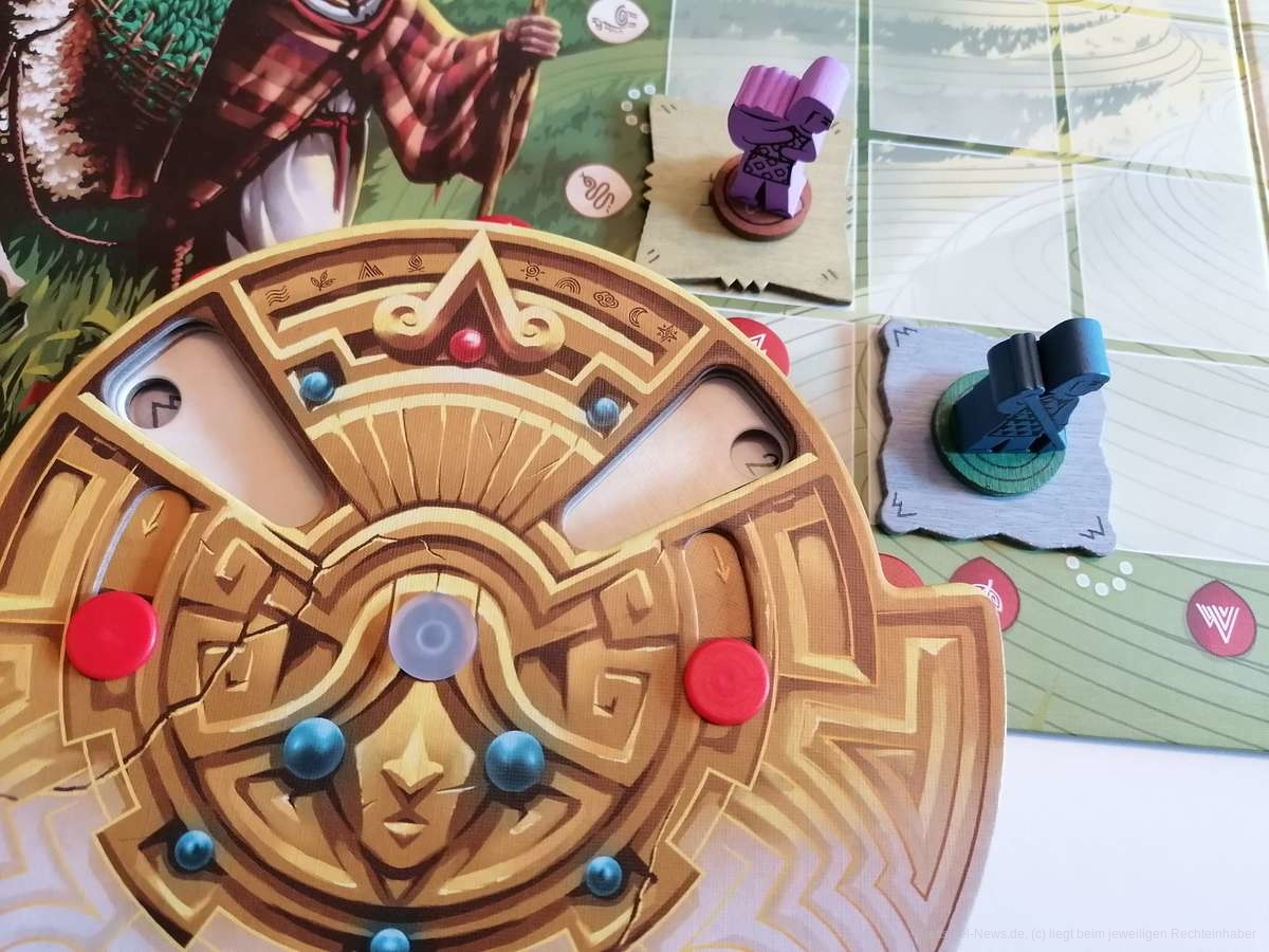 Nun müssen die Spielerinnen und Spieler kombinieren, auf welchen Felder welche Pflanzenplättchen liegen. Umzuschauen, ob die Vorhersagen korrekt sind, wird das Pachamama Rad zu Hand genommen. Dort werden die Zeilen und Spalten eingestellt und dann kontrolliert, welches Plättchen sich auf dem Feld befindet.