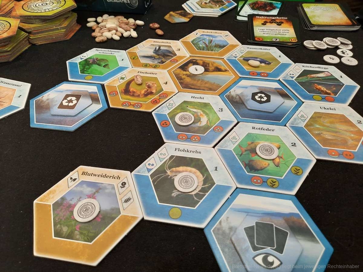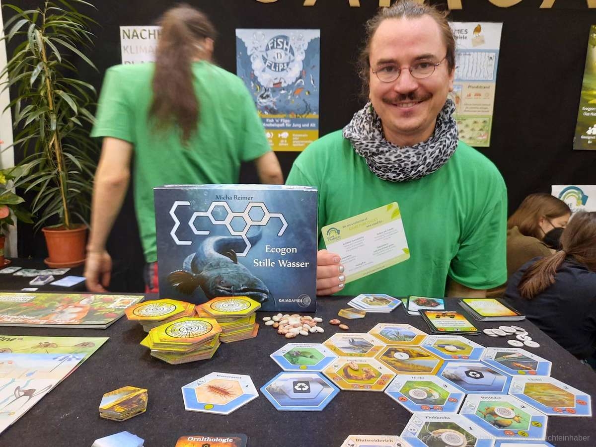 Kevin Luhn von Gaiagames hat uns einen Einblick gegeben worum es ihnen geht und was ihre Pläne sind. Gaiagames selbst stellt naturbezogene Spiele her, die „so umweltschonend wie nur möglich produziert wurden“. In ihrem Spiel „Ecogon“ bauen die Spielerinnen und Spieler ein Ökosystem aus Hexplättchen. Und bei „Fish ´n´ Flips“ wird versucht Meerestiere aus Fangnetzen zu befreien. Die Spiele eint nicht nur ihre Thematik , sondern auch dass sie kooperativ und edukativ sind.
