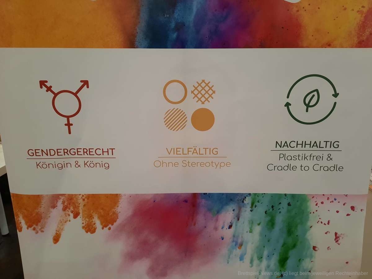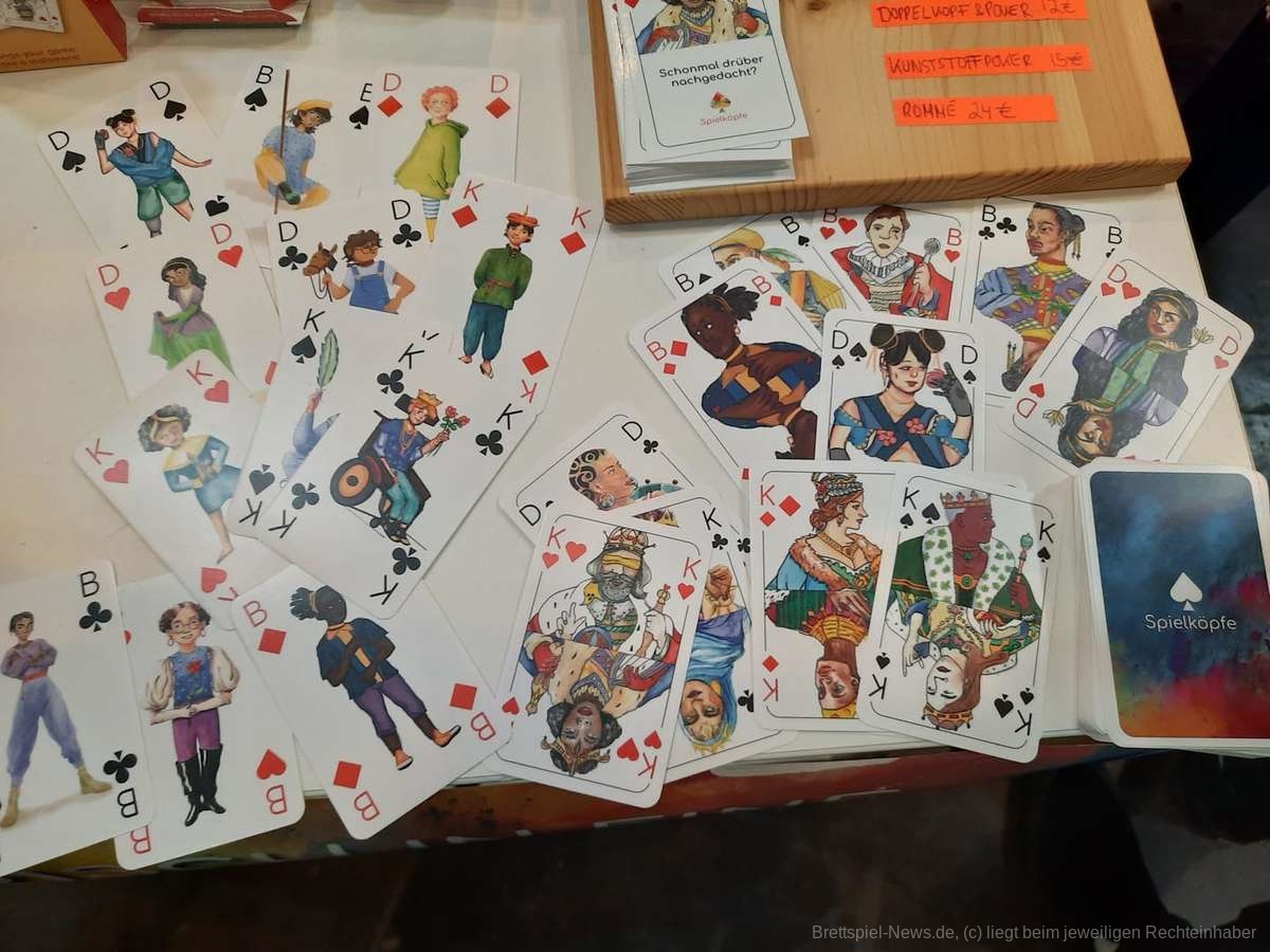 Neben Gaiagames war der Stand der Spielköpfe, welche sich die Themen Gendergerechtigkeit und Diversität auf die Fahnen geschrieben haben, indem sie klassische Spielkarten für Skat oder Poker produzieren, auf den Abbildungen jedoch besonders darauf achten, dass eine menschliche Vielfältigkeit dargestellt wird. Die Karte König ist hier „König*in“, denn „alle Geschlechter können Führungspositionen einnehmen“. Die Damen sind für gewöhnlich „alle weiß, langhaarig und schmücken sich mit Blumen“, dem wird ein Set aus Damen entgegengesetzt, die andere Hautfarben und Formen von Weiblichkeit zeigen. Der Spagat zwischen traditionellem Spiel und modernen Themen sorgt am Tisch dafür, dass veraltete Rollenbilder aufgebrochen werden und schneidet diese Themen spielerisch an.