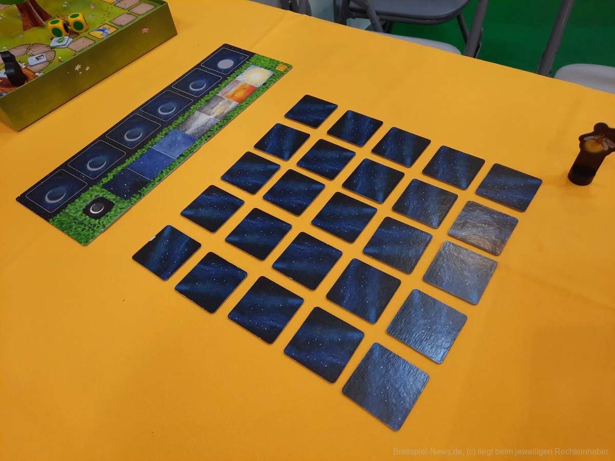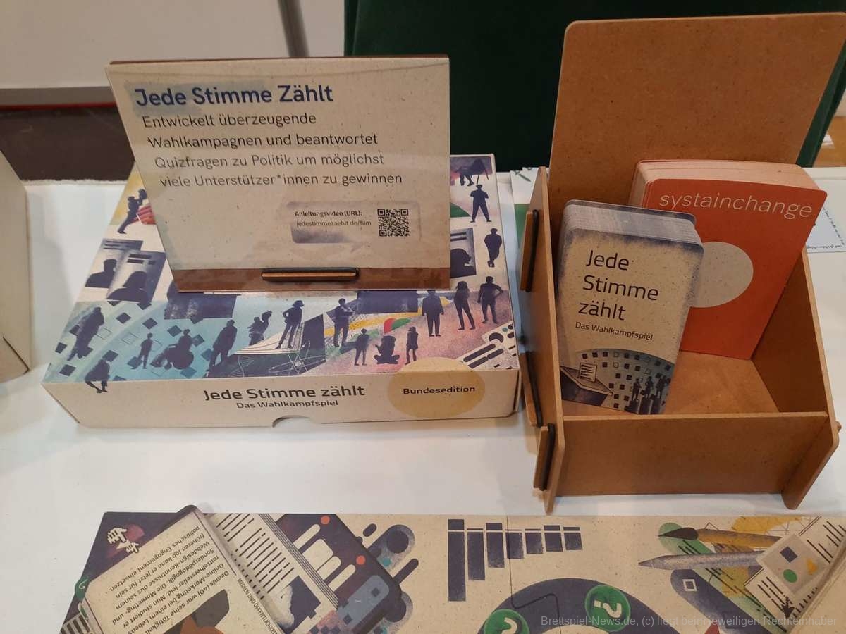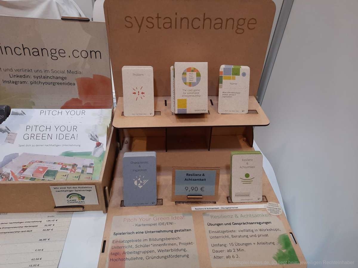 Haptisch interessant wurde es dann am Stand von Caro von Systainchange, die ihre Spiele auf Graspapier drucken lassen. Es wirkt erst einmal befremdlich Karten mit Textur in der Hand zu halten. Der Prozess aus Holz Papier zu machen sei jedoch aufwändiger und umweltbelastender, als aus Gras. Die Karten fühlen sich ein wenig an wie Kartonpapier und machen erst einmal den Eindruck, als würden sie Wasser aufsaugen wie ein Schwamm. Caro erzählt, dass sich ein unglücklicher Weinunfall jedoch leicht von diesen Karten abwischen lasse, da die Fasern des genutzten Grases länger wären, als die von recyceltem Papier. Ihre Spiele drehen sich um Entscheidungsfindung. „Menschen folgen den Regeln“ sagt Caro, was Entscheidungen in Spielen oft in einen bestimmten Rahmen zwängt, oder sogar eine Hierarchie vorgibt. Wir alle kennen das. Entscheidungsmomente werden anders angegangen, indem die Spielerinnen und Spieler selbst austüfteln müssen wie sie zur Entscheidungsfindung gelangen wollen, wodurch Zusammenarbeit trainiert wird.