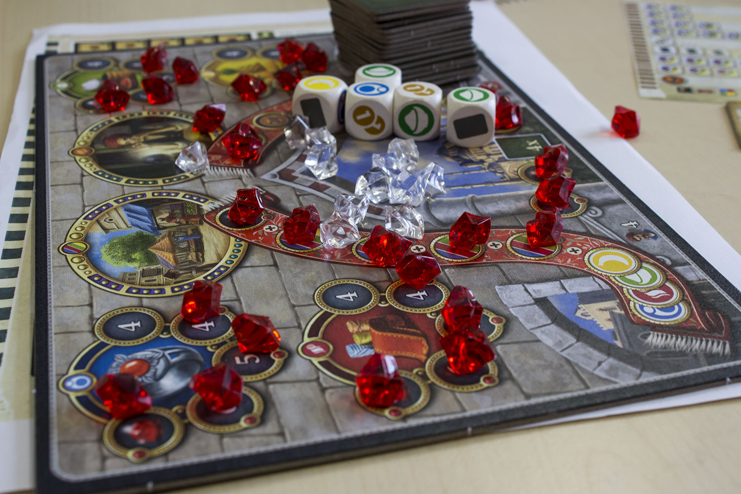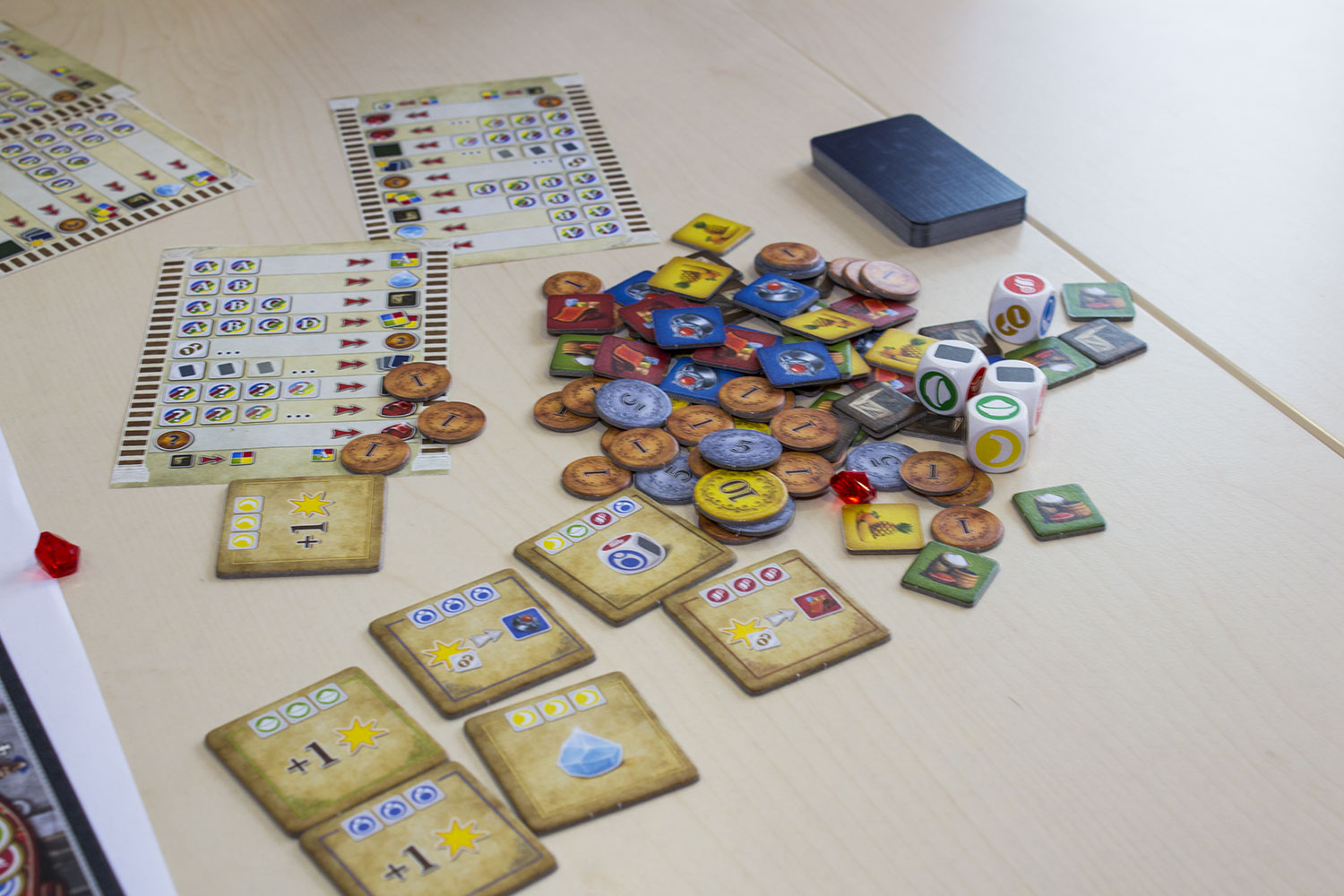Als Brettspielversion habe ich “Istanbul” oft gespielt. Umso gespannter war ich auf die Version mit Würfeln. Erste Parallele zur Vorlage sind die Rubine, die es zu verdienen gilt. Auch sonst fühlen sich “Istanbul-Spieler” gleich von Anfang zu Hause. Was fehlt ist die große Auslage an Orten, die man besuchen kann. Stattdessen hat jeder Spieler eine eigene kleine Übersicht vor sich liegen, die alle relevanten Aktionsmöglichkeiten darstellt.