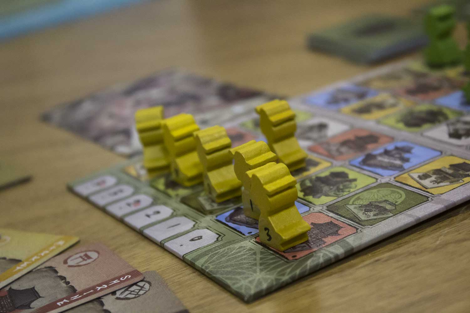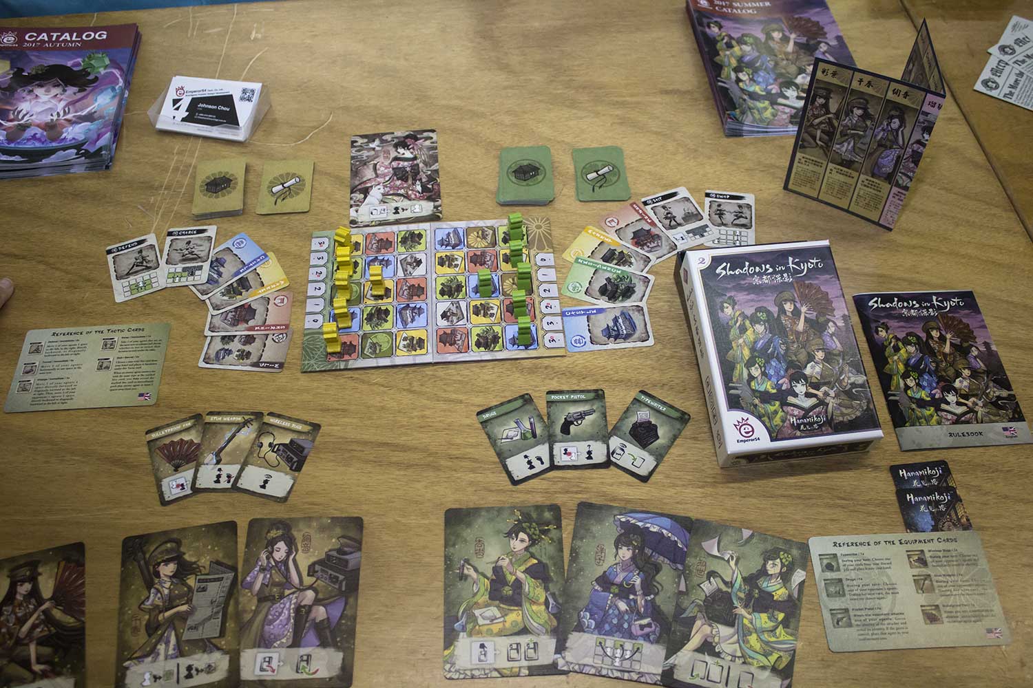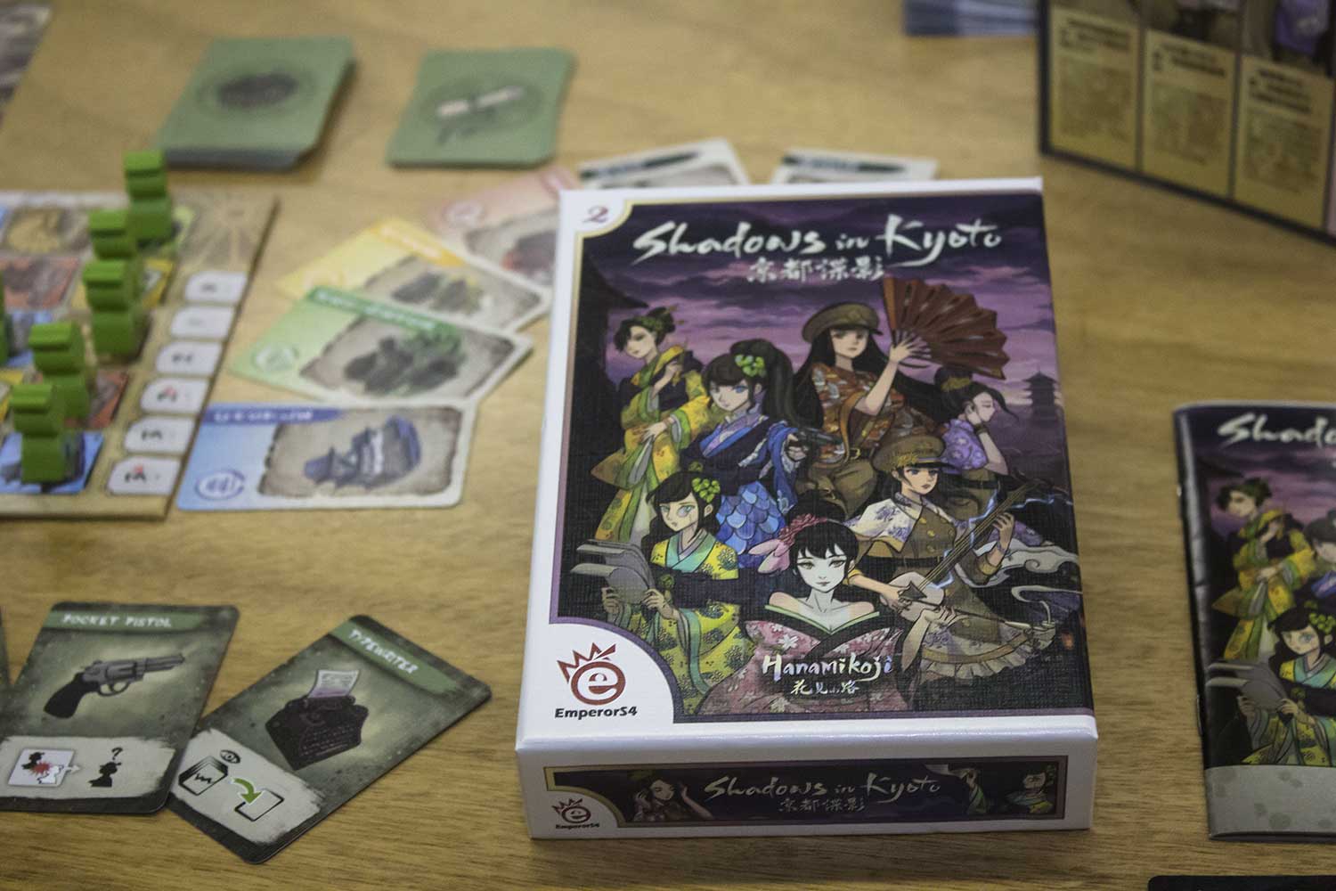 "Shadows in Kyoto" ist ein Spiel für zwei Spieler und dauert 15-30 Minuten. Vielleicht startet das Spiel in der Spieleschmiede. Die Verhandlungen laufen mit dem herausgebenden Verlag Emperor S4. Am Ende des Artikels finden Sie ein paar Bilder zum Spiel. “Shadows in Kyoto” ist ein auf “Hanamikoji” basiertes Spiel. Dabei müssen die Spieler versuchen die Kontrolle über Oniwaban zu erlangen. Das ist eine geheime Gruppe von Spionen, die im Geheimen den Shogun beschützen. Dabei greifen sie auf technologien der westlichen industriellen Revolution zurück. Das Spielmaterial sieht hübsch aus und die Box passt auch in Reisetaschen. Sicherlich einen Blick wert!