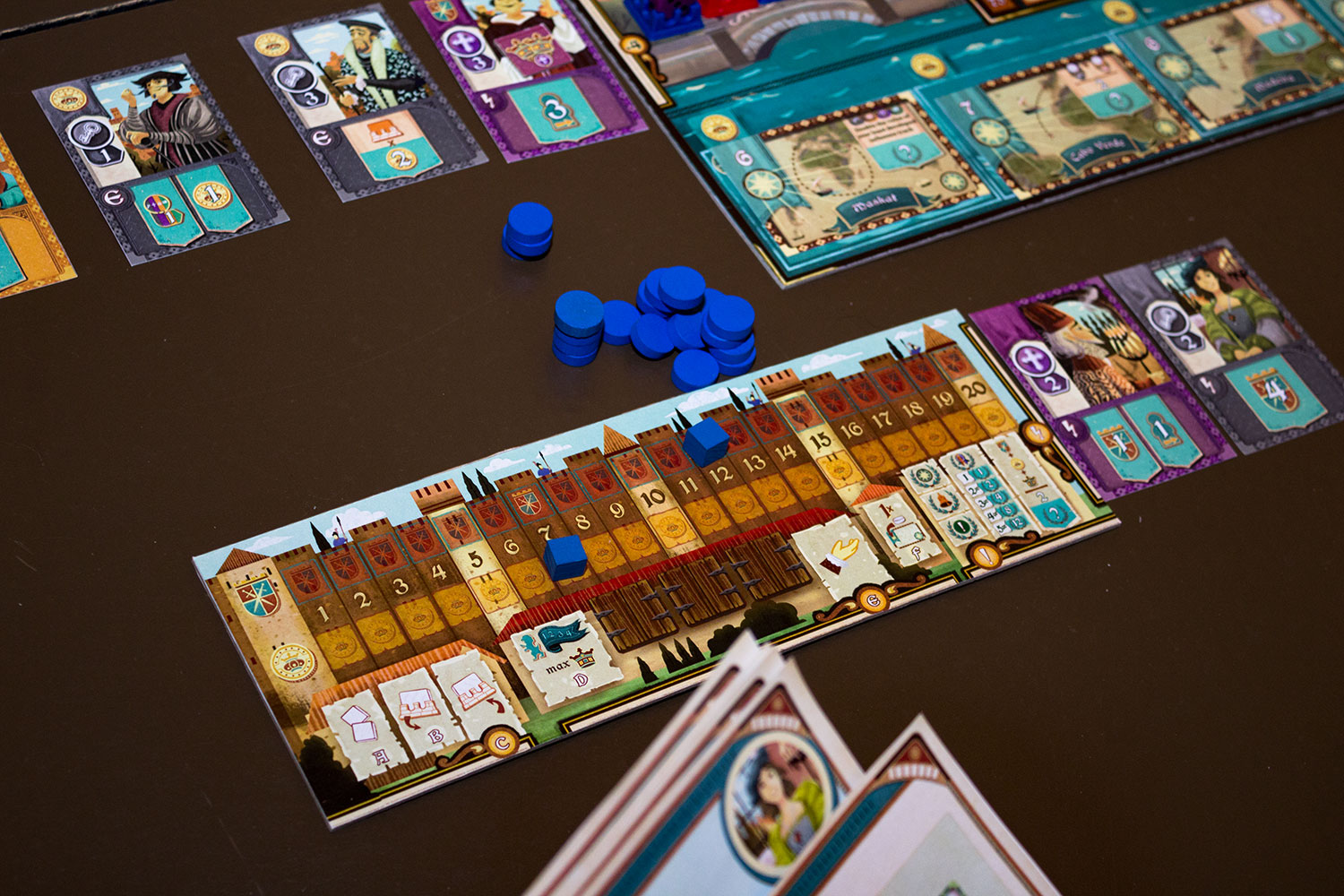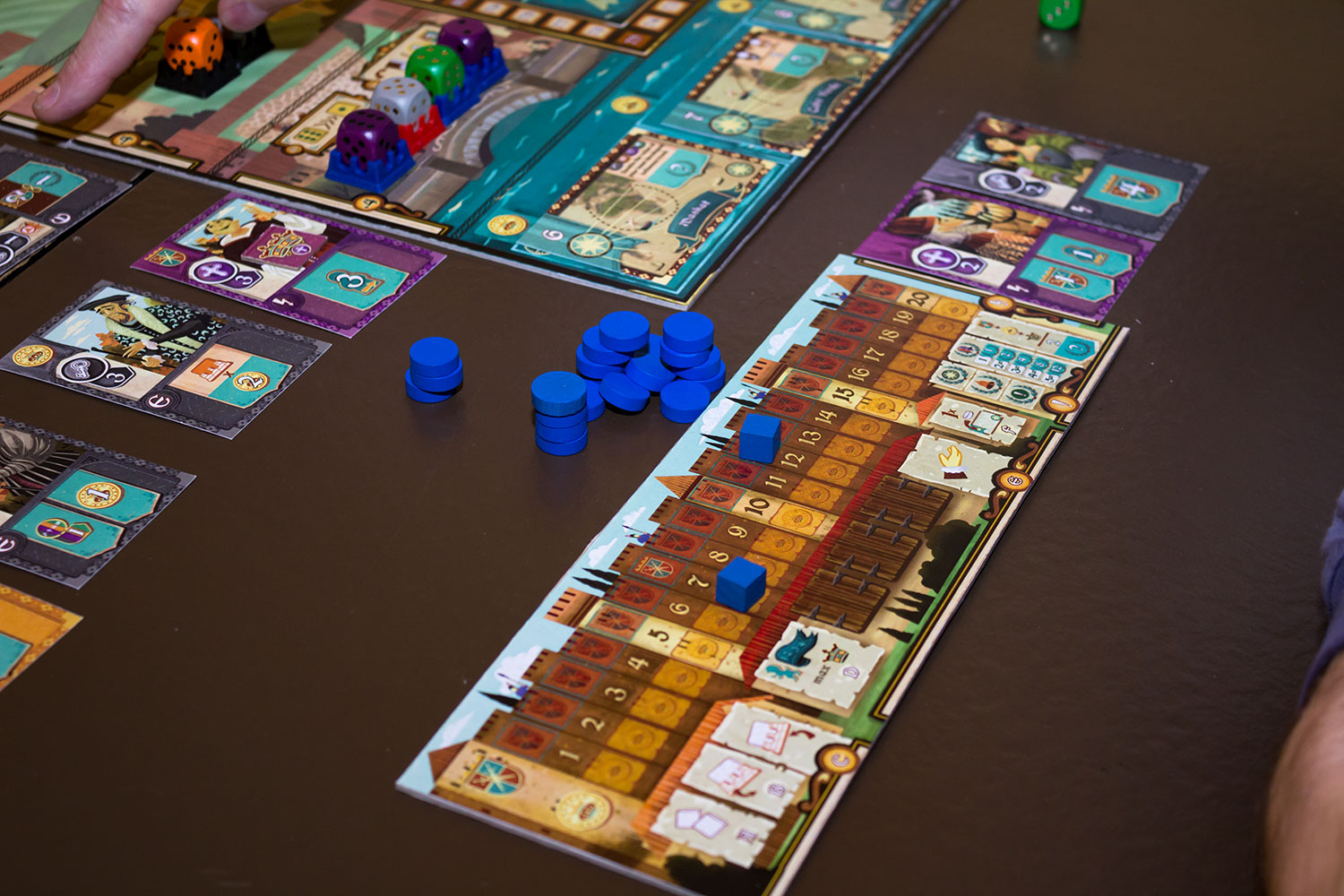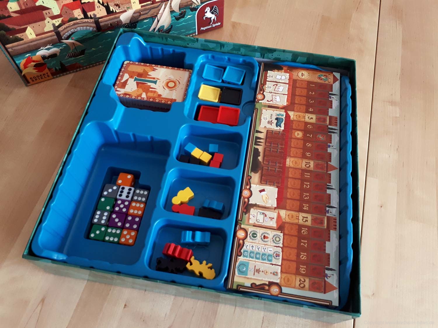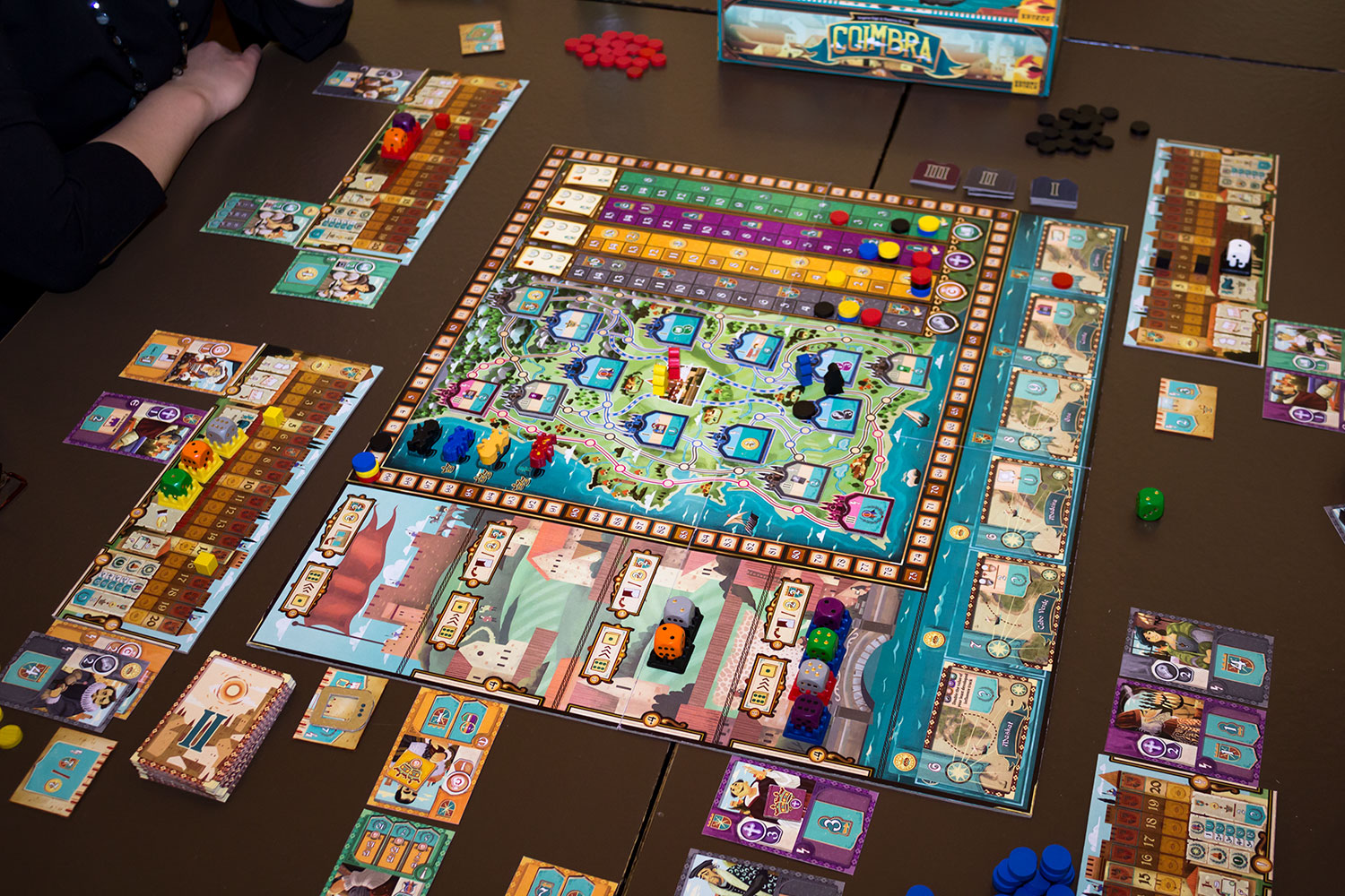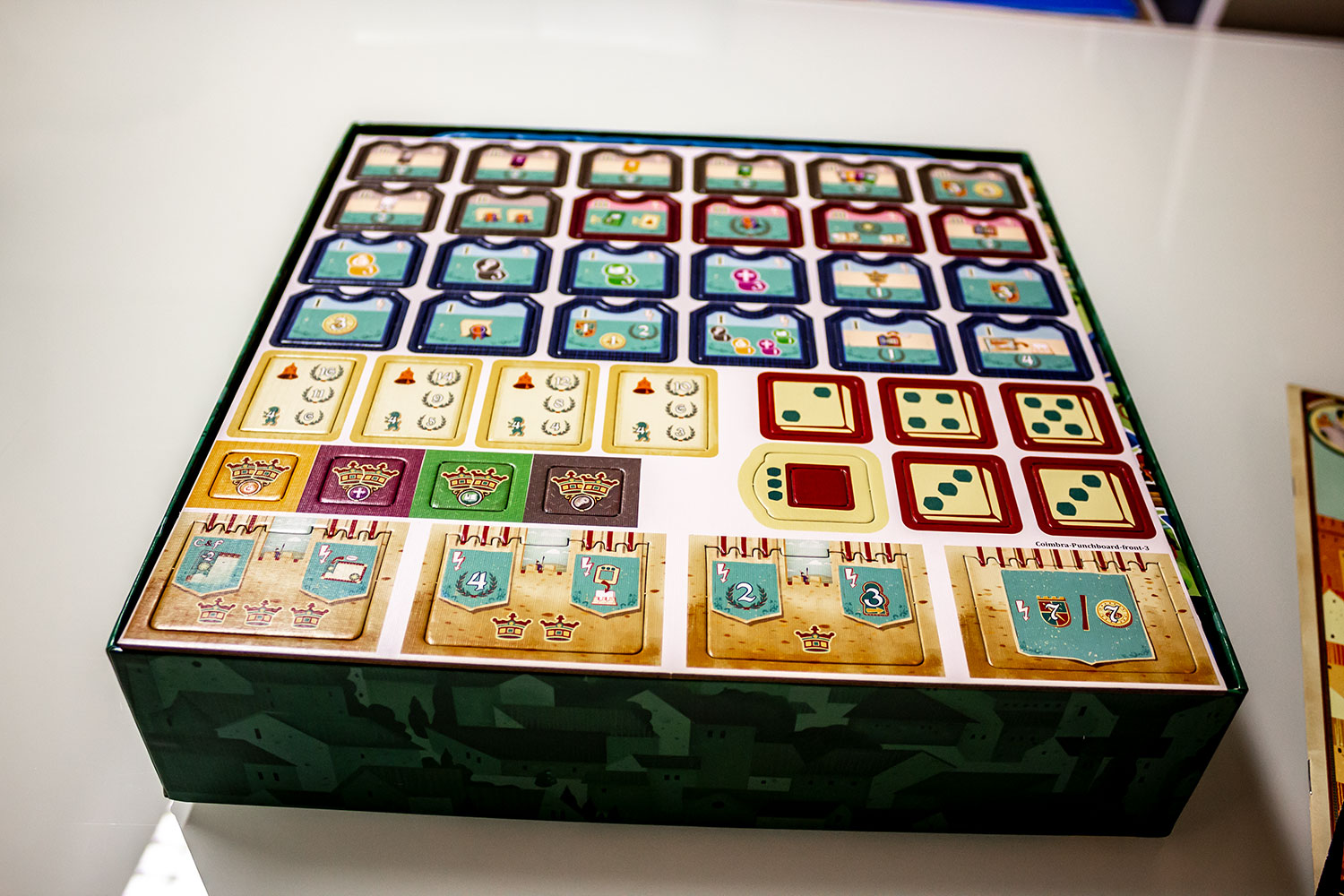 Wie schon bekannt, hat eggertspiele das Spiel “Coimbra” von den Autoren Virginio Gigli und Flaminia Brasini für 2018 angekündigt. Bei den Ratinger Spieletagen hatte der Verlag freundlicherweise einen fast finalen Prototypen bereit stehen. Das Spielmaterial sieht schon sehr vielversprechend aus und richtet sich klar an Kenner. Eine Partie soll laut Verlag ca. 60-120 Minuten dauern. die Grafiken zeigen gleich, dass es viele Dinge gibt, die relevant sind und beachtet werden müssen. Ein Testspieler bezeichnete es als sehr kleinteilig und eher komplex. Der Spielplan ist ebenfalls mehrteilig.