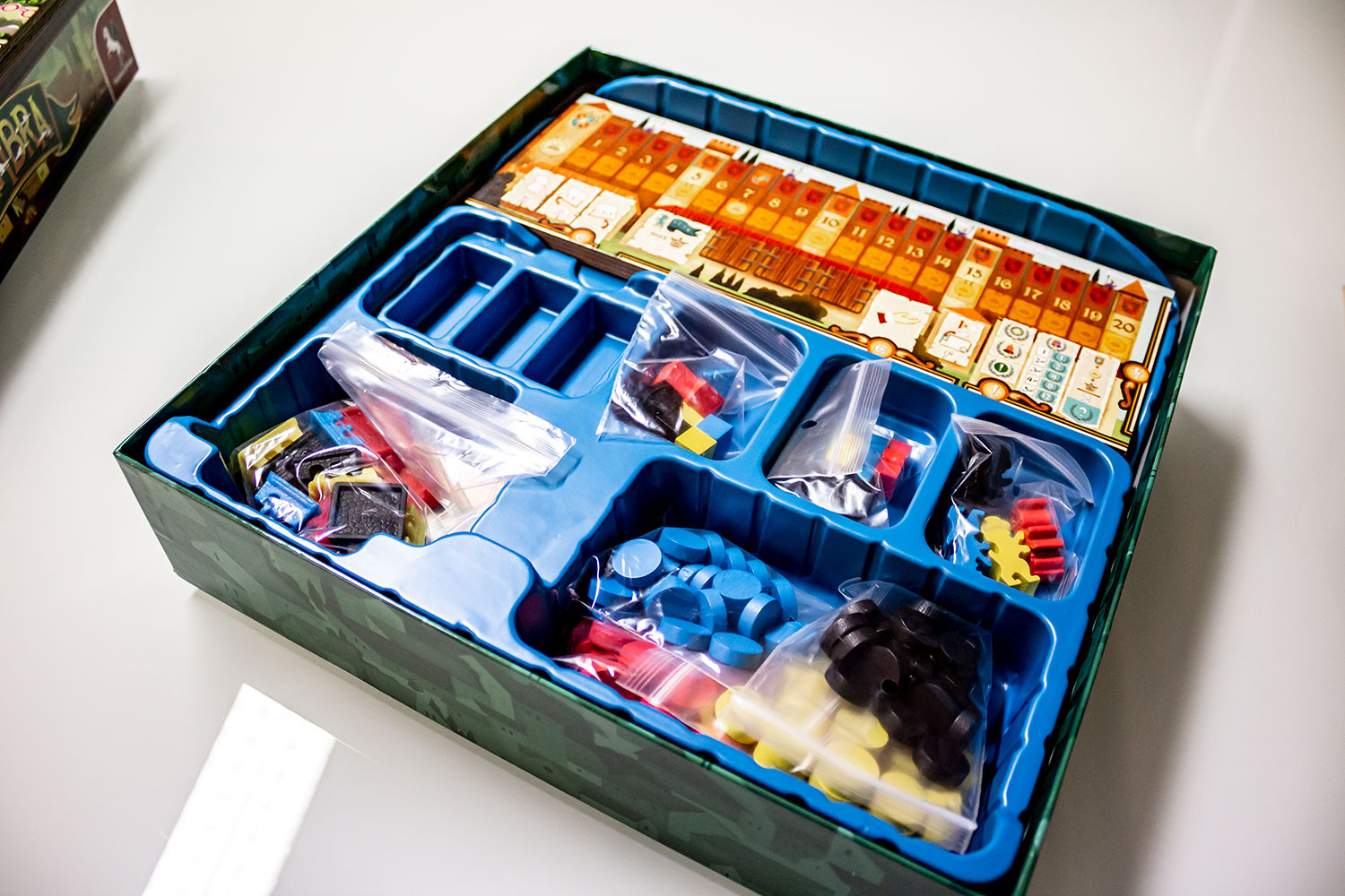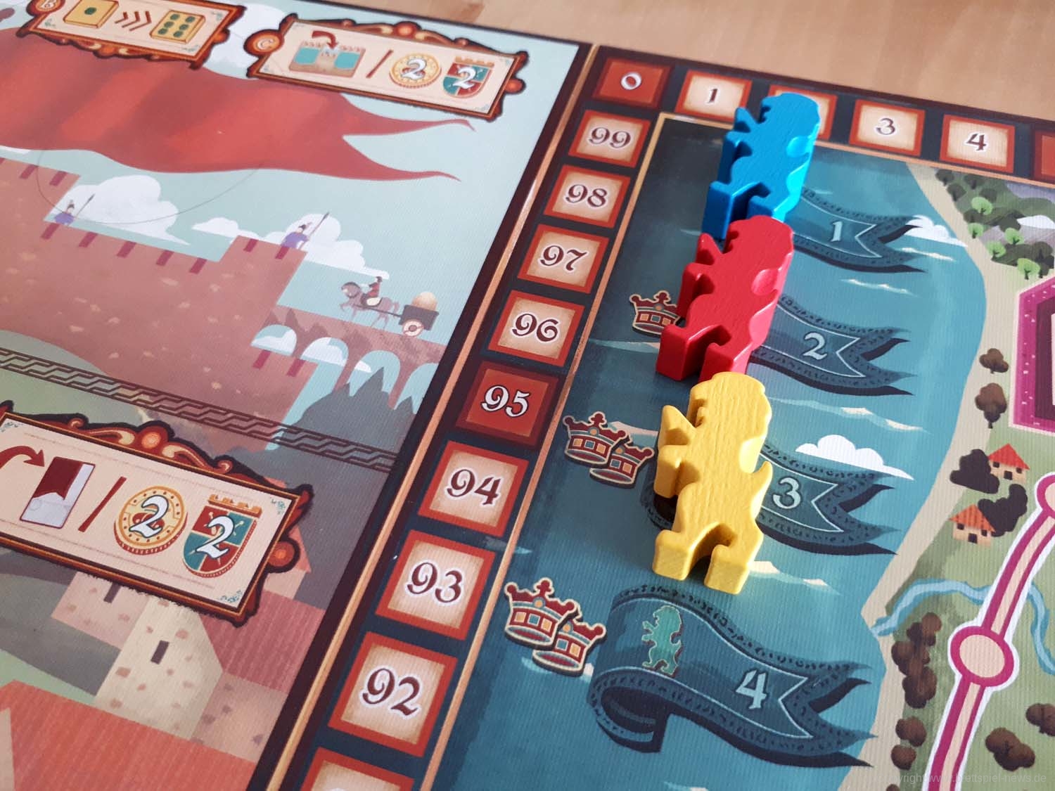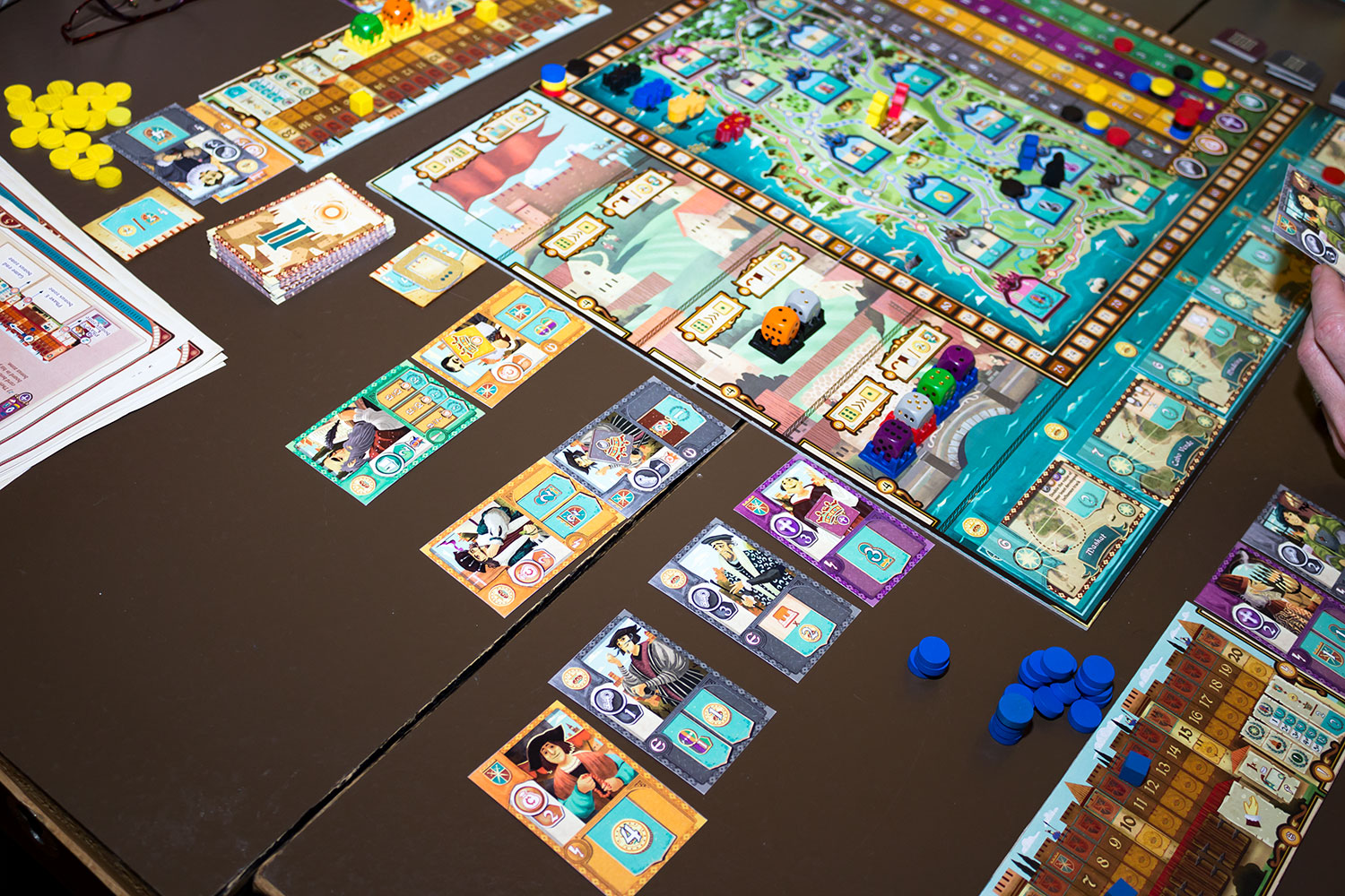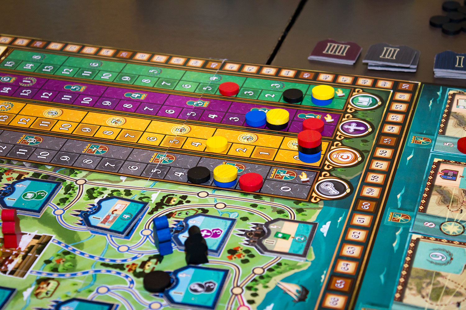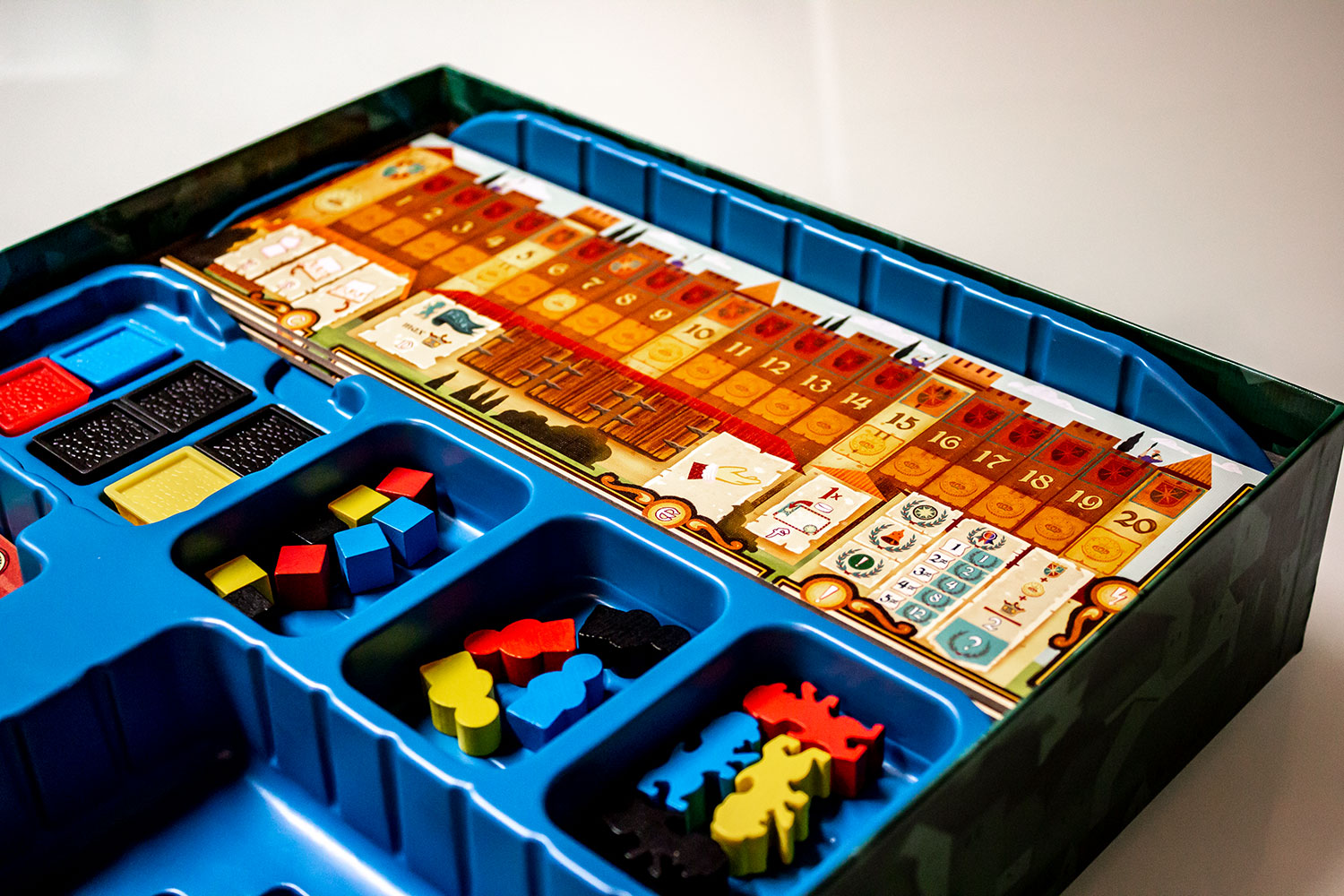 Wie schon bekannt, hat eggertspiele das Spiel “Coimbra” von den Autoren Virginio Gigli und Flaminia Brasini für 2018 angekündigt. Bei den Ratinger Spieletagen hatte der Verlag freundlicherweise einen fast finalen Prototypen bereit stehen. Das Spielmaterial sieht schon sehr vielversprechend aus und richtet sich klar an Kenner. Eine Partie soll laut Verlag ca. 60-120 Minuten dauern. die Grafiken zeigen gleich, dass es viele Dinge gibt, die relevant sind und beachtet werden müssen. Ein Testspieler bezeichnete es als sehr kleinteilig und eher komplex. Der Spielplan ist ebenfalls mehrteilig.