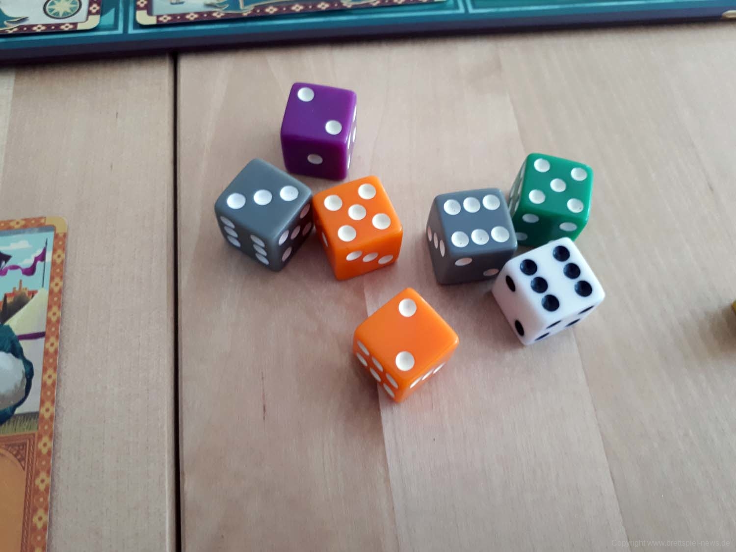Das Spiel ist würfelgesteuert, die Spieler suchen sich in der Reihenfolge Würfel aus und setzten sie auf ein viereck in der eigenen Spielerfarbe. So wird die Zuordnung markiert. Die Würfel werden dann auf vier Aktionsfelder gesetzt. In der obersten beginnen die kleinsten Werte, während in den anderen drei Zonen die höchsten Werte anfangen. zudem gibt es Karten, die eine Sofort-, eine Spielende- oder Aktionen während des Spiels ermöglichen. Insgesamt gibt es vier Zählleisten, in denen die Spieler aufsteigen können. Die dafür vergeben Punkte sind variable und unterscheiden sich jede Partie. In einer Leiste kann man aufsteigen, indem man seine Figur auf der Spielfeldkarte hin und her bewegt.