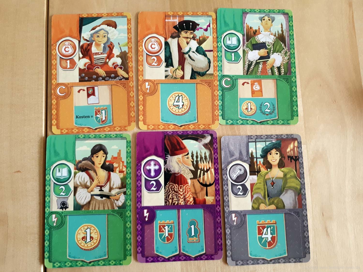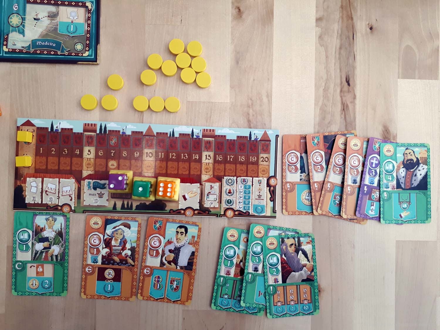Im Zeitalter der Entdeckungen florieren Portugals größte Städte - neben Porto und Lissabon ist das insbesondere Coimbra mit seiner renommierten Universität.Als Oberhäupter der alteingesessenen Geschlechter von Coimbra habt ihr erkannt, dass mit dem Wohlstand auch das Sicherheitsbedürfnis seiner Einwohner wächst. Daher hat jeder von euch seinen eigenen Wachschutz ins Leben gerufen, um den wichtigsten Gelehrten, Ratsmitgliedern, Händlern und Geistlichen der Stadt Leibgarden zur Seite stellen zu können. Schließlich möchtet ihr die Dienste des einen oder anderen in Anspruch nehmen und nicht jeder lässt sich mit Geld bestechen.
