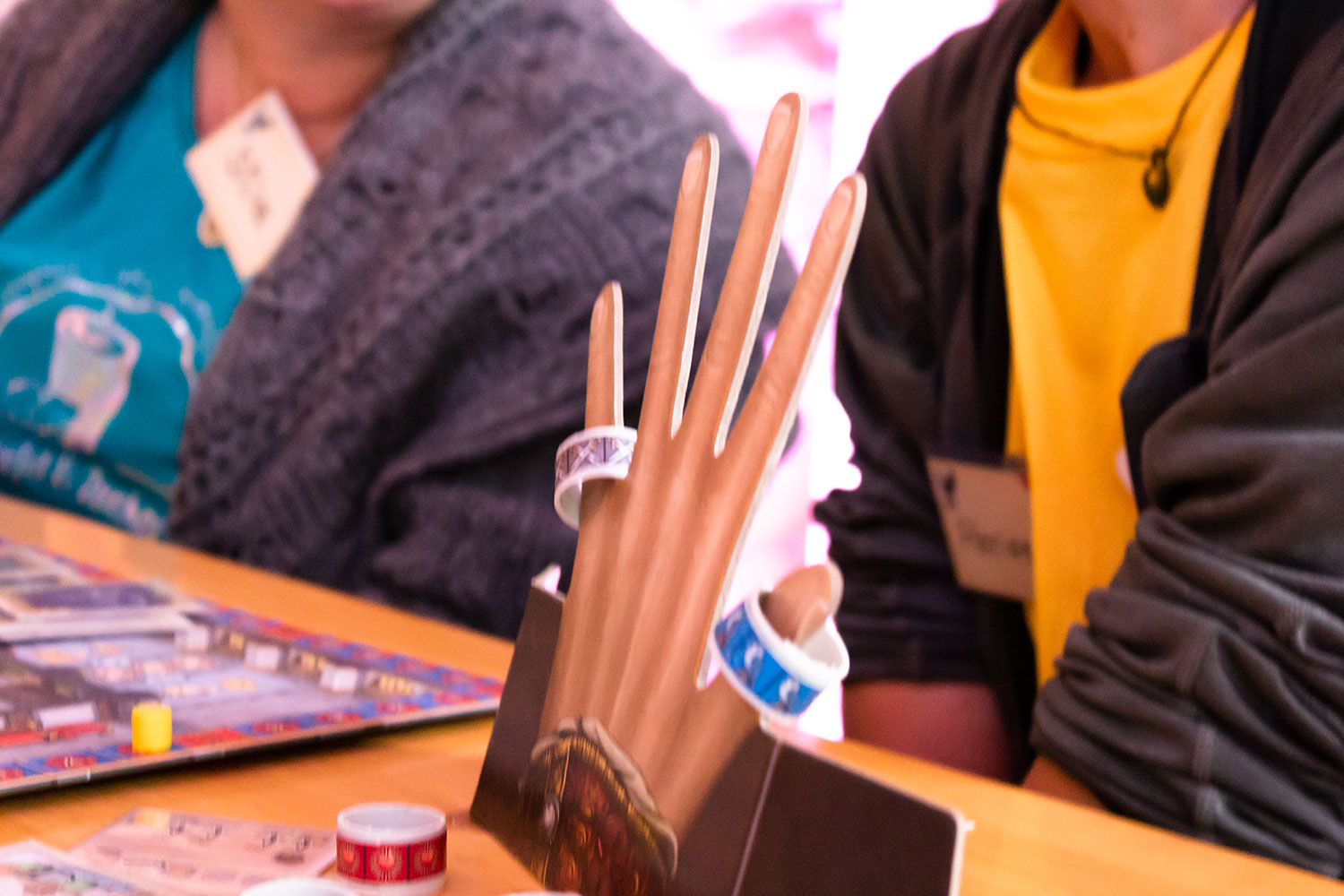 Besonders auffällig sind die Aufsteller, die jeder Spieler vor sich liegen hat. Es ragt eine Hand heraus, auf dessen Finger Siegelringe platz finden. So kann sich jeder Spieler in anderer Kombination binden.