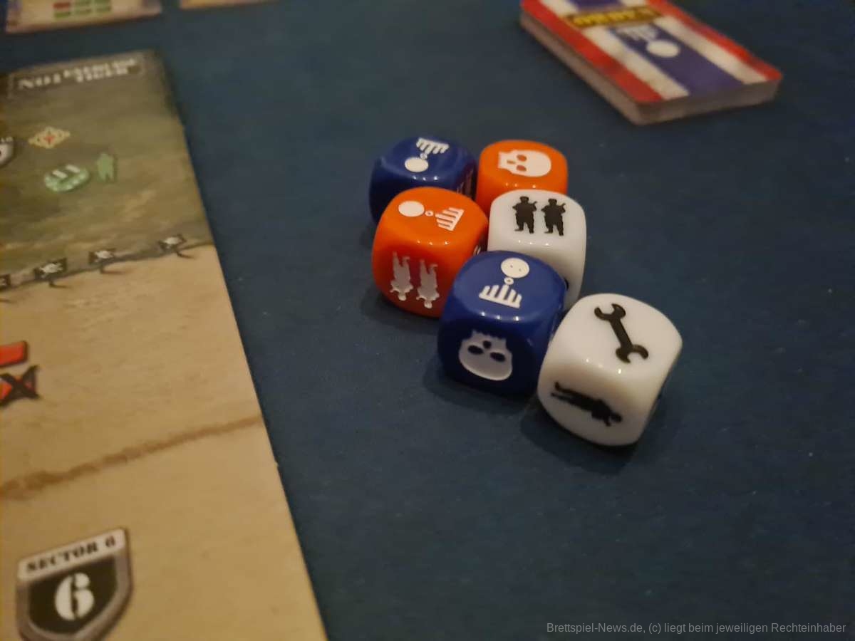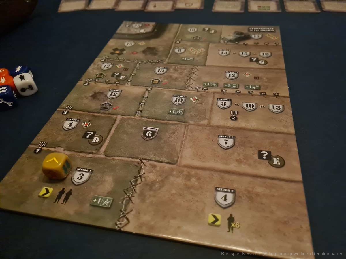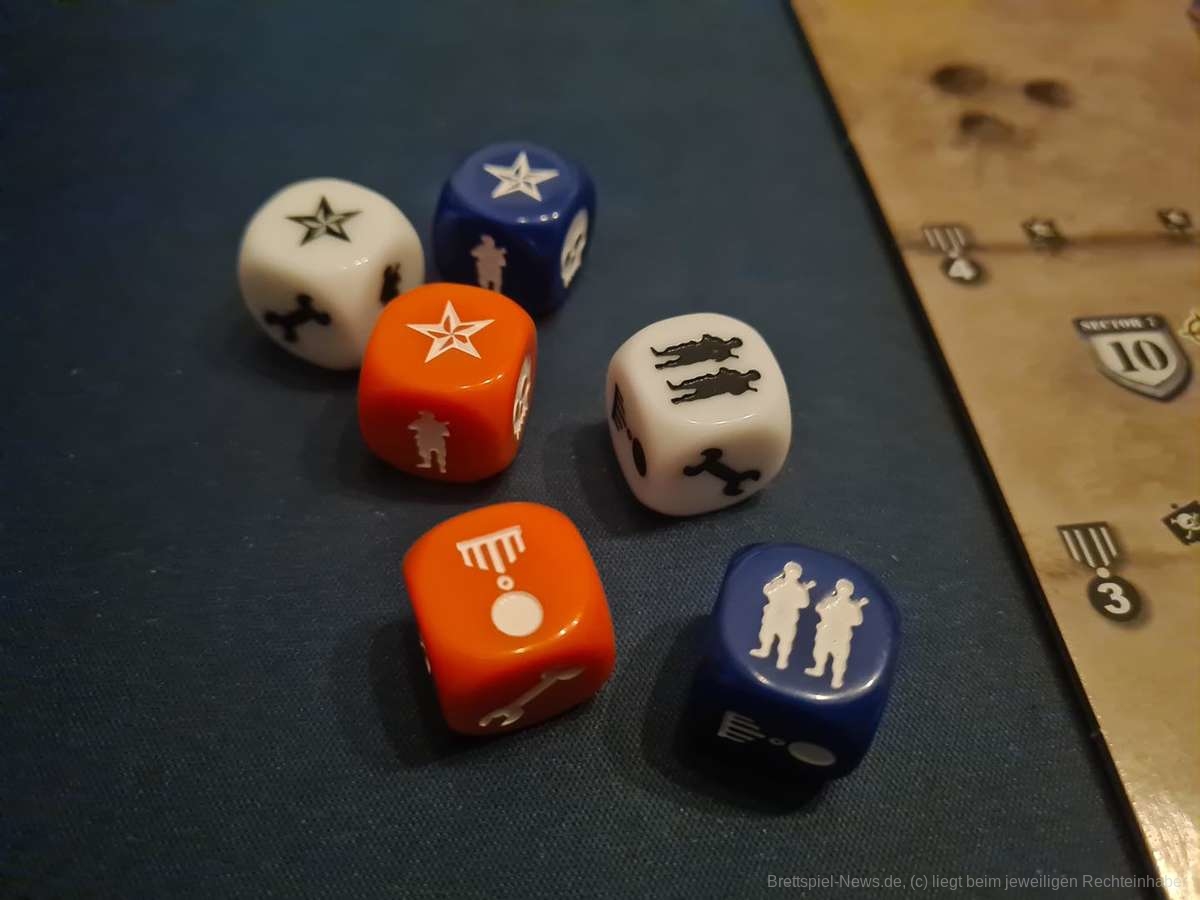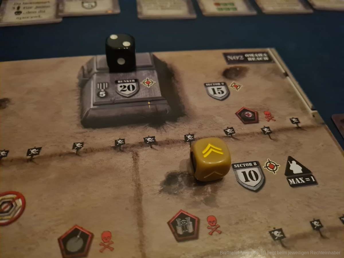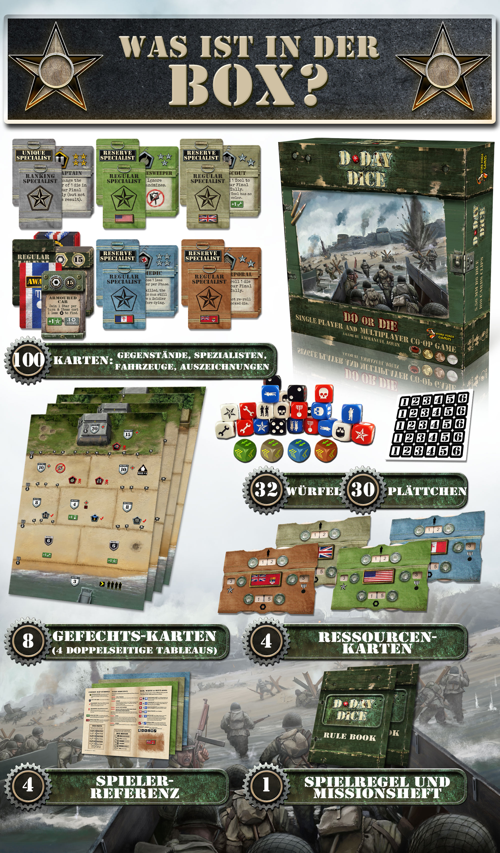 D-Day Dice ist ein kooperatives Spiel, bei dem alle Spieler ihre Züge gleichzeitig ausführen und sich gegenseitig helfen müssen, um zu überleben. Auch wenn Würfel mit im Spiel enthalten sind, geht es doch hauptsächlich darum, die wenigen vorhandenen Ressourcen (Soldaten, Spezialisten, Gegenstände und zu guter Letzt den Mut) geschickt einzusetzen und die Bewegungen der eigenen Einheiten zur richtigen Zeit auszuführen. Plant gemeinsam eure Strategie, denn einmal vorhandene Ressourcen bleiben euch für weitere Runden erhalten, und führt die Alliierten zum Sieg am Omaha Beach!