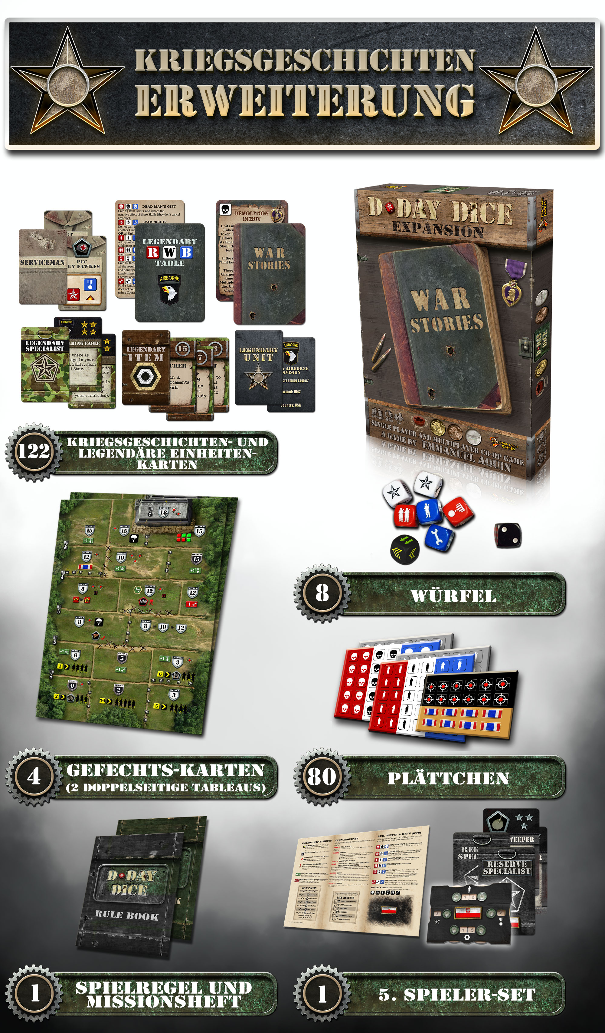 “D-Day Dice” wird schon erweittert. Noch ist das SPiel nicht ausgeliefert, schon können Spieler das Spiel zusätzlich erweitern. Das Grundspiel lässt sich damit noch einmal fördern. Wer mag, kann für alle Erweiterungen und Deluxe-Spielmaterial bis zu 260 € ausgeben. Das Spiel ist für 1-4 Spieler, eine Partie dauert 30-90 Minuten.