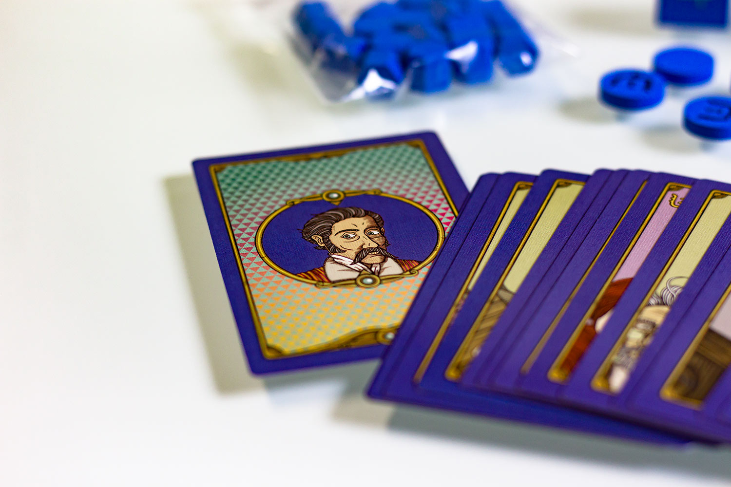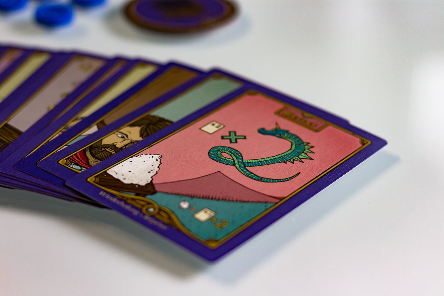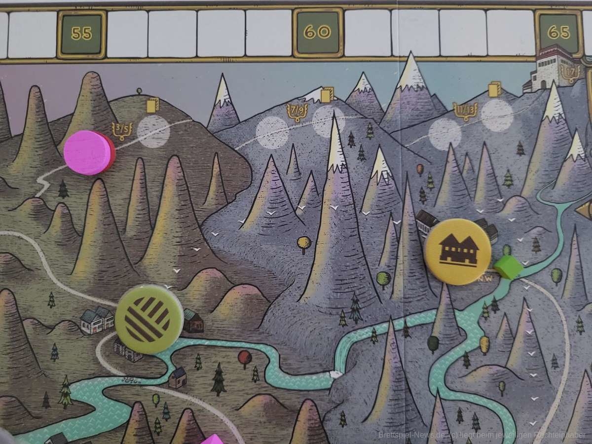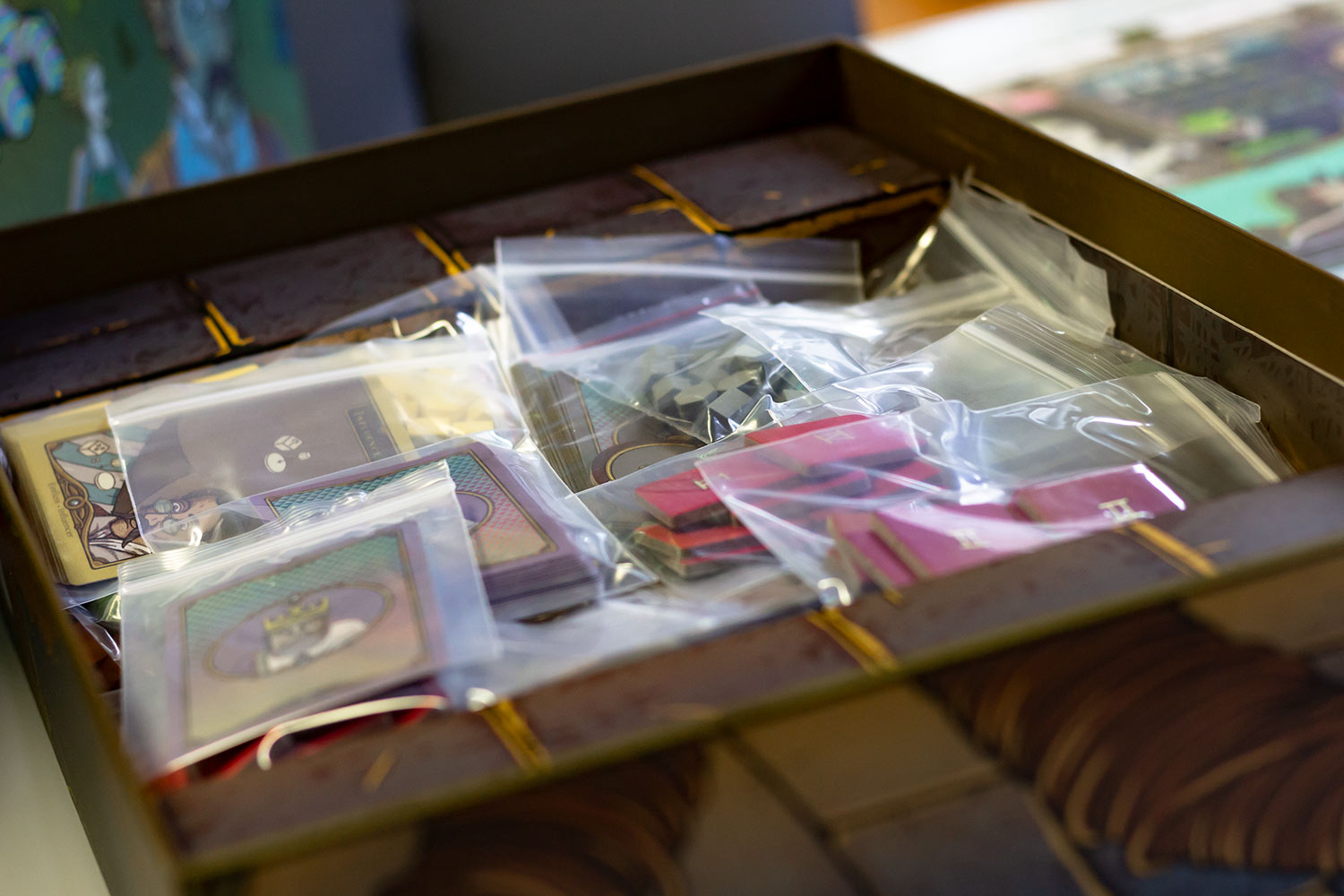 Der Preis für die hier abgebildete Big Box des Spiels war mit 83 $ plus Lieferung zwar recht hoch, doch die gelieferte Qualität rechtfertigt diesen Preis. Das Spiel wird mit drei Erweiterungen, einzigartigen Miniaturen und sehr hochwertigen Spielmaterial ausgeliefert. Die Optik ist sehr skurril und wirkt wie aus einem Traum entrissen. Das Spielfeld ist enorm ausladend und füllte jeden Tisch gut aus. Die Marker sind zum teil aus Holz und zum Teil auf sehr dicker Pappe. Die Druckqualität ist durchweg absolut hochwertig. Zum Teil sind die Karten sogar mit silberner glänzenden Farbe bedruckt. Die Box selber hat einen Goldeindruck im Schriftzug. Insgesamt könnte hier eine fantastische Welt auf den Tisch gezaubert werden. Ob dem so ist, schauen wir uns noch an.