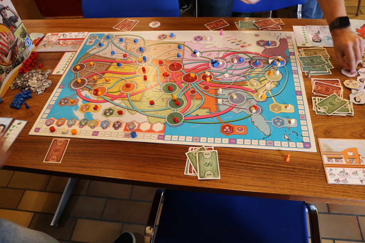 Franchise ist die Neuheit von Christwart Conrad, der auch selbst da war um sein Spiel zu erklären. Hierbei handelt es sich um eine überarbeitete und „verbesserte“ Neuauflage eines alten Klassikers: „Pfeffersäcke“. Die Grafik erinnert ein wenig an Food Chain Magnete und die Ausbreitung an Funkenschlag, aber das war es dann auch schon mit gemeinsamkeiten. Wir brieten uns aus, versuchen in Städten die Mehrheiten zu bekommen um an Punkte zu kommen um dann am Ende im besten Fall dann auch noch die Provinz Wertung für uns zu entscheiden. All das muss wohl geplant und durchdacht sein, denn solange Städte nicht gewertet sind generieren sie uns Einkommen, allerdings kann auch ein Gegner in unsere Stadt mit einbauen um dann das einkommen zu senken und uns ggf. wichtige Punkte streitig zu machen.