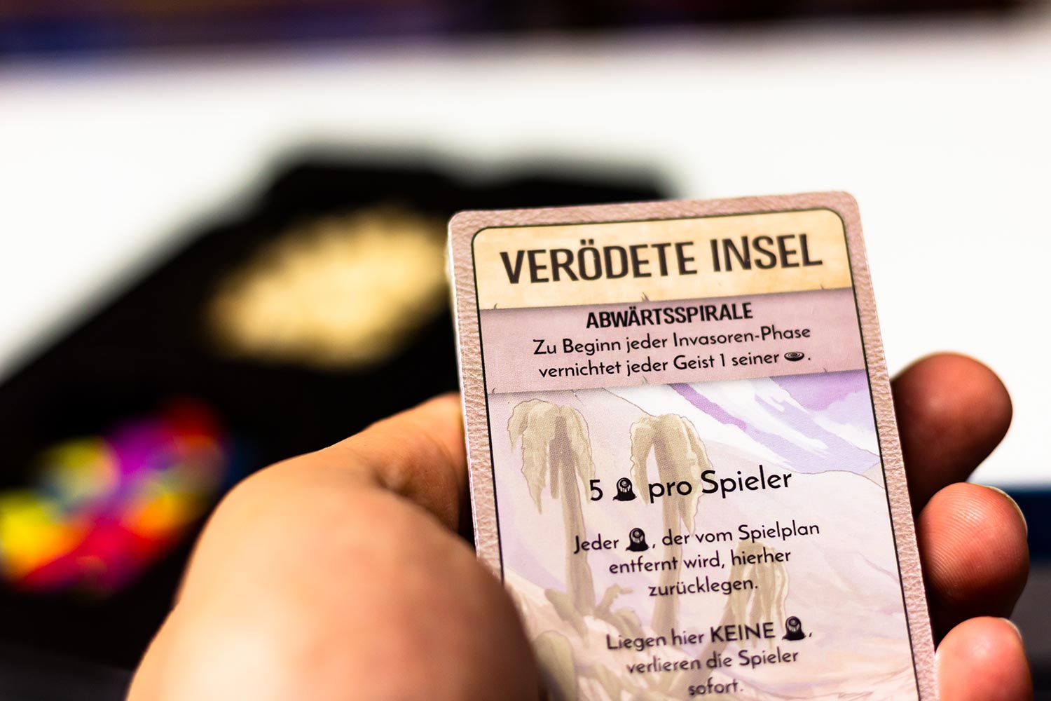 Spirit Island ist ein komplexes und thematisches kooperatives Spiel über die Verteidigung Ihres Inselhauses gegen kolonisierende Eindringlinge. Die Spieler sind verschiedene Geister des Landes, jeder mit seinen eigenen einzigartigen Elementarkräften. In jeder Runde wählen die Spieler gleichzeitig, welche ihrer Power-Karten sie spielen möchten, und zahlen dafür Energie. Die Verwendung von Kombinationen von Power-Karten, die den elementaren Affinitäten eines Geistes entsprechen, kann kostenlose Bonus-Effekte gewähren. Schnellere Kräfte wirken unmittelbar, bevor sich die Invasoren ausbreiten und verwüsten, aber andere Magien sind langsamer, erfordern Voraussicht und Planung, um sie effektiv zu nutzen. In der Phase des Geistes gewinnen die Geister Energie und wählen, wie / ob sie wachsen wollen: um gebrauchte Energiekarten zurückzugewinnen, nach neuer Kraft zu suchen oder ihre Präsenz in neuen Gebieten der Insel zu verbreiten.