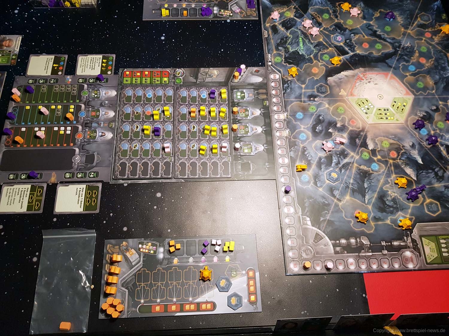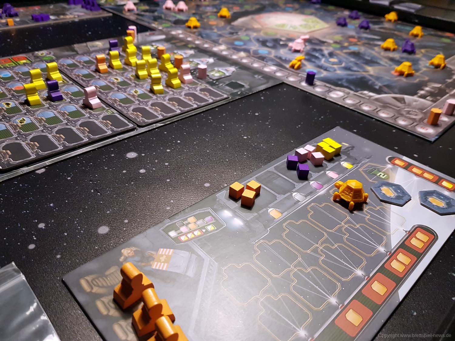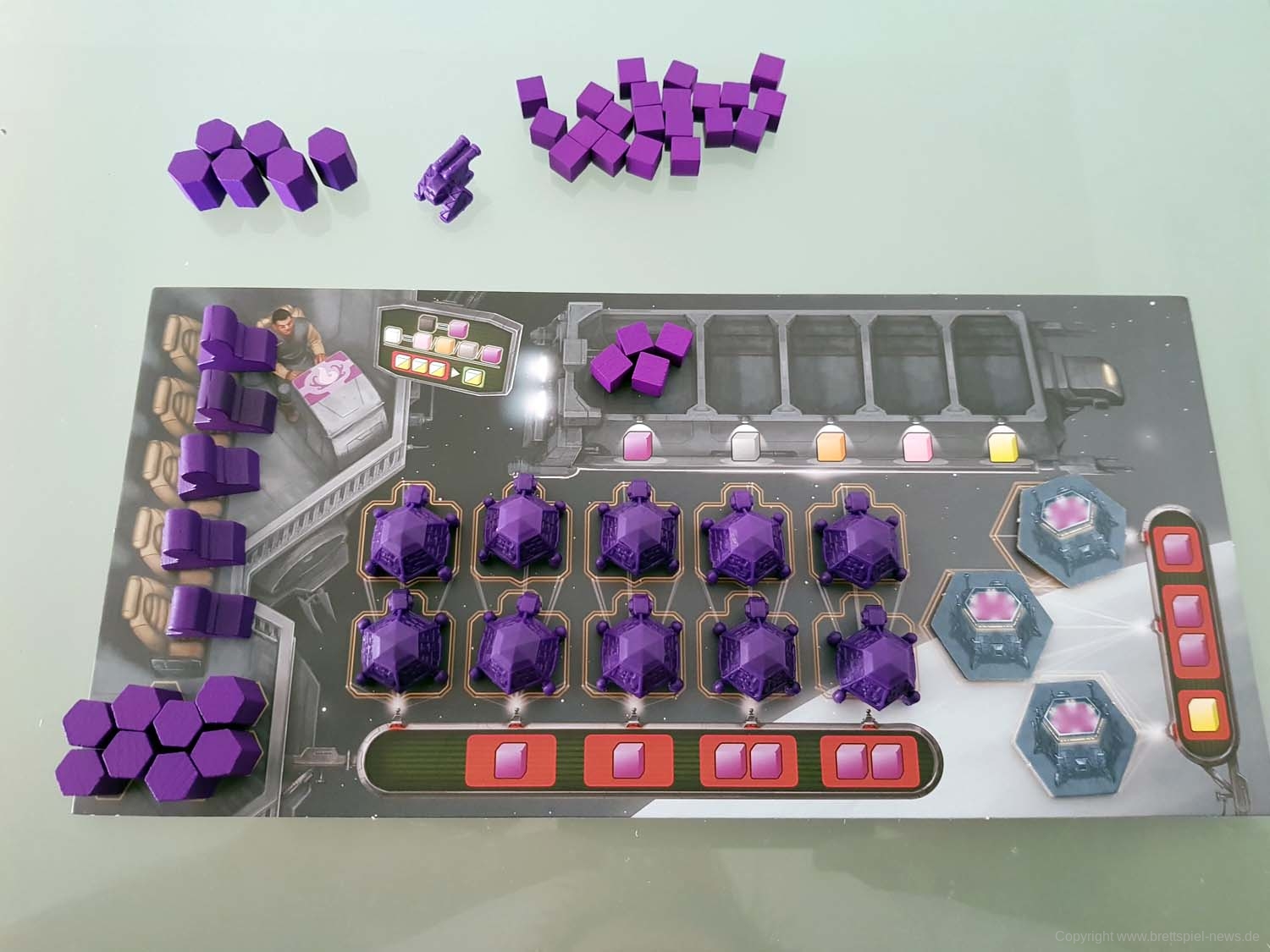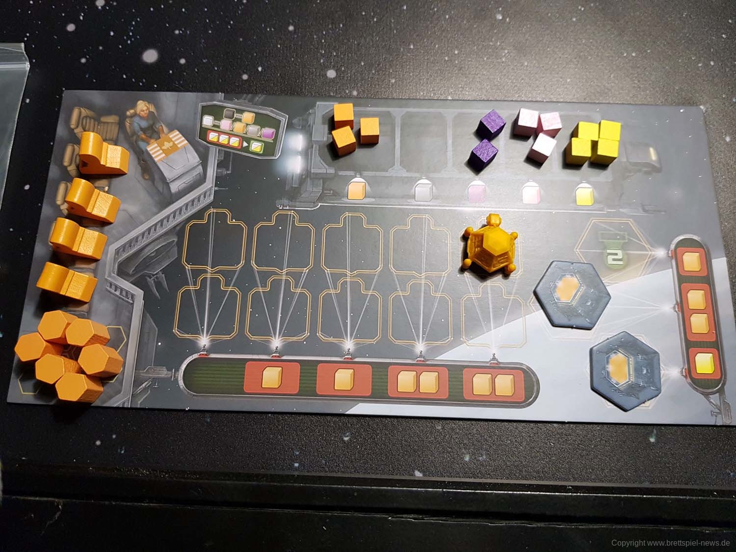 - A) einen Aktionsmarker von der oberen Platte nimmt und ihn auf die untere Aktionsplatte setzt, um entweder Ressourcen zu gewinnen oder für eine Bewegung auf der Planetenoberfläche zu bezahlen, oder