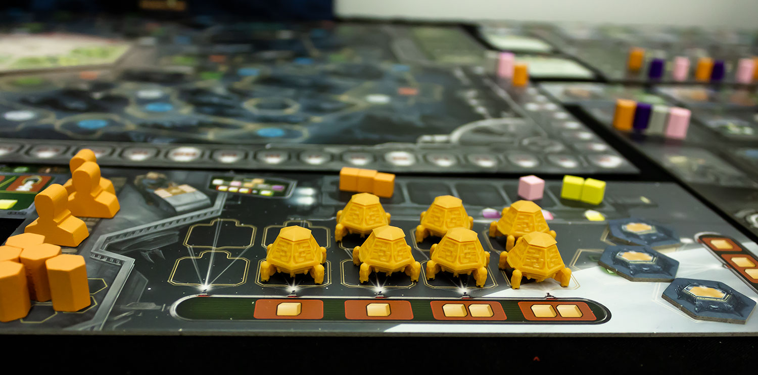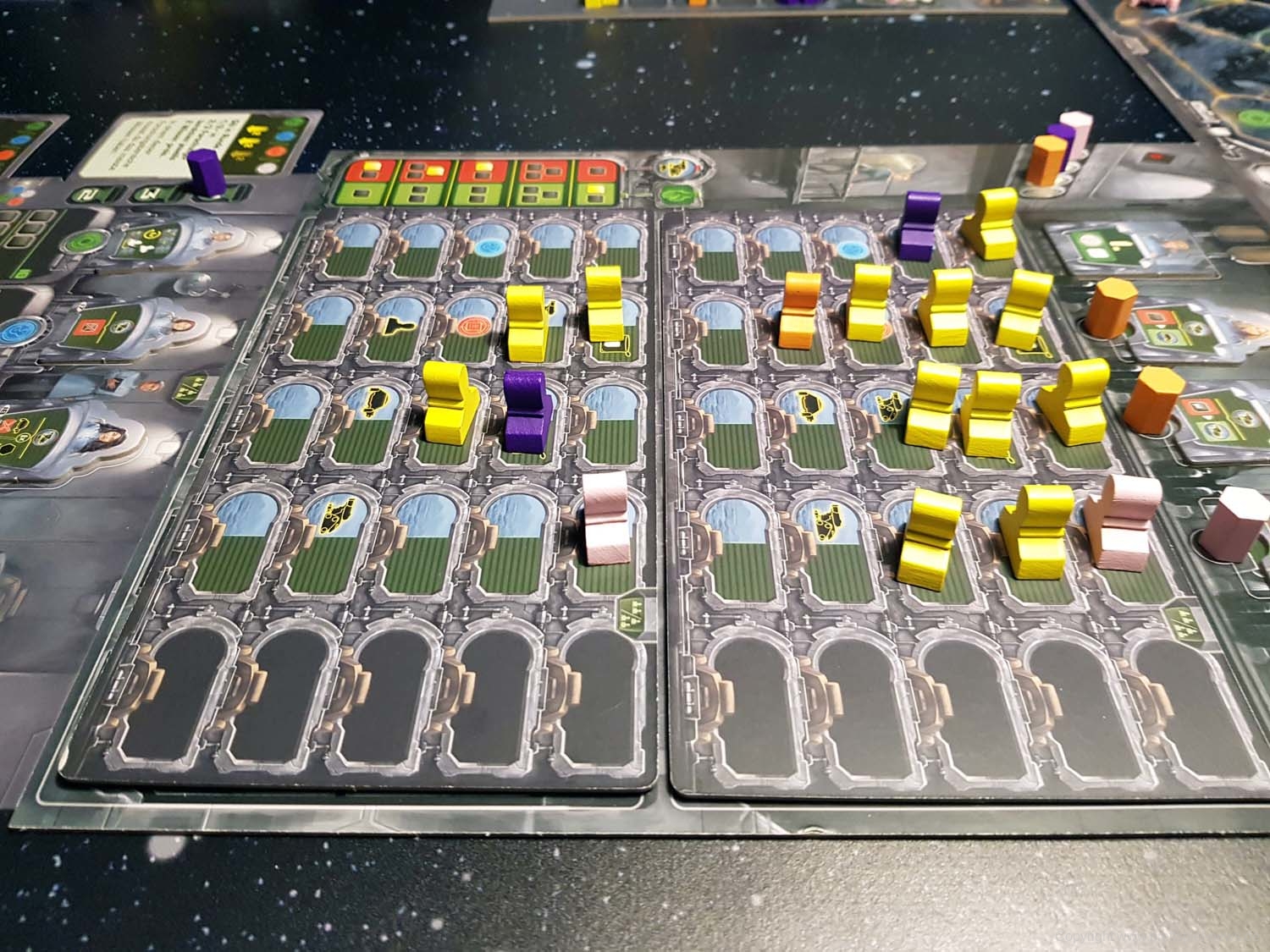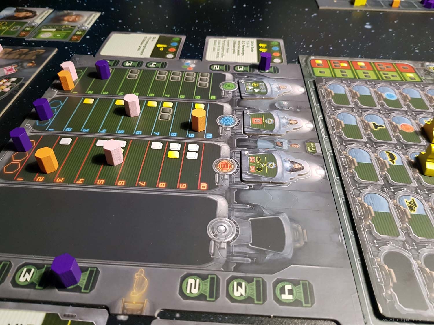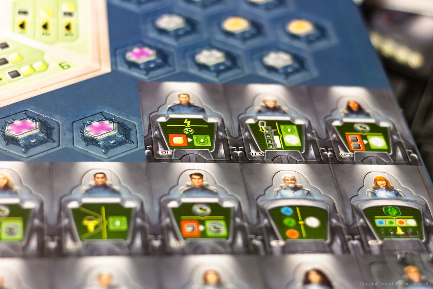- A) einen Aktionsmarker von der oberen Platte nimmt und ihn auf die untere Aktionsplatte setzt, um entweder Ressourcen zu gewinnen oder für eine Bewegung auf der Planetenoberfläche zu bezahlen, oder
