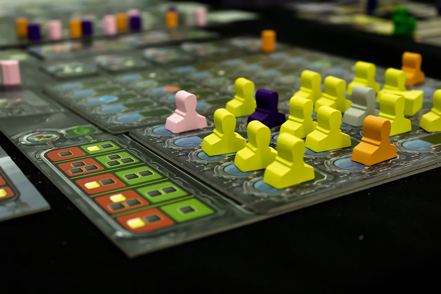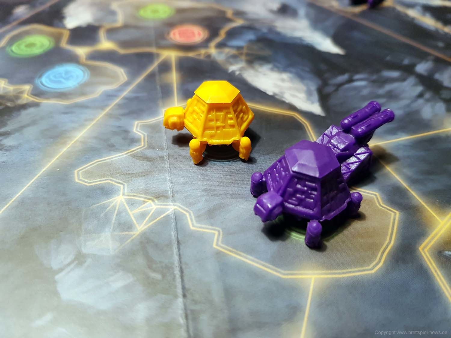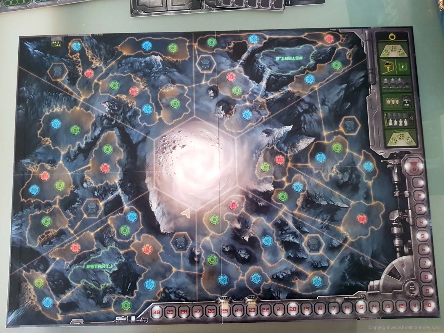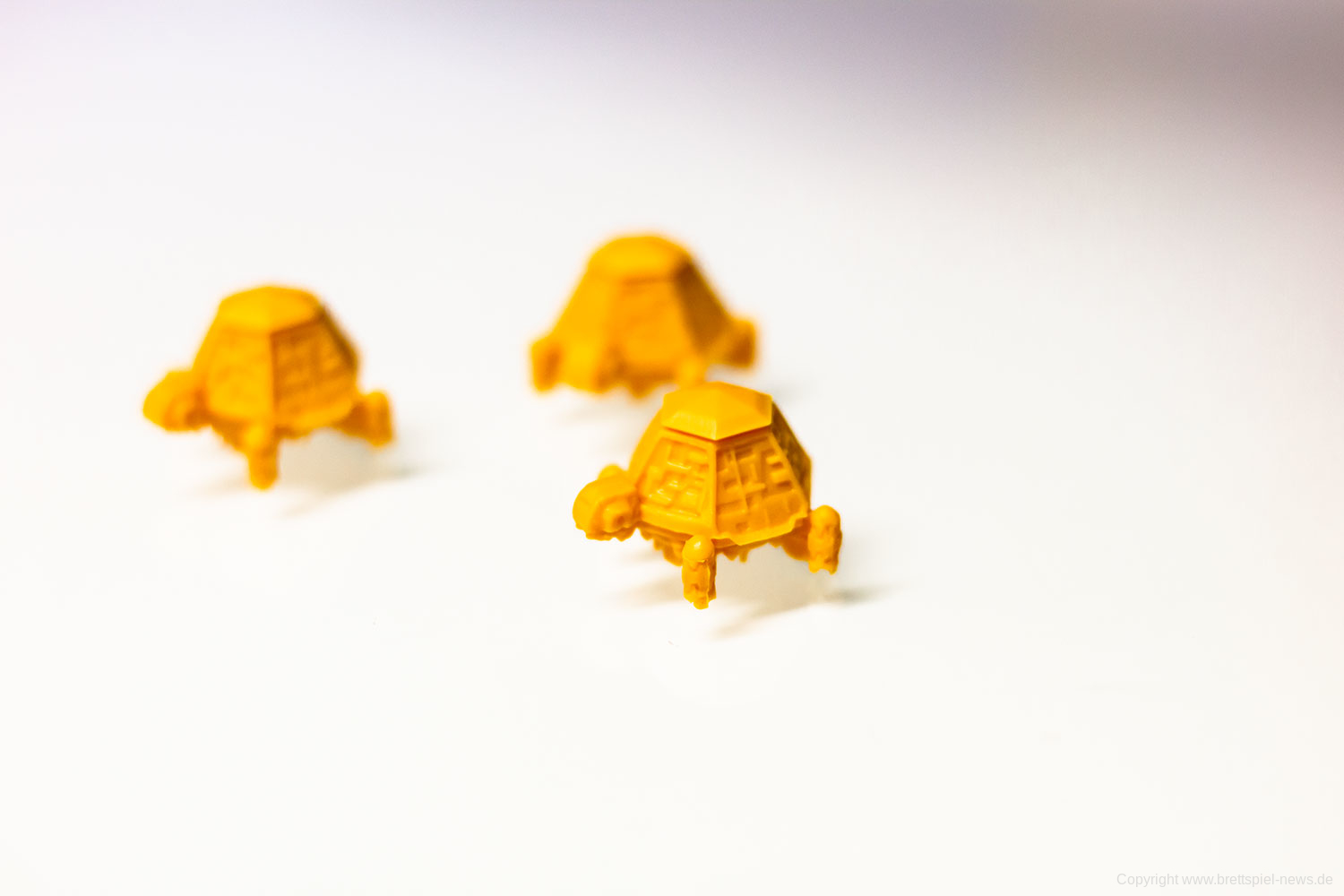 - A) einen Aktionsmarker von der oberen Platte nimmt und ihn auf die untere Aktionsplatte setzt, um entweder Ressourcen zu gewinnen oder für eine Bewegung auf der Planetenoberfläche zu bezahlen, oder