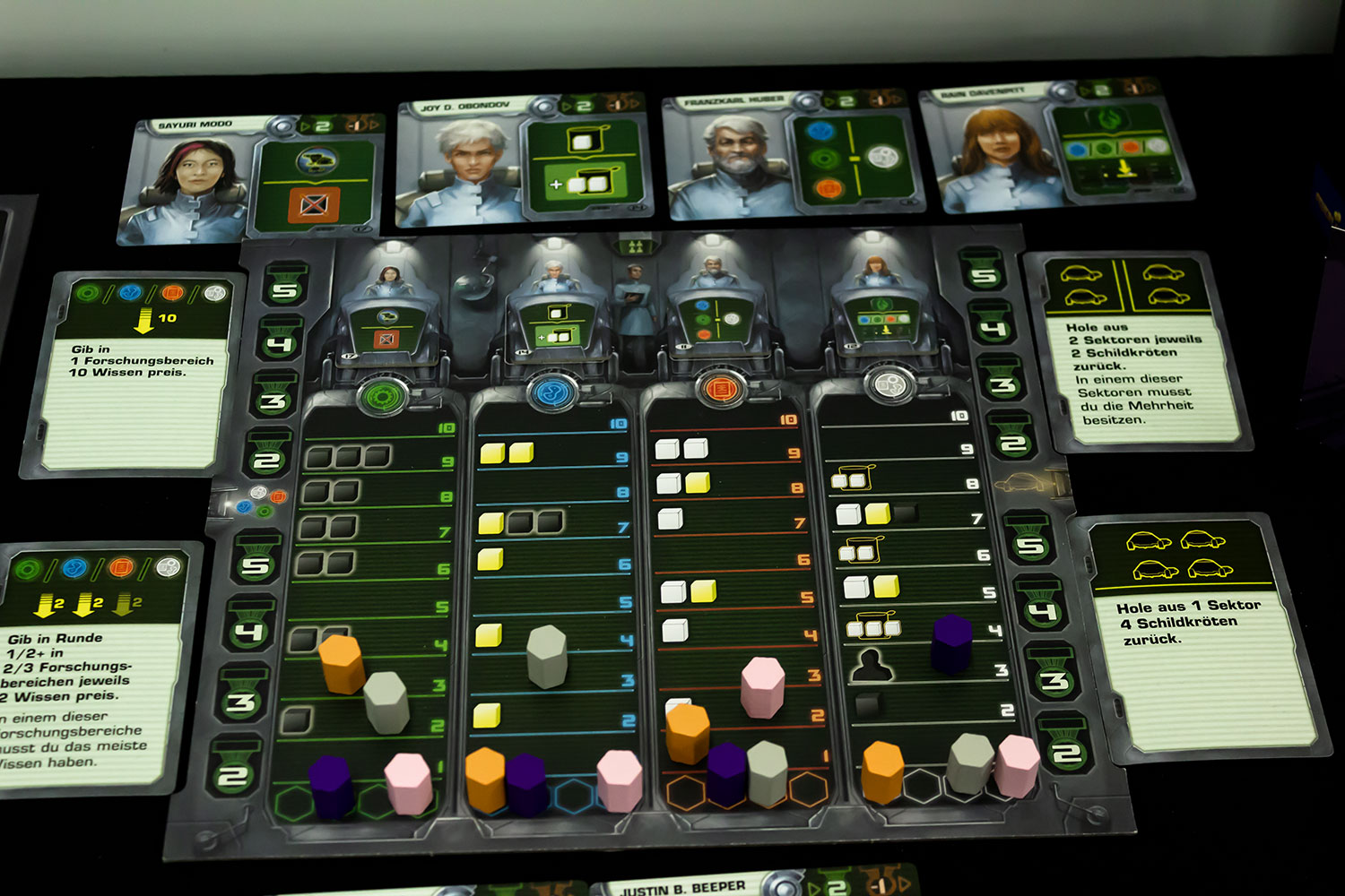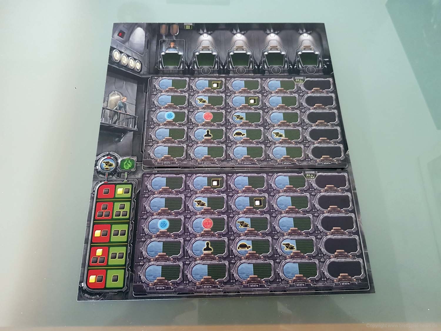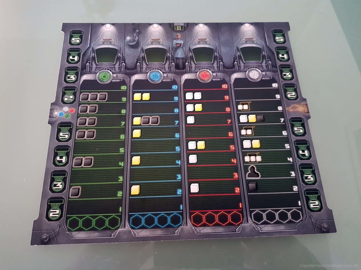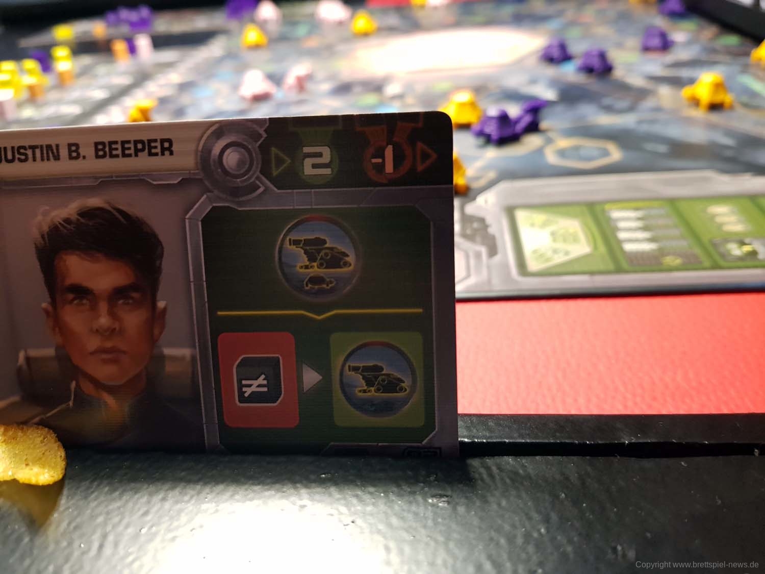 - B) zahlt für jedes Action-Token, das noch in einer bestimmten Spalte auf dem oberen Panel steht, um die Kontrolle über den Kommandanten und seine Fähigkeit oben auf diesem Panel zu erlangen, woraufhin der Spieler diese Action-Token auf dem unteren Panel platziert.