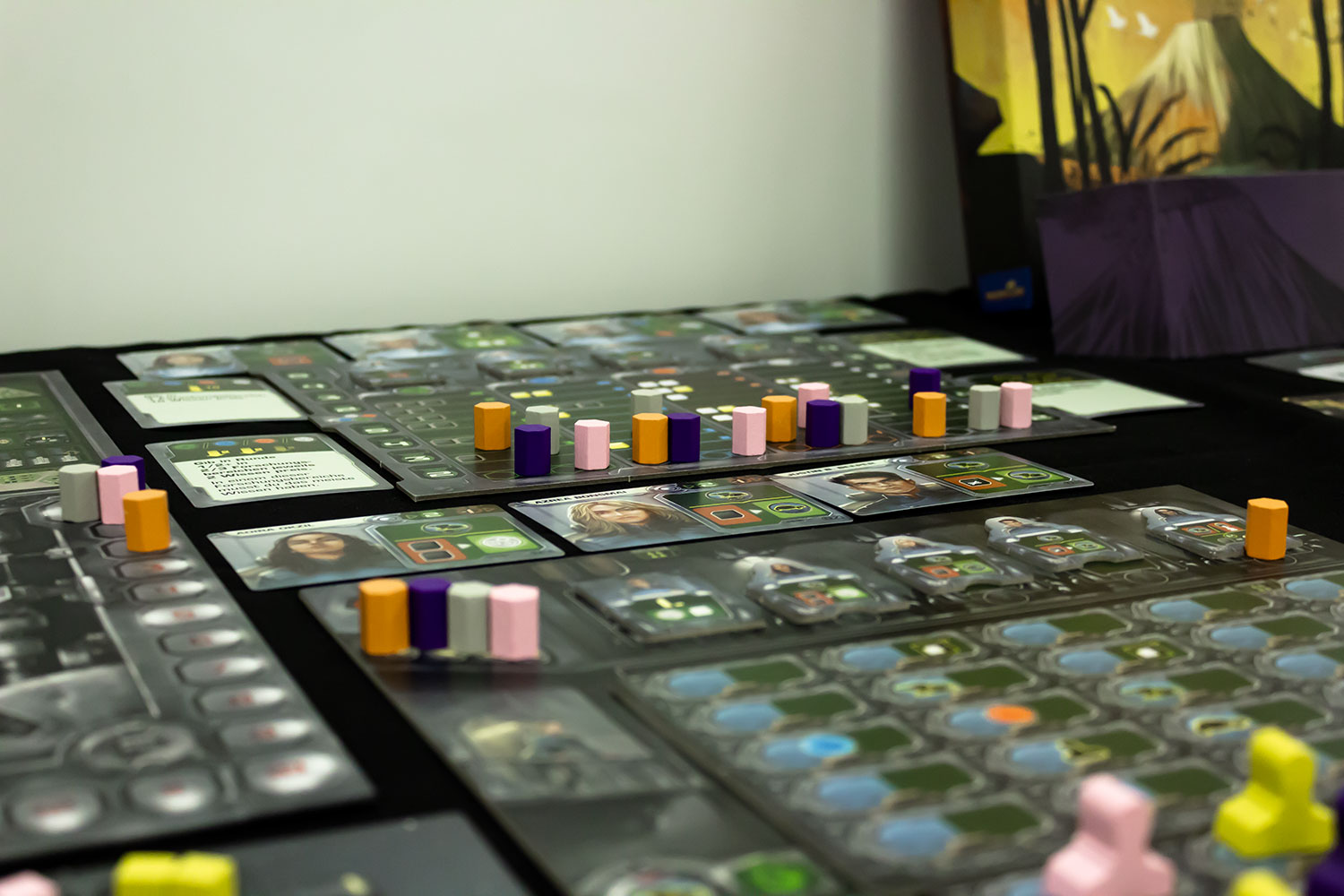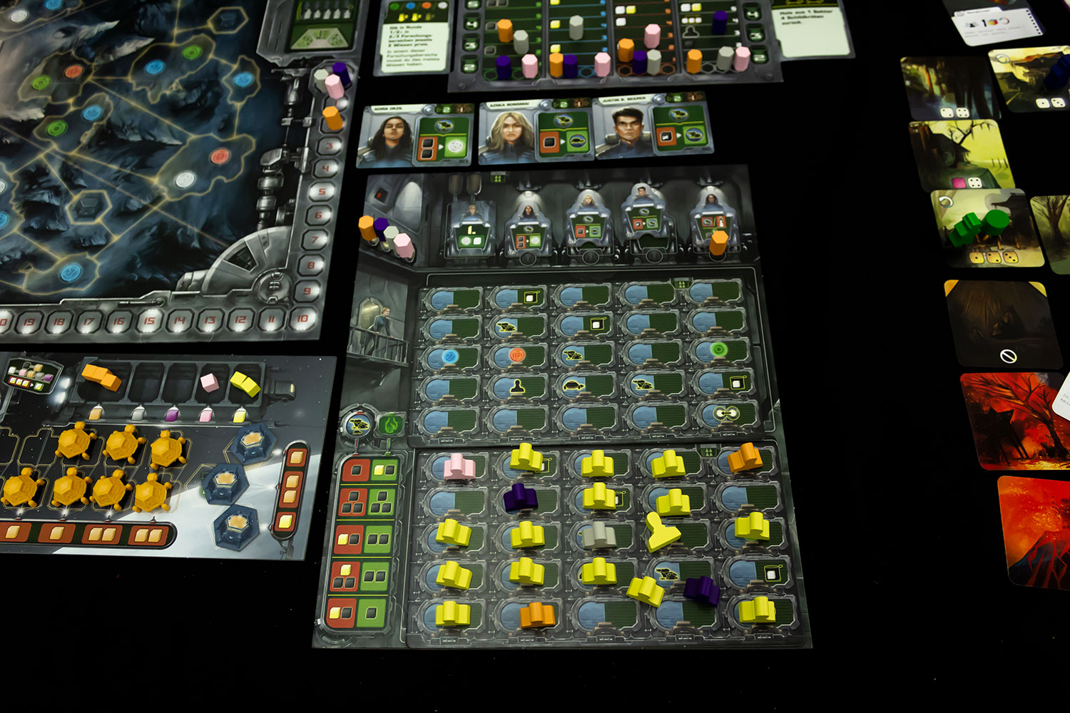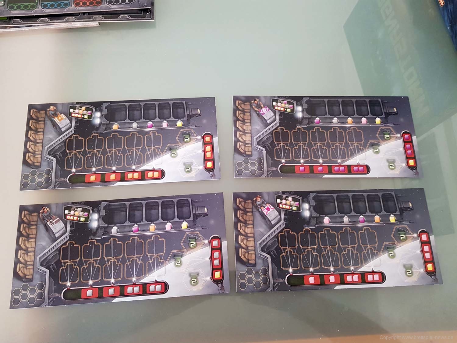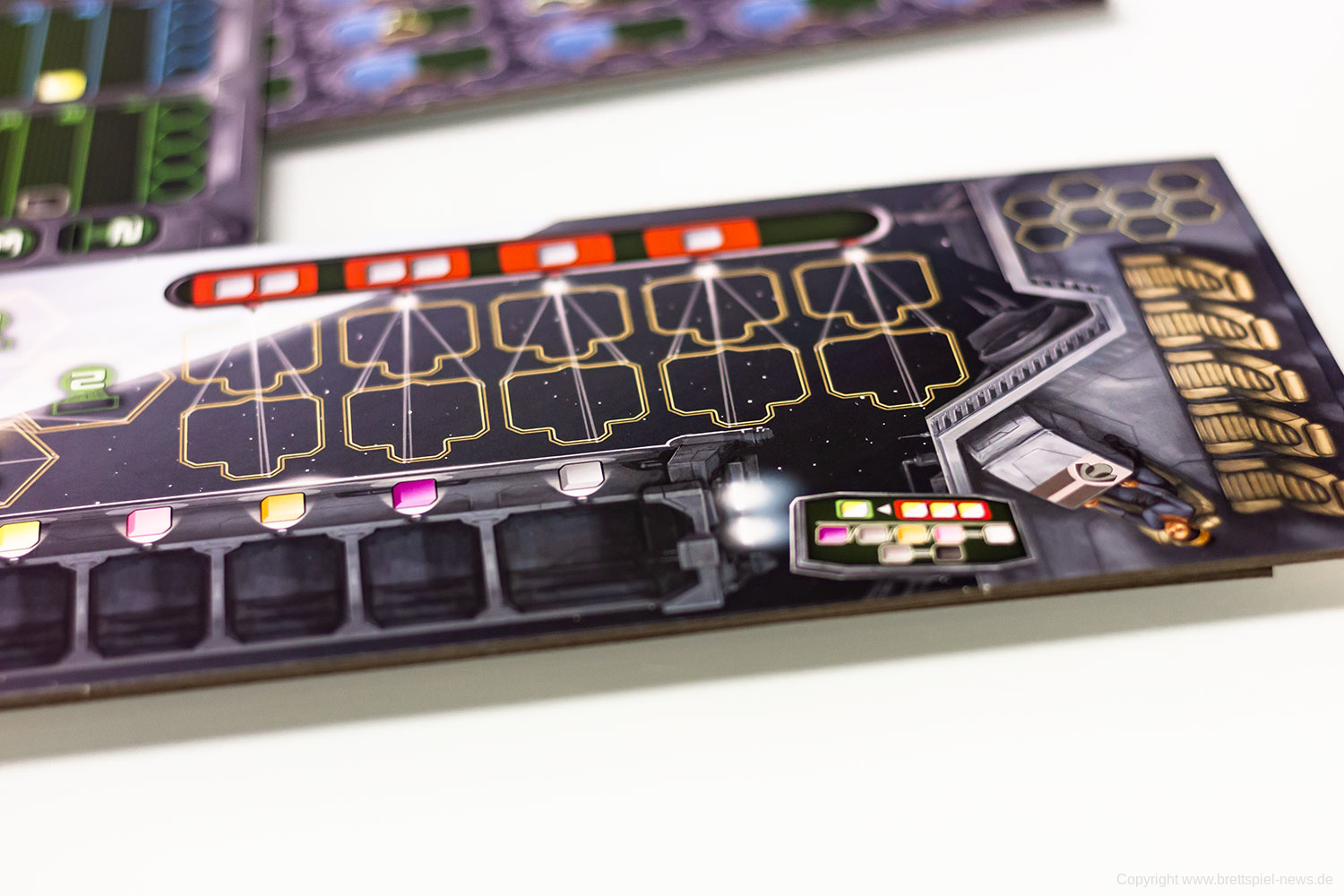 - B) zahlt für jedes Action-Token, das noch in einer bestimmten Spalte auf dem oberen Panel steht, um die Kontrolle über den Kommandanten und seine Fähigkeit oben auf diesem Panel zu erlangen, woraufhin der Spieler diese Action-Token auf dem unteren Panel platziert.