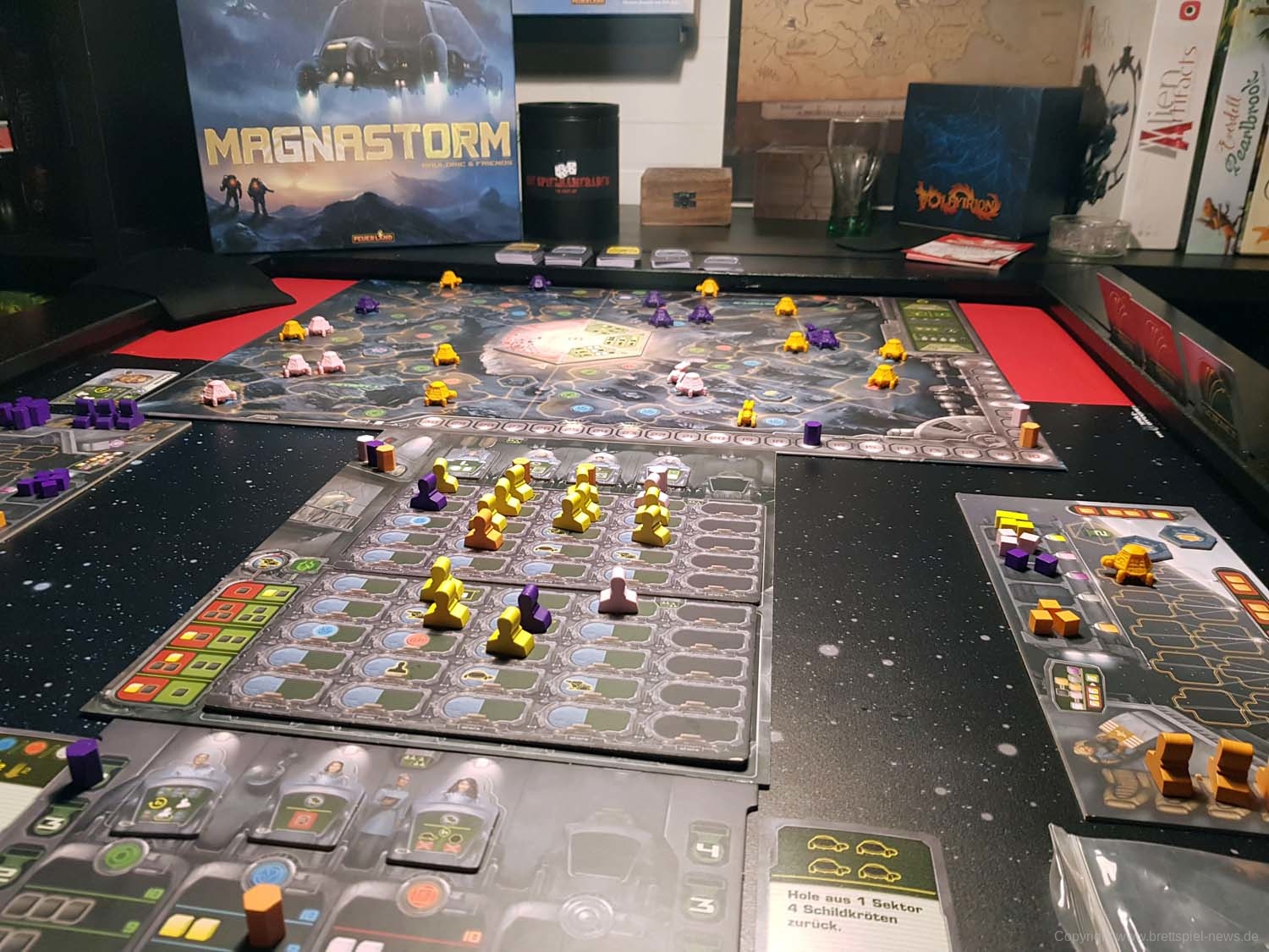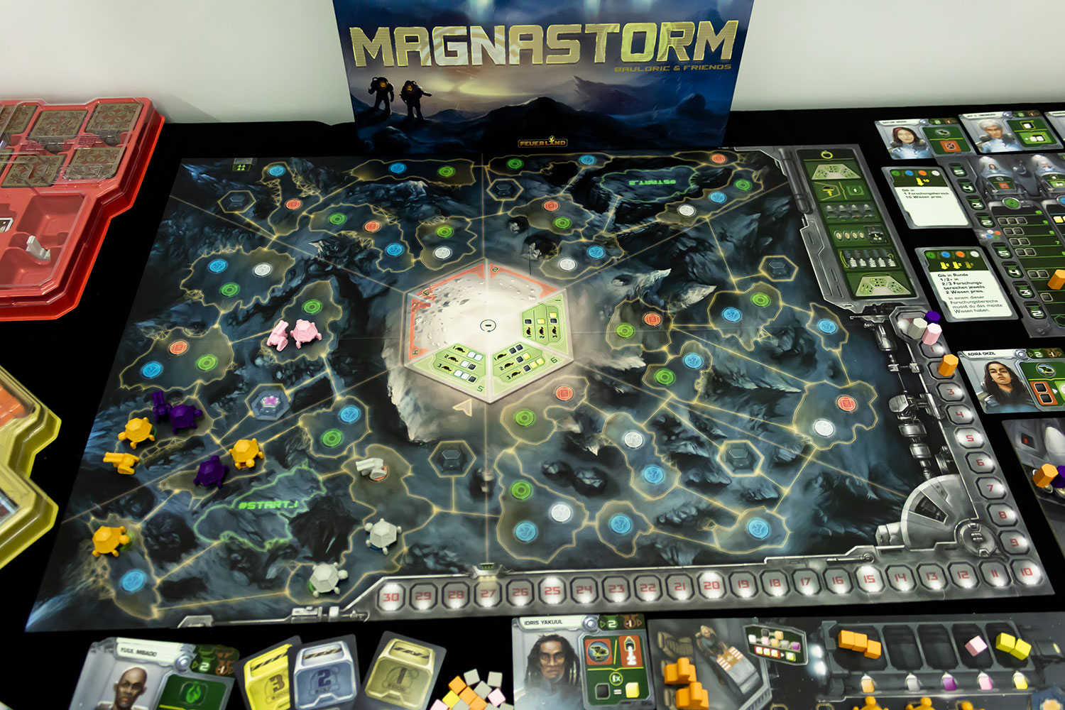 Das Ziel von Magnastorm ist es, der erste Spieler mit einer bestimmten Anzahl von Reputationspunkten zu sein. Sie erwerben Reputation vor allem durch die Erfüllung von Zielen, die Übernahme der Kontrolle über einen oder mehrere der acht Kommandanten und den Bau von Sendern. Der Ablauf des Spiels wird durch eine Aktionstafel mit zwei Aktionstafeln gesteuert, die jeweils aus fünf Spalten bestehen. Zu Beginn jeder Runde stehen in jeder Spalte auf der oberen Aktionsfläche 3-5 Aktionsmarken (Besatzungsmitglieder). Um eine Aktion auszuführen, einen Spieler: