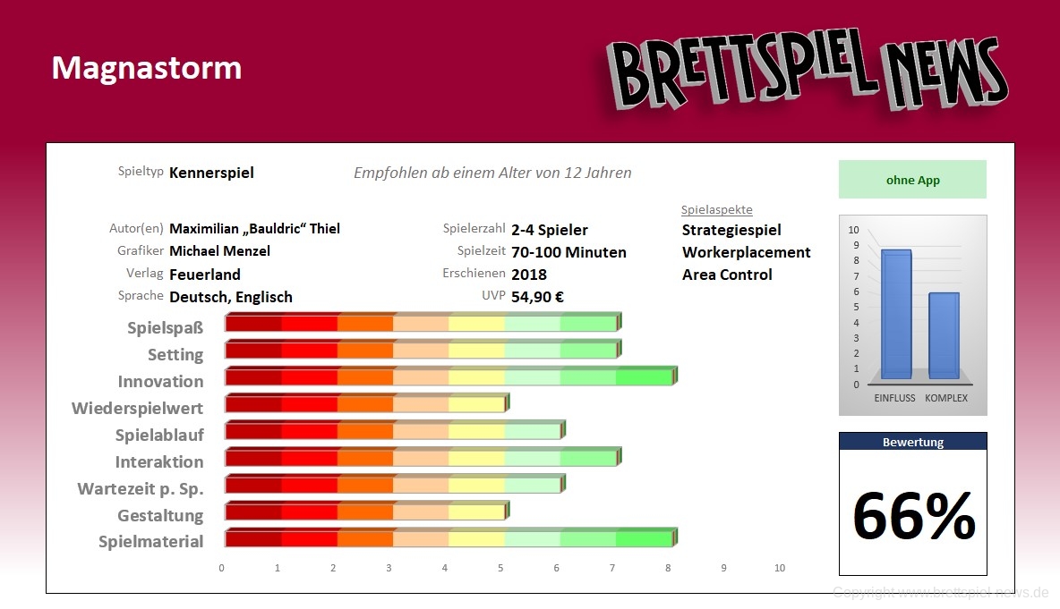 Magnastorm ist ein großes, taktisches Brettspiel mit sehr wenig Glück. Wählen Sie den richtigen Zeitpunkt, um Aktionen durchzuführen oder Einfluss auf hilfreiche Kommandanten zu nehmen. Du wirst Erfolg haben durch Ressourcenmanagement, clevere Logistik, gutes Timing und ein kluges Auge auf das Handeln deiner Gegner. Am Ende des Spiels erhält jeder Spieler eine von 120 Belohnungskarten, die in späteren Spielen verwendet werden können, um unterschiedliche Fähigkeiten der Spieler auszugleichen.