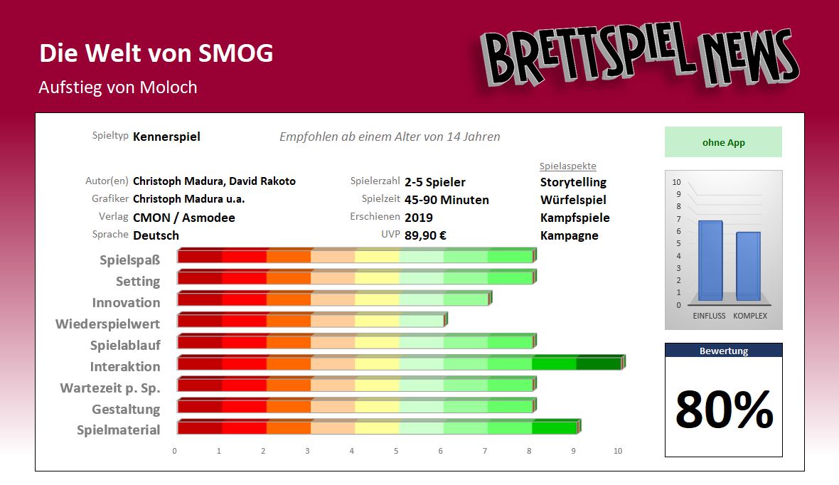 "Die Welt von SMOG" ist ab sofort im Fachhandel verfügbar und wird exklusiv nur in den Asmodee Flagship-Stores verfübar sein. Das CMON Spiel wurde bereits von zahlreichen Spielern erwartet. Wir haben ein Exemplar vom Verlag erhalten und werden in den nächsten 14 Tagen einen Test veröffentlichen. Vorab aber schon einmal Bilder vom Spielmaterial, das schon sehr einladend geraten ist. Das Spiel kann die Spieler auf Boardgamegeek überzeugen und heimst sich eine sehr gute Bewertung mit 8.1 von 10 Punkten ein. Es ist für 2-5 Spieler ab 14 Jahren und bietet rund 45-90 Minuten Spielzeit. Das Spiel stammt gleich von einem Autoren Quintett: Fel Barros, Christophe Madura, Alexandru Olteanu, David Rakoto und Michael Shinall sind verantwortlich für das Spiel.
