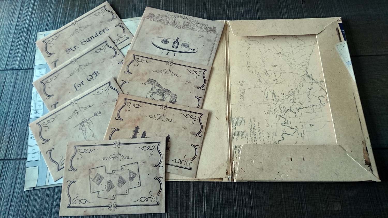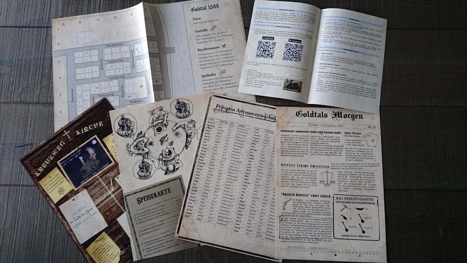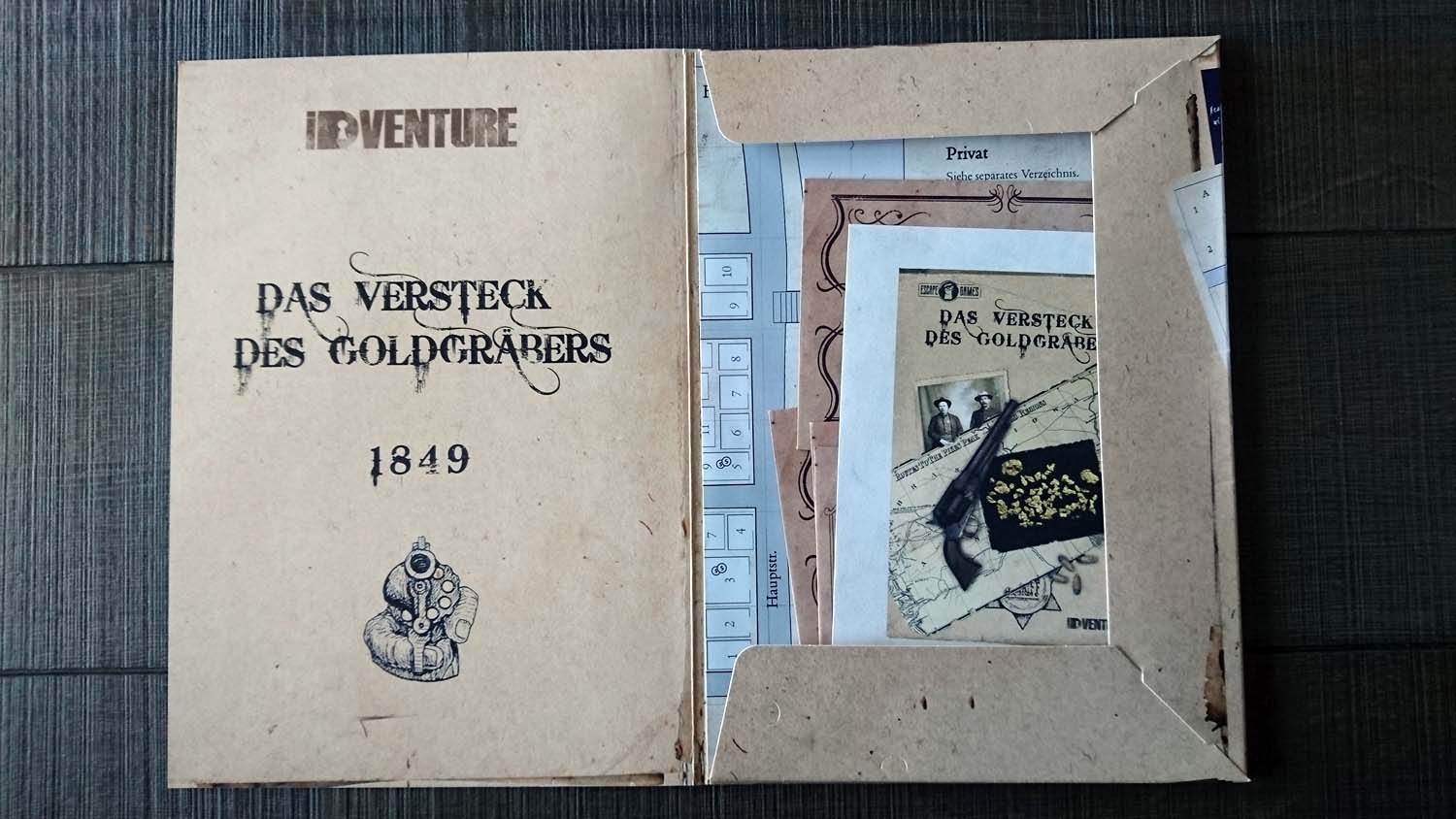 Bei "Das Versteck des Goldgräbers" handelt es sich um eine Fortsetzung der "Escape Games"-Reihe, nachdem diese mit "Der unvollendete Fall von Holmes" letztes Jahr gestartet wurde. Diesmal führt sie euch in den Wilden Westen, inmitten der Goldrauschstimmung. Es ist eure Aufgabe, den Mord an zwei Personen aufzuklären. Die Version, die auf der SPIEL DOCH! zu kaufen war hatte noch keinen Umkarton. Das Spiel wurde noch in einer passend gestalteten, eingeschweißten Mappe verkauft.