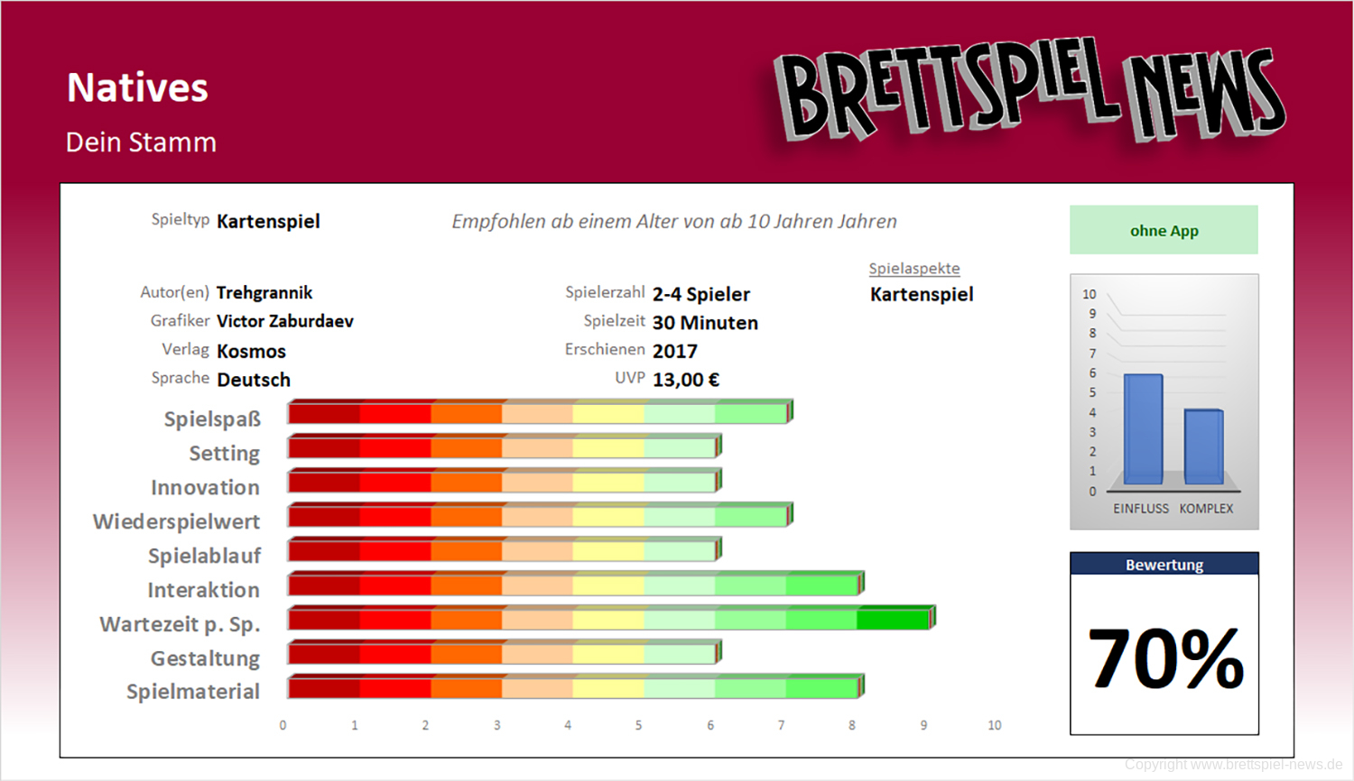 Natives ist ein Kartenspiel, bei dem jeder Spieler eine Rolle als Stammesführer übernimmt und seinen Stamm durch geschicktes Ressourcenmanagement zum Wohlstand führt. Dabei muss die Richtige Mischung aus Kriegern, Ältesten, Kundschafter oder Schamanen gefunden werden.