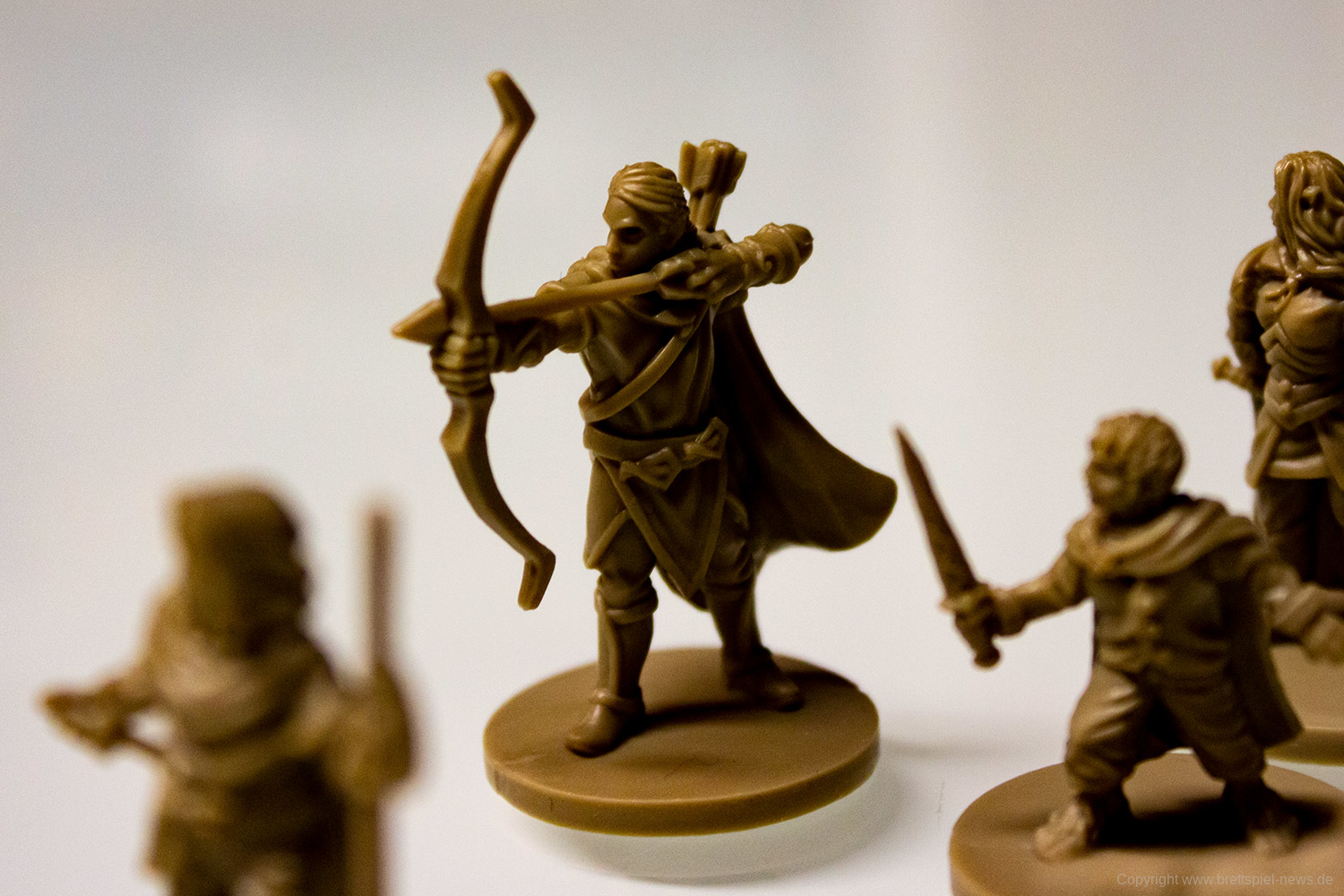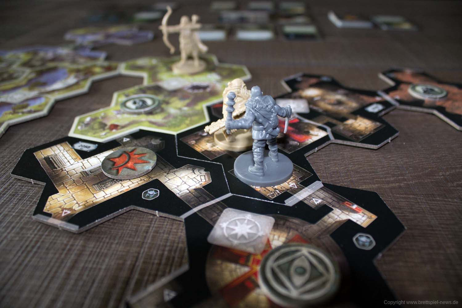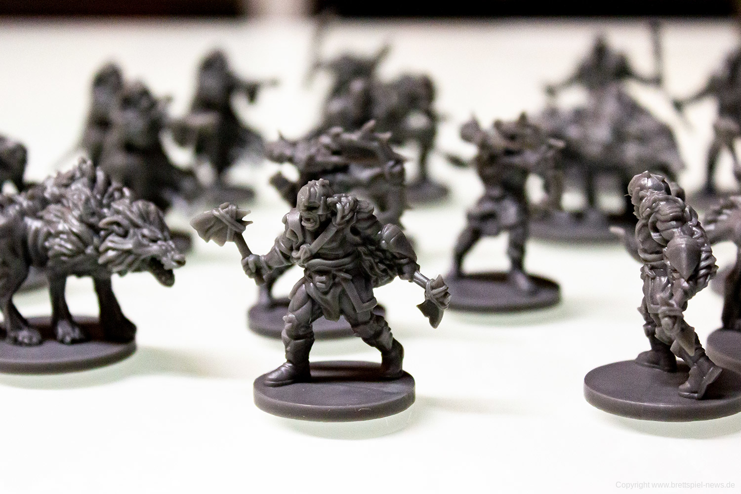 Der erste Eindruck vom Spielmaterial ist schon mal mehr als gut. Die Miniaturen sind ausgesprochen gut geworden, auch wenn der erste Eindruck im Beutel statt im Sortierkasten etwas anderes andeutete. Ansonsten sind die üblichen Karten und Spielmaterial enthalten, die dem Fanatsy-Flight Standard entsprechen.
