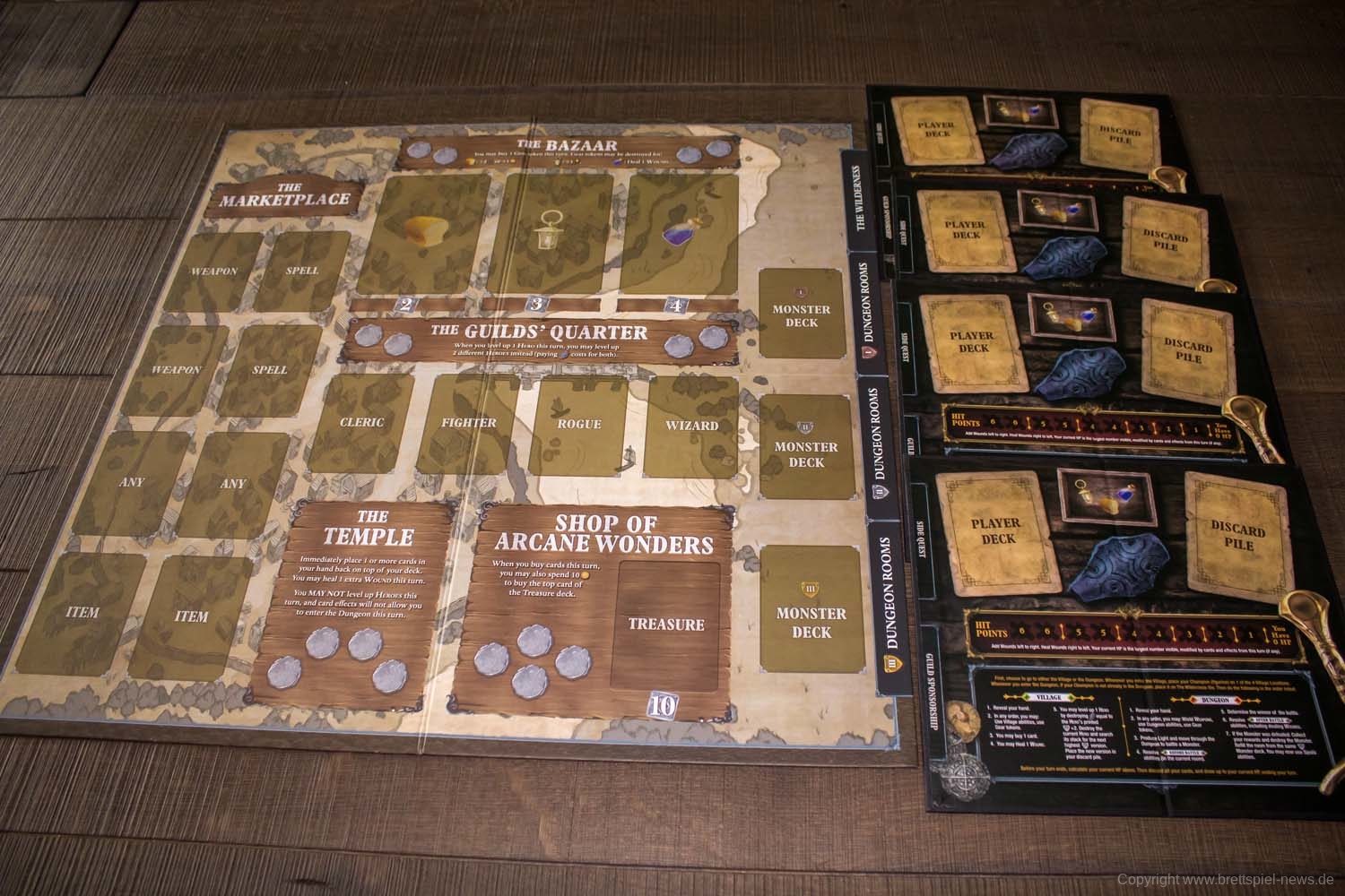Das Deck jedes Spielers stellt eine Gruppe von hartnäckigen Abenteurern dar, die sich den Herausforderungen des Dungeons stellen und sie besiegen werden und ins Dorf zurückkehren werden, um sich zu erholen und neu auszurüsten.