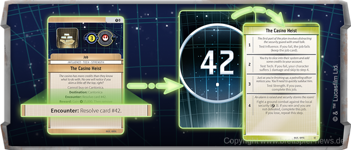 Jeder Job enthält eine Liste von Fähigkeiten, die nützlich sein werden, um ihn zu vervollständigen. Boba Fett mag ein Experte darin sein, Kopfgelder mit Taktik und Heimlichkeit einzukassieren, aber Lando Calrissian mit seinem Einfluss und Wissen ist ein besserer Teilnehmer an einem hochrangigen Sabacc-Spiel. Während einige Jobs von euch fordern, eine Kompetenzprobe abzulegen, um den Erfolg zu bestimmen, gehen andere, wie der riskante Casino-Raub, mehr in die Tiefe.