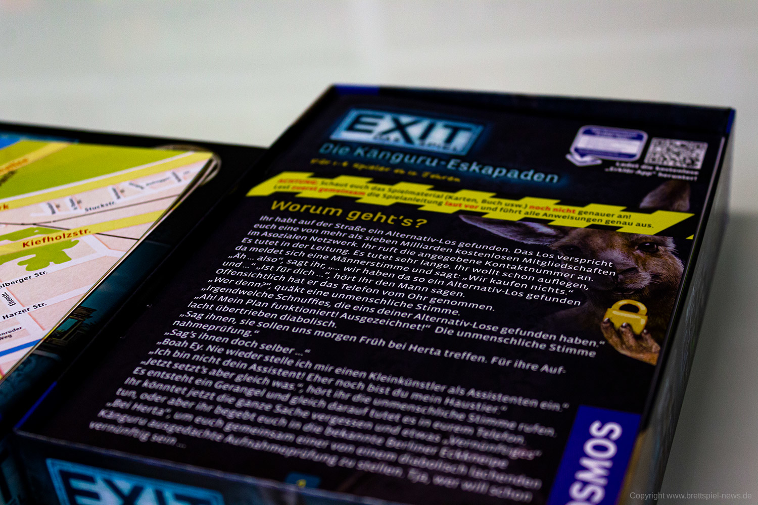 Clever, witzig und frech! Der Inhalt dieser Spiele-Box bietet einer Gruppe von ein bis vier Personen ein außergewöhnliches Spielerlebnis für einen lustigen und unvergesslichen Abend. Denn bei den Känguru-Eskapaden dreht sich alles um einen Aufnahmetest der Schnuffies ins Asoziale Netzwerk. Ob sie es in der vorgegebenen Zeit schaffen werden? Das ist gar nicht so einfach, weshalb bei diesem Spiel Teamgeist und eine Portion Querdenken gefragt ist. Ein ungewöhnliches EXIT Abenteuer in der Welt von Marc-Uwe Klings Känguru-Trilogie!