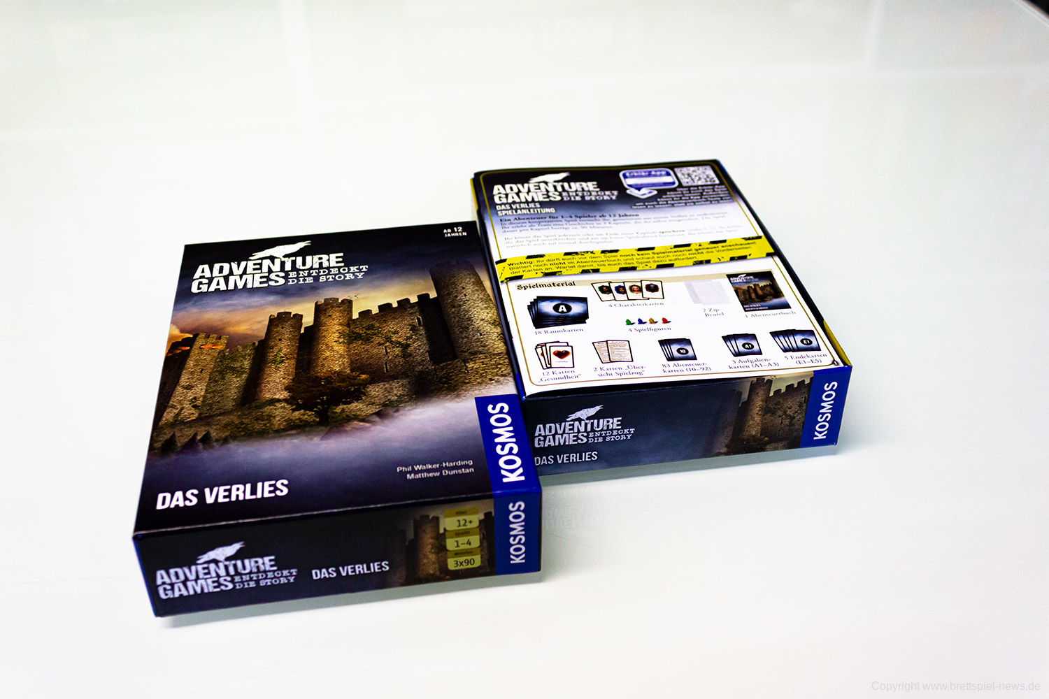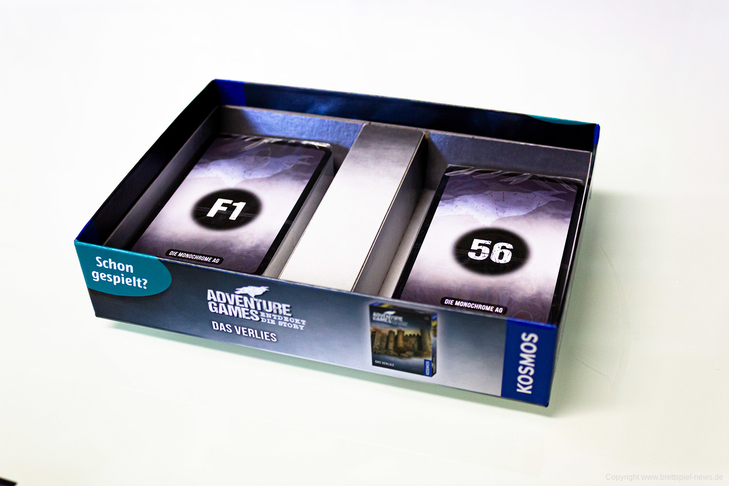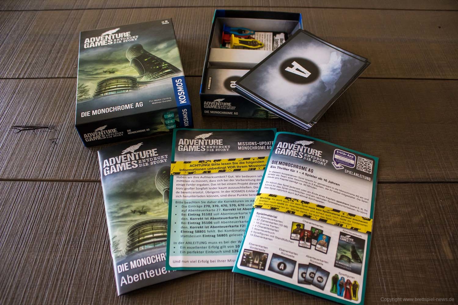 Wir haben die ersten zwei „Adventure Games“ von Kosmos erhalten und wollen Euch vor dem Test schon einmal erste Bilder vom Spielmaterial zeigen. Zum Start werden „Die Monochrome AG“ und „Das Verlies“ erscheinen. Beide Spiele haben einen UVP von 14,99 € und richten sich an 1-4 Spieler. Die Spiele sollten schon bald im Handel verfügbar sein.
