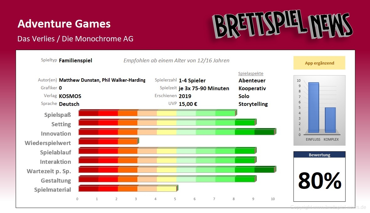 Orte erkunden, Gegenstände kombinieren, Geschichten erleben: Mit den "Adventure Games" veröffentlicht der KOSMOS Verlag im Frühjahr 2019 eine neue Brettspielreihe zum Trendthema kooperative Event-Spiele. Gemeinsam mit den Autoren Phil Walker-Harding und Matthew Dunstan sind zunächst zwei Spiele zu unterschiedlichen Themen geplant. Das erste Abenteuer der spielbaren Geschichten führt Spieler ab 12 Jahren in "Das Verlies", während der Thriller "Die Monochrome AG" für Spieler ab 16 Jahren geeignet ist. Beide Titel eigenen sich für ein bis vier Personen und bestehen aus drei Kapiteln mit je etwa 75 Minuten.