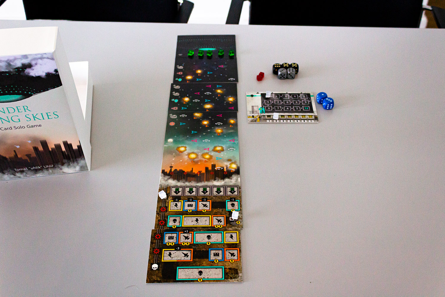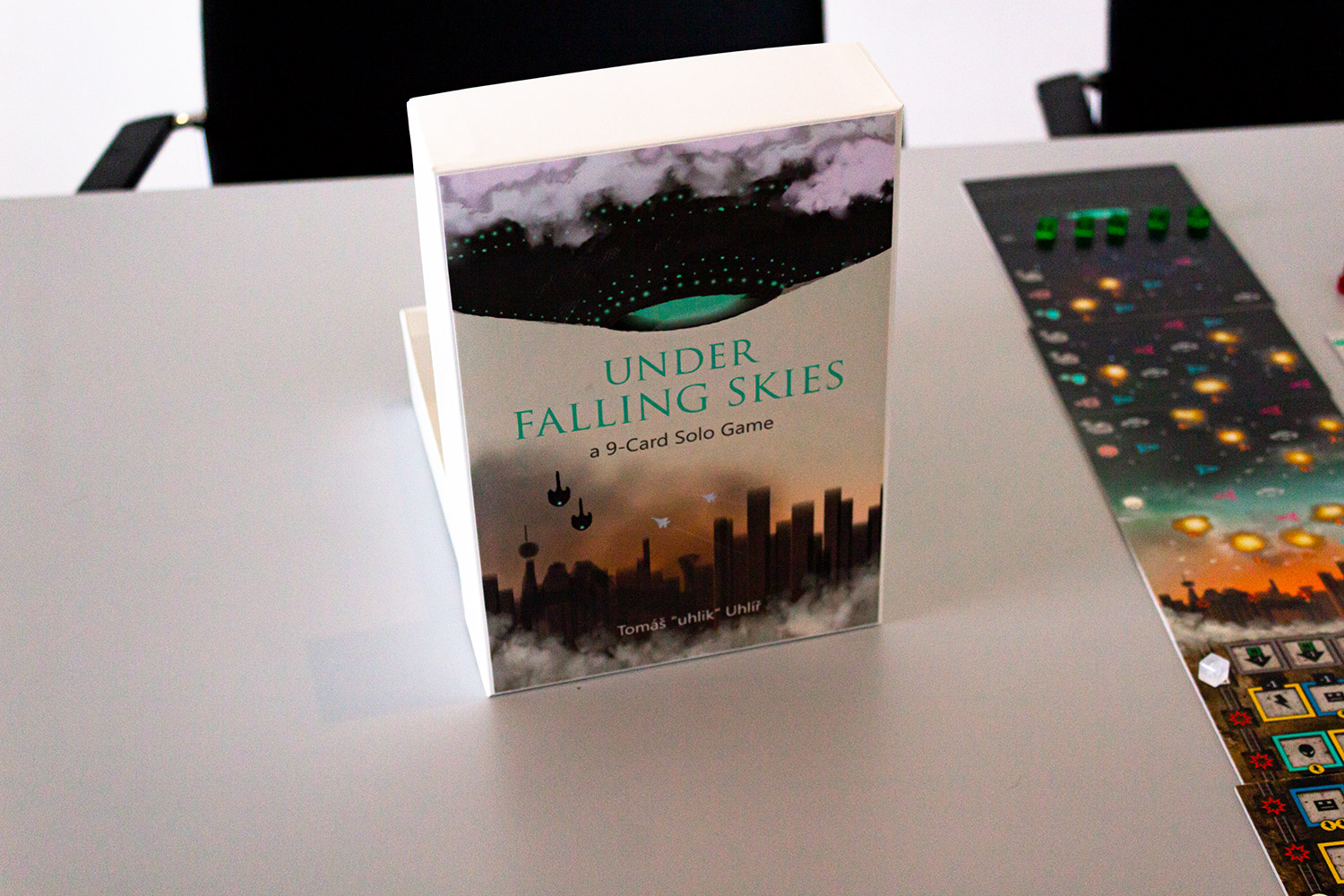 „Under Falling Skies“ ist ein Einspieler-Spiel von Tomas Uhlir, das auch in Deutschland erscheinen soll. Das Spiel dauert rund 20-40 Minuten und soll anspruchsvoller sein. Under Falling Skies ist vormals ein kostenloses Print&Play-Spiel gewesen, das für den 9-Karten-Nanospiel-P&P-Design-Wettbewerb 2019 entwickelt wurde. Nun soll es kommerziell erscheinen.