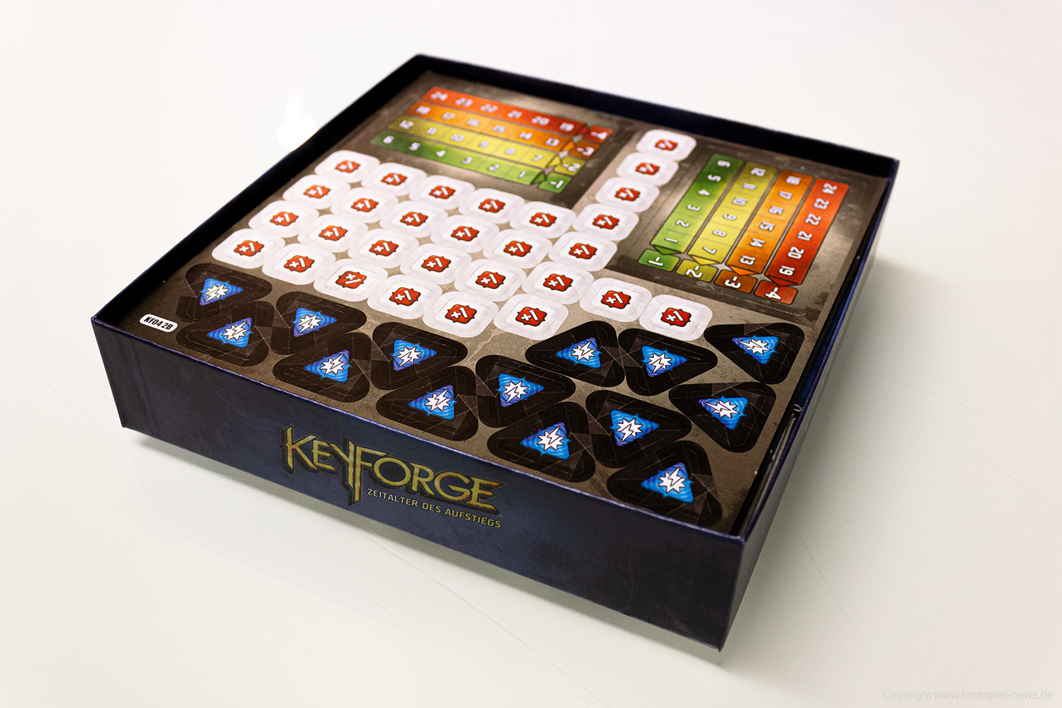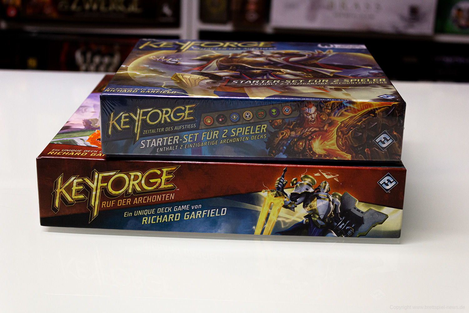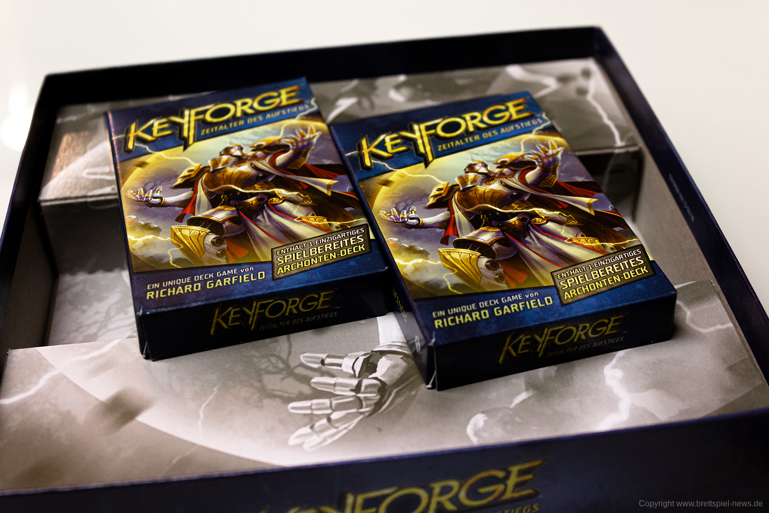 Das erste Keyforge bekommt nun mit "Zeitalter des Aufstiegs" Verstärkung. Die deutlich kleinere Box bringt neue Decks, die Teile von 204 neue Karten enthalten, die mit 166 bekannten Karten aus dem ersten Teil gemischt gänzlich neue Decks bieten. Zusätzlich bietet sie nun eine auf Papier gedruckte Spielfläche.