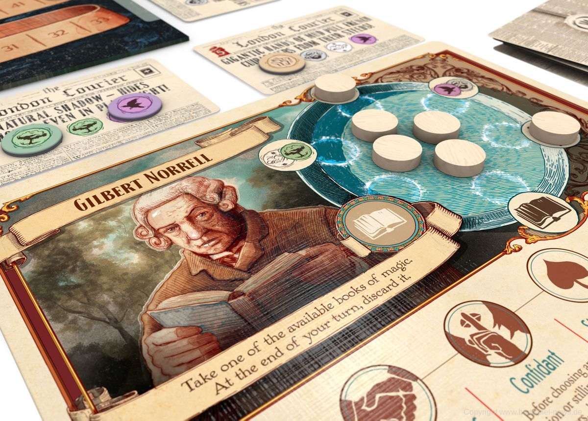 Bei OSPREY Publishing ist interessantes Spiel erschienen, das aktuell jedoch nur in englischer Sprache verfügbar ist. Es trägt den Titel „Jonathan Strange & Mr Norrell: A Board Game of English Magic“ und stammt von den Autoren Marco Maggi, Francesco Nepitello und Susanna Clarke. Es lässt sich mit 2-4 SpielerInnen spielen und bietet laut Verlag 60-80 Minuten Spielzeit. Auffallend gut ist die Optik, die sich deutlich vom bunten niedlichen Einerlei abhebt. Das Zauberer-Setting ist spätestens seit Trickerion bekannt und beliebt, dürfte hier jedoch etwas weniger episch auf den Spieltisch kommen.