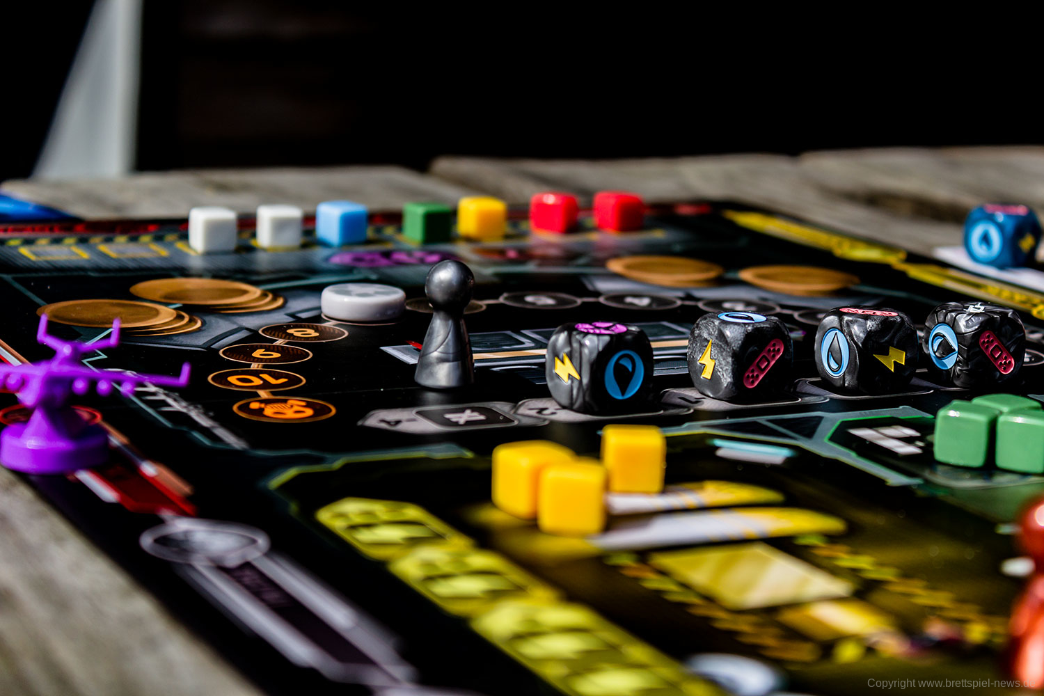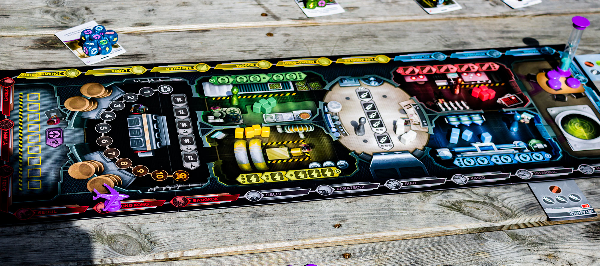 Die Spielbox ist sehr dick produziert. Die Optik des sehr großen Spielplans weiß ebenfalls auf den ersten Blick zu überzeugen. Die Karten sind gut gedruckt und haben eine gute Haptik. Die Würfel sind richtig hübsch geraten und auch die sonstigen Marker sehen gut aus. Für ein Spiel das mal eben zwischendurch gespielt werden kann ist die Produktionsqualität auf einem sehr hohen Produktionsniveau.