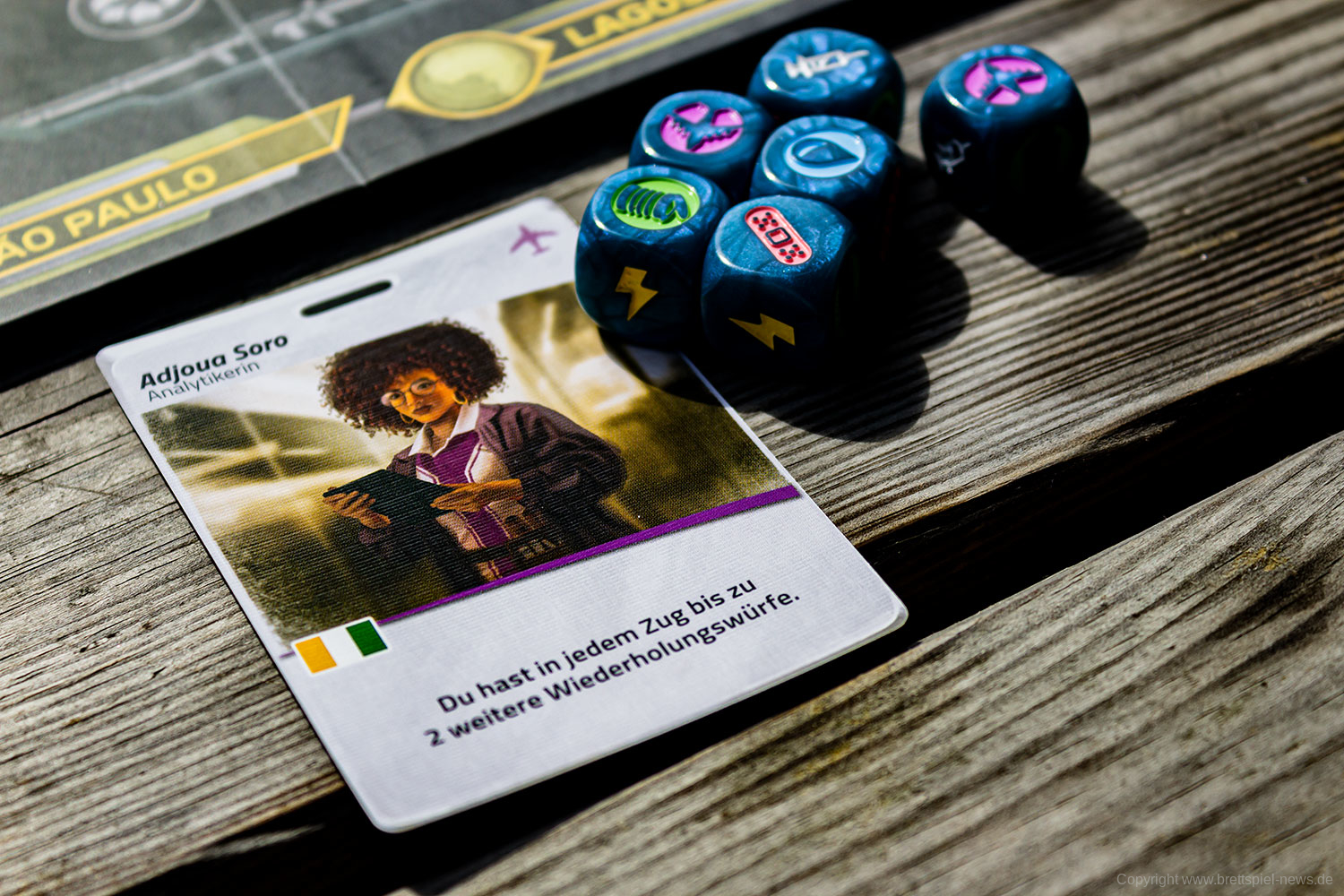 Die Nationen der Welt haben ihre Ressourcen gebündelt und eine vielfältige Besatzung zusammengestellt. Jede der sieben einzigartigen Rollenkarten hat ihre eigene Fähigkeit. Der Analytiker, Adjoua Soro, ist in der Lage, die Würfel bis zu zwei weitere Male zu würfeln. Der Ingenieur, Soojin Sohn, kann jedes Werkzeugergebnis mit einer Ebene in ein anderes Symbol umwandeln. Wechseln Sie so schnell wie möglich, nutzen Sie die einzigartige Fähigkeit Ihrer Rolle und weisen Sie Ihre Würfel strategisch so effizient wie möglich zu, wenn Sie Vorräte anlegen.