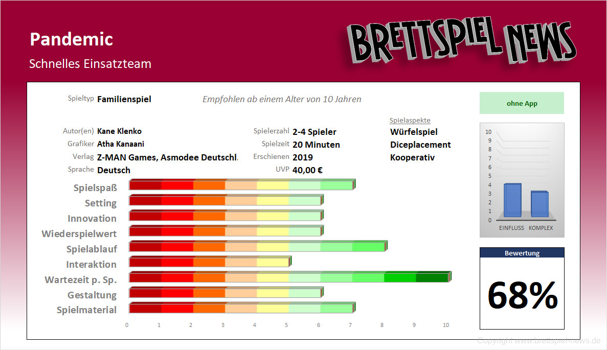 Pandemie: Schnelles Einsatzteam ist ein Wettlauf mit der Zeit. Würfeln Sie, um Vorräte zu erzeugen, das Flugzeug zu fliegen und Städte in Not zu beliefern. Wenn der Timer herunterzählt, müssen Sie sich schnell koordinieren und zusammenarbeiten, um auf neue Katastrophen zu reagieren. Werden Sie und Ihr Team in der Lage sein, rechtzeitig zu reagieren?