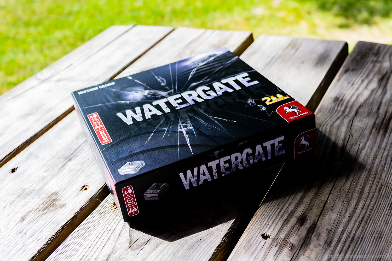 Watergate ist nach der Berlin Con auch im Handel angekommen. Die Neuheit von Frosted Games, erscheint im Vertrieb von Pegasus Spiele und stammt vom bekannten Autor Matthias Cramer. Das Spiel ist wie bei Frosted Games typisch für zwei Spieler ausgelegt, die den Watergate Skandal versuchen nachzuempfinden. Pegasus Spiele hat uns ein Exemplar zur Verfügung gestellt, weswegen wir es gleich ablichten können.