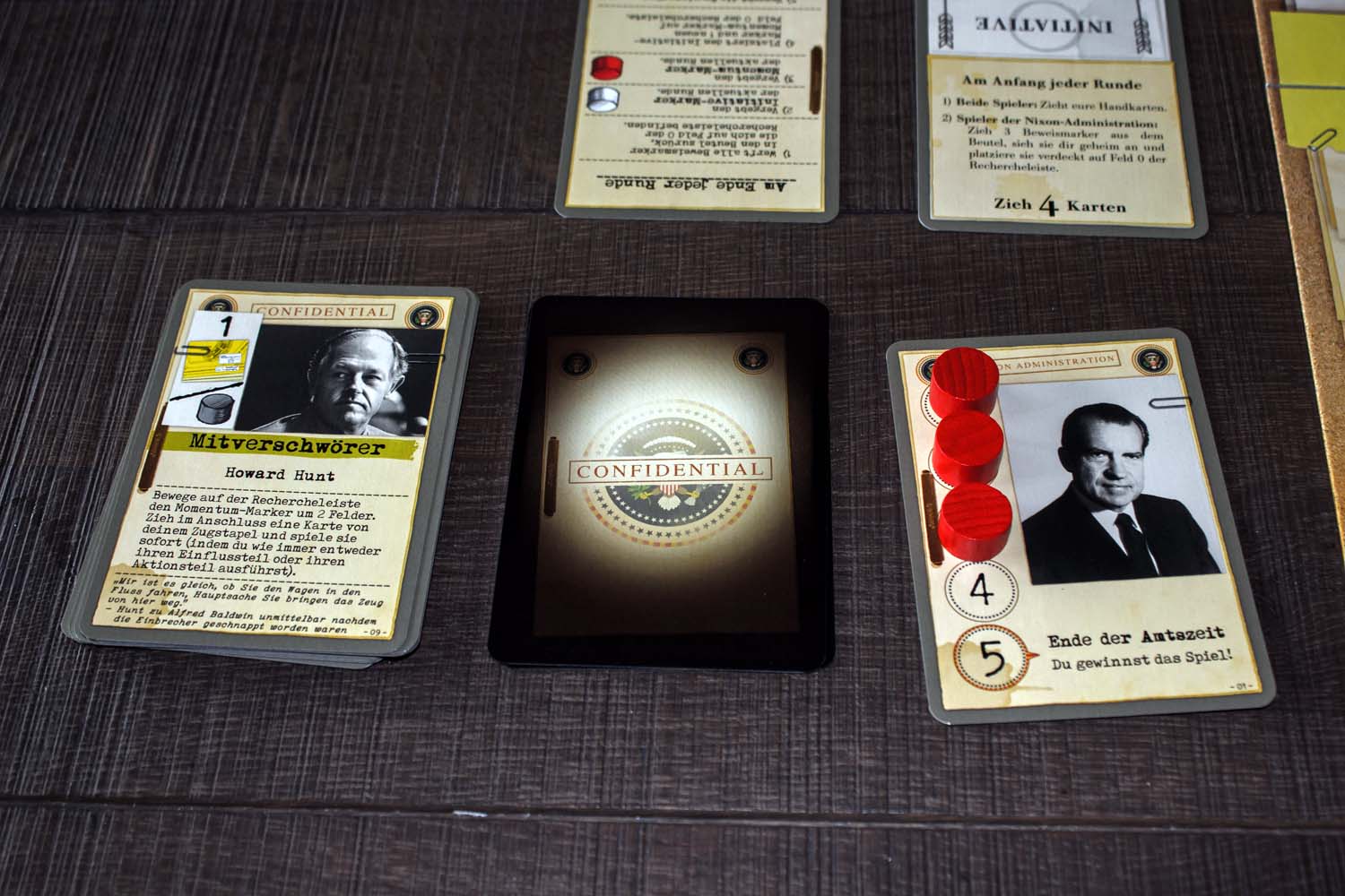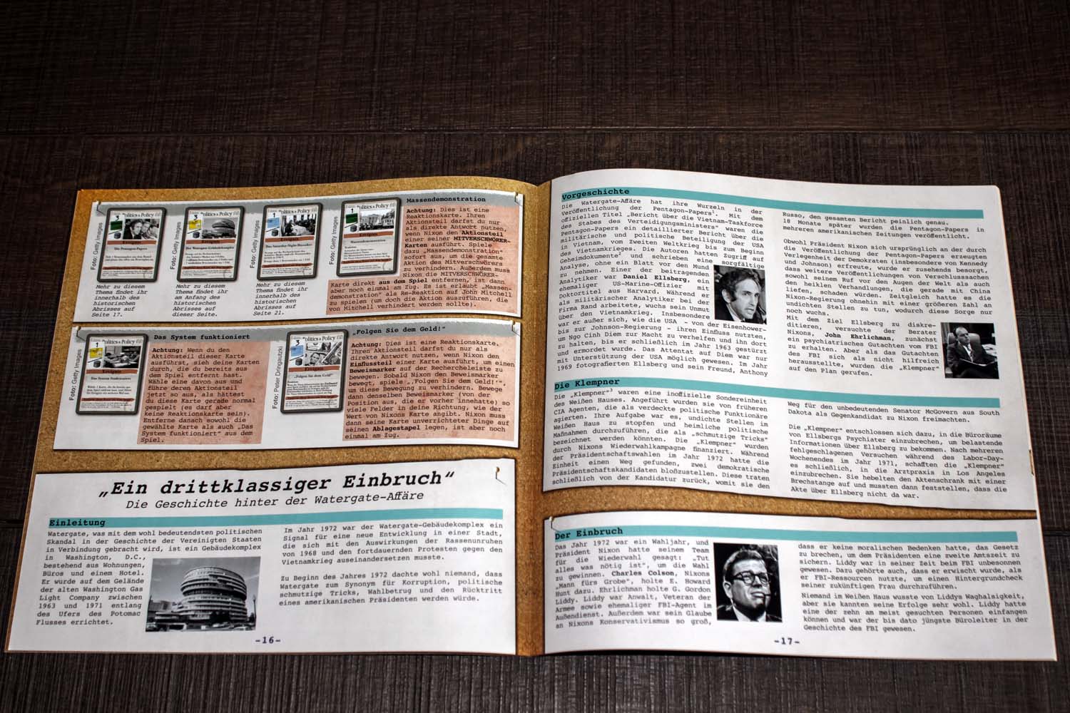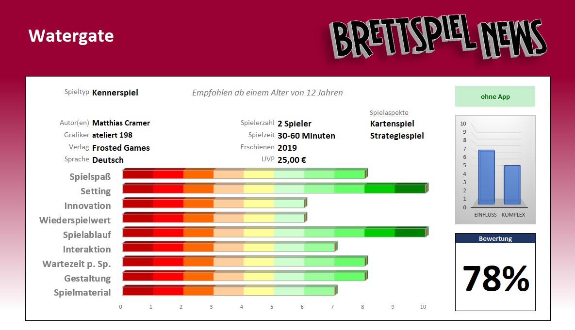 Mit sehr eingängigen Regeln und komplett unterschiedlichen Kartendecks für jeden der beiden Kontrahenten im Spiel, vermag es Watergate mit jeder spannungsgeladenen Partie erneut, Geschichte erlebbar zu machen. Neben der kurzen Anleitung gibt es wieder einen langen Geschichtsteil, der die gesamte Affäre ausführlich erläutert und all die Personen, die darin mit verwickelt sind, aufzeigt.