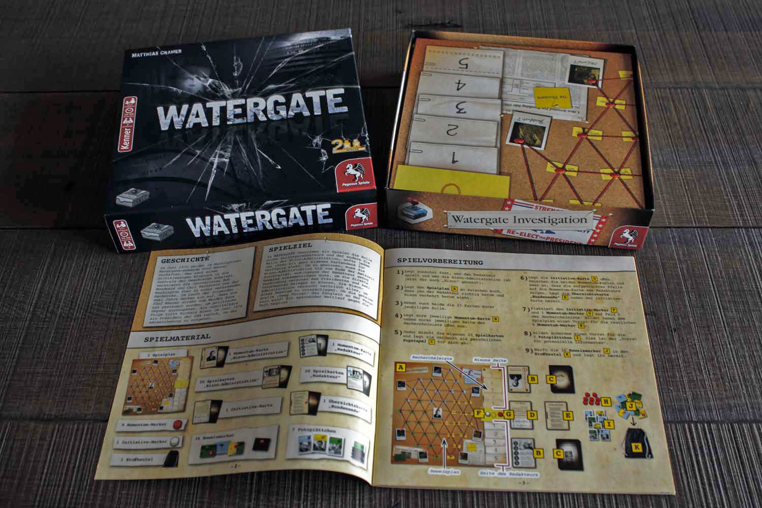 Watergate ist ein spielerischer Leckerbissen mit taktischen und strategischen Elementen von Erfolgsautor Matthias Cramer und authentisch illustriert von Klemens Franz mit echten Fotografien aus der Zeit. 2 Spieler können hier in 45 Minuten einen geschichtsträchtigen Skandal nachspielen oder die Geschichte neu schreiben.