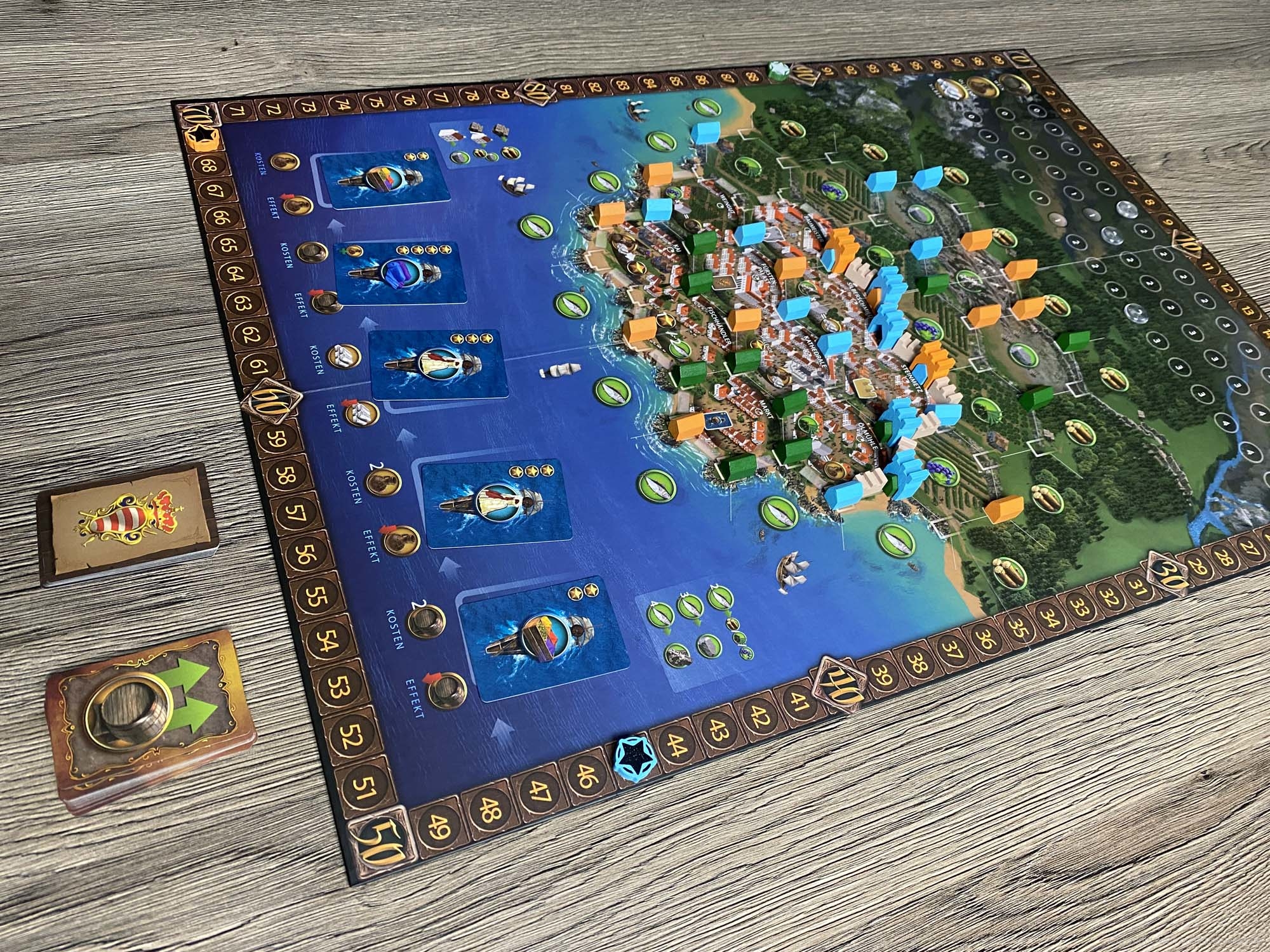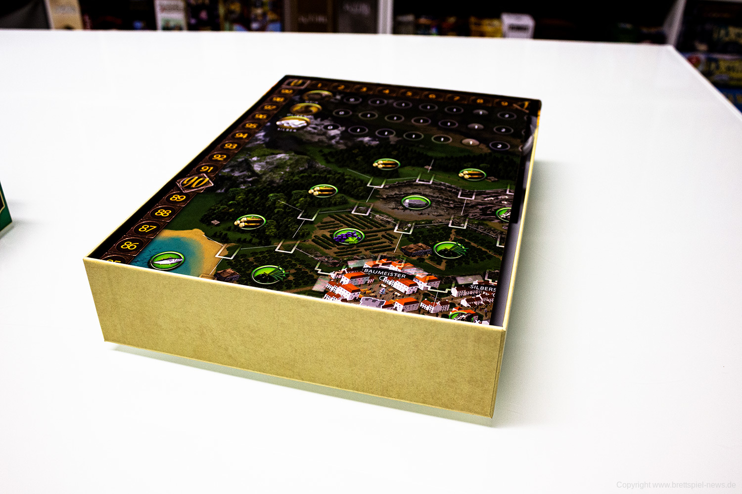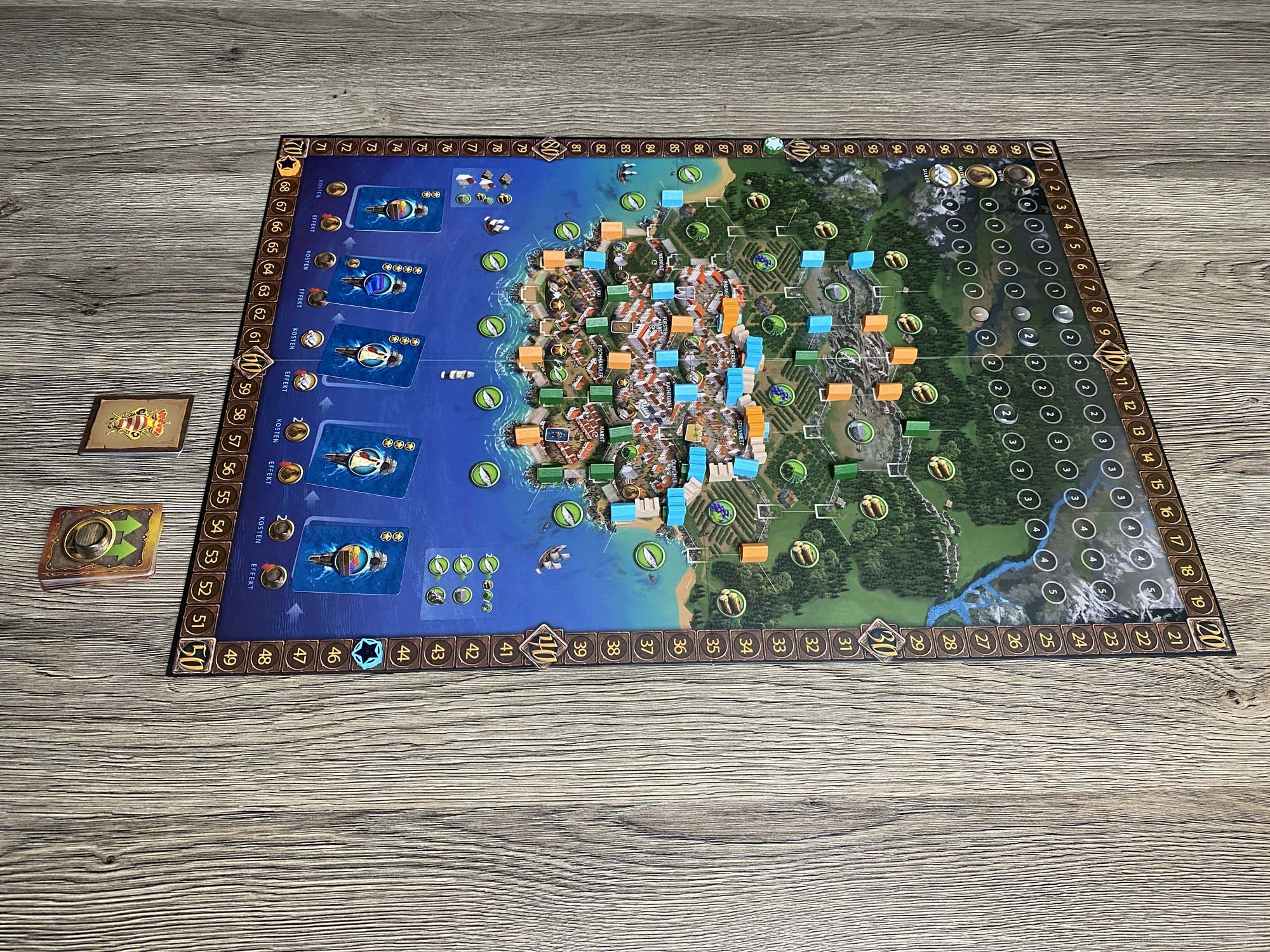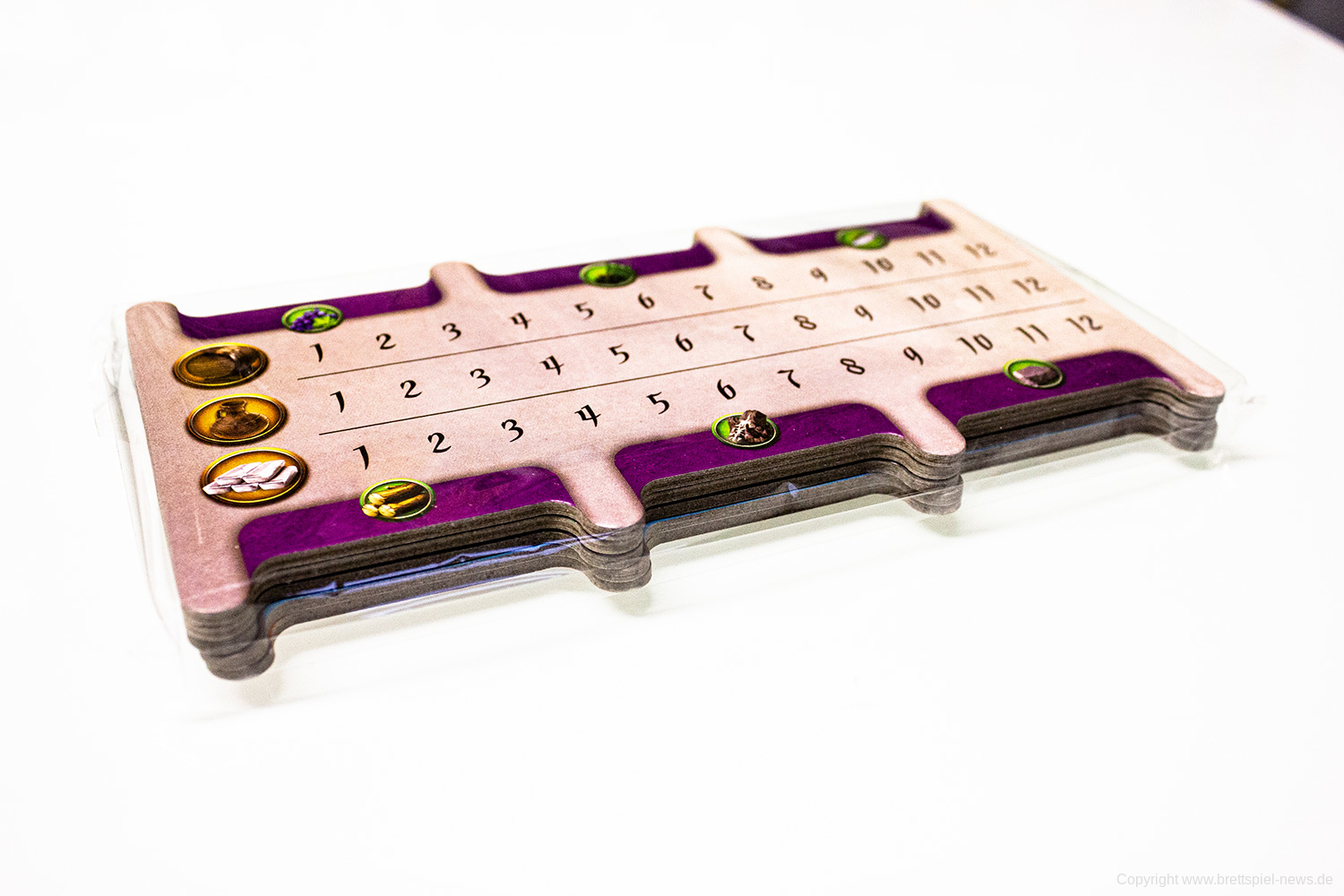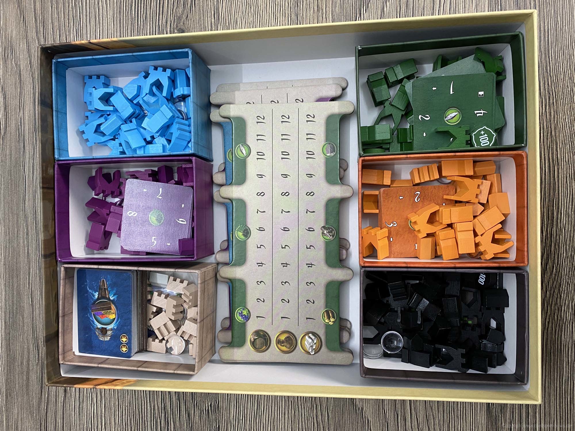 Ursprünglich war das Spiel für den Herbst 2019 gedacht, wurde nun aber schon wesentlich früher geliefert. Der erste Eindruck des Spielmaterial ist sehr gut. Alles sieht hübsch aus und fühlt sich gut an. Zudem ist das Inlay umweltfreundlicher aus Pappe gefertigt und farblich gekennzeichnet. Eine optimale Lösung! Die Karten sehen hübsch aus, was auch für den Spielplan gilt.